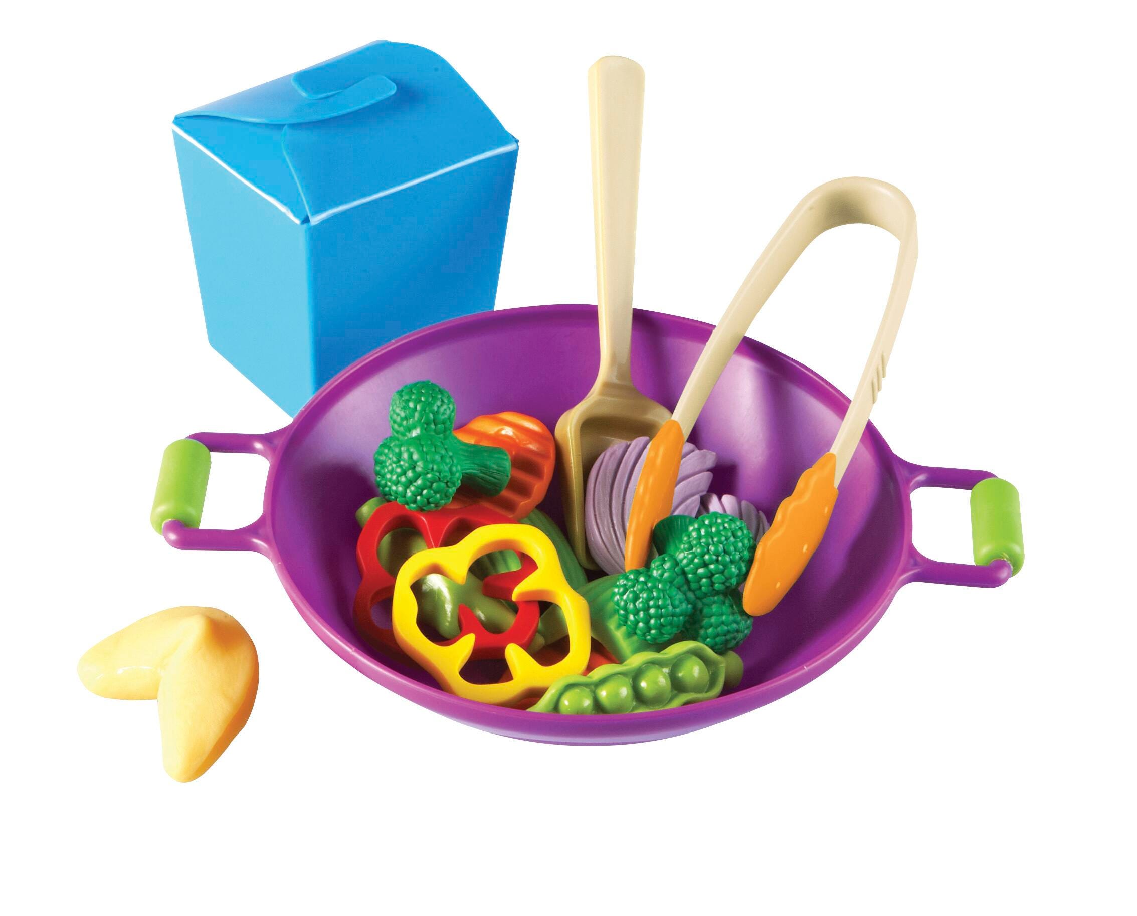 Description This set features a wok and a convenient to-go container once the meal is ready. Kids will love stirring up their imagination with realistic and colorful veggies, like peapods, carrots, broccoli, peppers, celery, and onions. This Asian inspired meal wouldn't be complete without a fortune cookie. Perfect for the young, aspiring chef or kids that just love to cook. The wok measures 7 inches. Created for toddlers ages 18 months and up.Includes: 1 Wok 1 Pair of Tongs 1 Spatula 1 To-Go Container 2 Peapods 2 Carrots 2 Broccoli 2 Peppers 2 Celery Chunks 2 Onions 1 Fortune Cookie