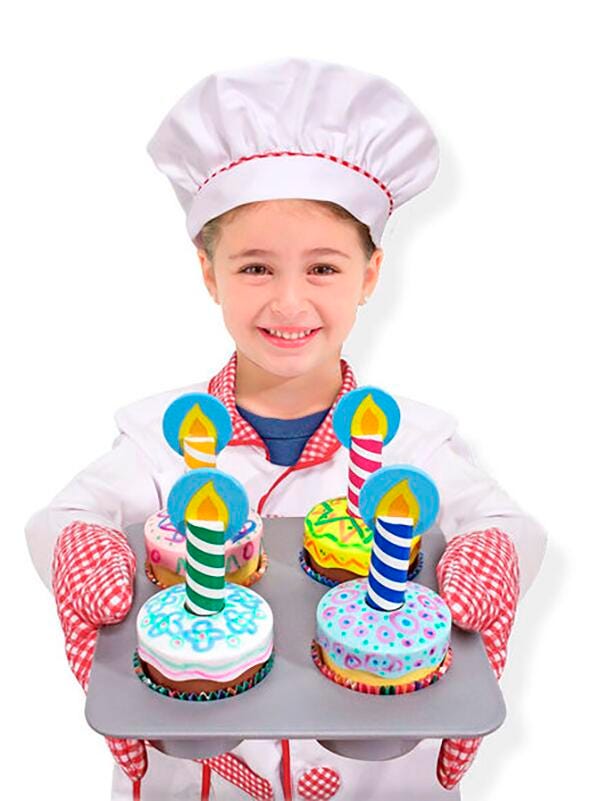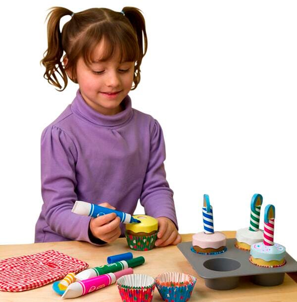 Description Your little bakers will have a blast baking cupcakes as fast as they can with this darling decorating set! This wooden bake and decorate set has 3 dry-erase markers shaped like icing tubes to decorate the smooth, removable, wipe-off cupcake tops. With colorful baking cupcake sleeves and decorative wooden candles, these cute cupcakes will be the hit of playtime birthday and tea parties! Designed for ages 3 and up.Features Encourages hand-eye coordination and imaginative play An excellent introduction to creative pretend kitchen play Built with durable, high-quality materials for safety and longevity Develops and encourages artistic abilities Includes: 4 Cupcakes 4 Cupcake Tops 8 Cupcake Sleeves 4 Candles 1 Baking Tray1 Oven Mitt