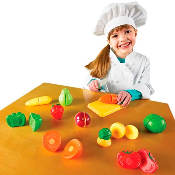 Build fine motor skills by using both hands to hold the fruit steady and use the pretend knife to slice the fruits and veggies.