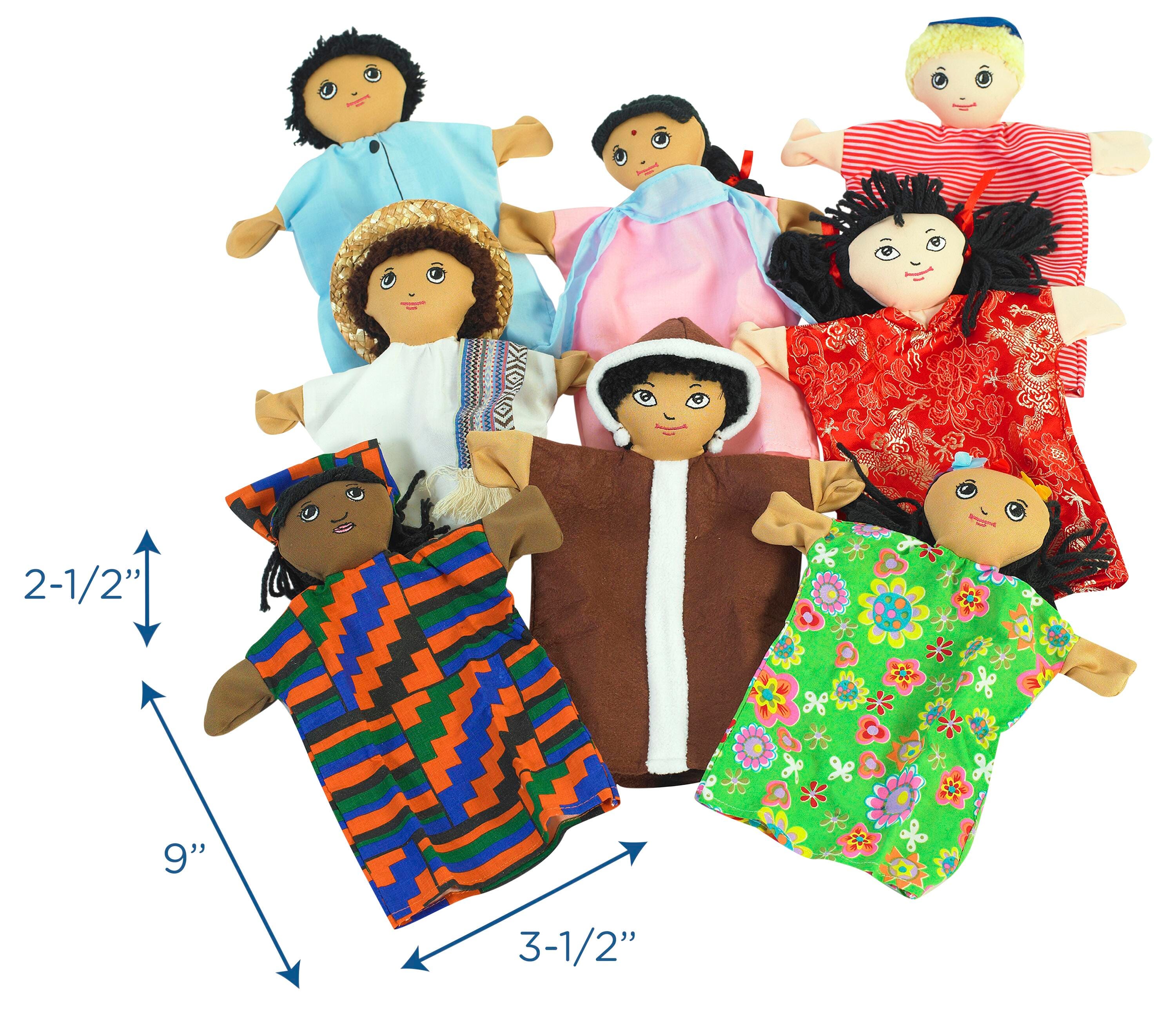 Hands-on fun for everyone! These soft puppets (dressed in authentic cultural clothing and well-crafted facial features) offer an interactive way to discuss various traditions, dress wear, languages, and multi-ethnicity in a fun and safe space. Educators can use this set to help students appreciate and learn more about the languages, apparel, and customs shared around the world. At 9 inches tall, each puppet slips comfortably onto any sized hand and arm to be used for everyday dramatic play or educational puppet shows. All are machine washable and dryable for your convenience. Each puppet measures 9 × 3-1/2 × 2-1/2 inches. Safe for ages 3 and up. Includes 2 year manufacturer warranty.Features