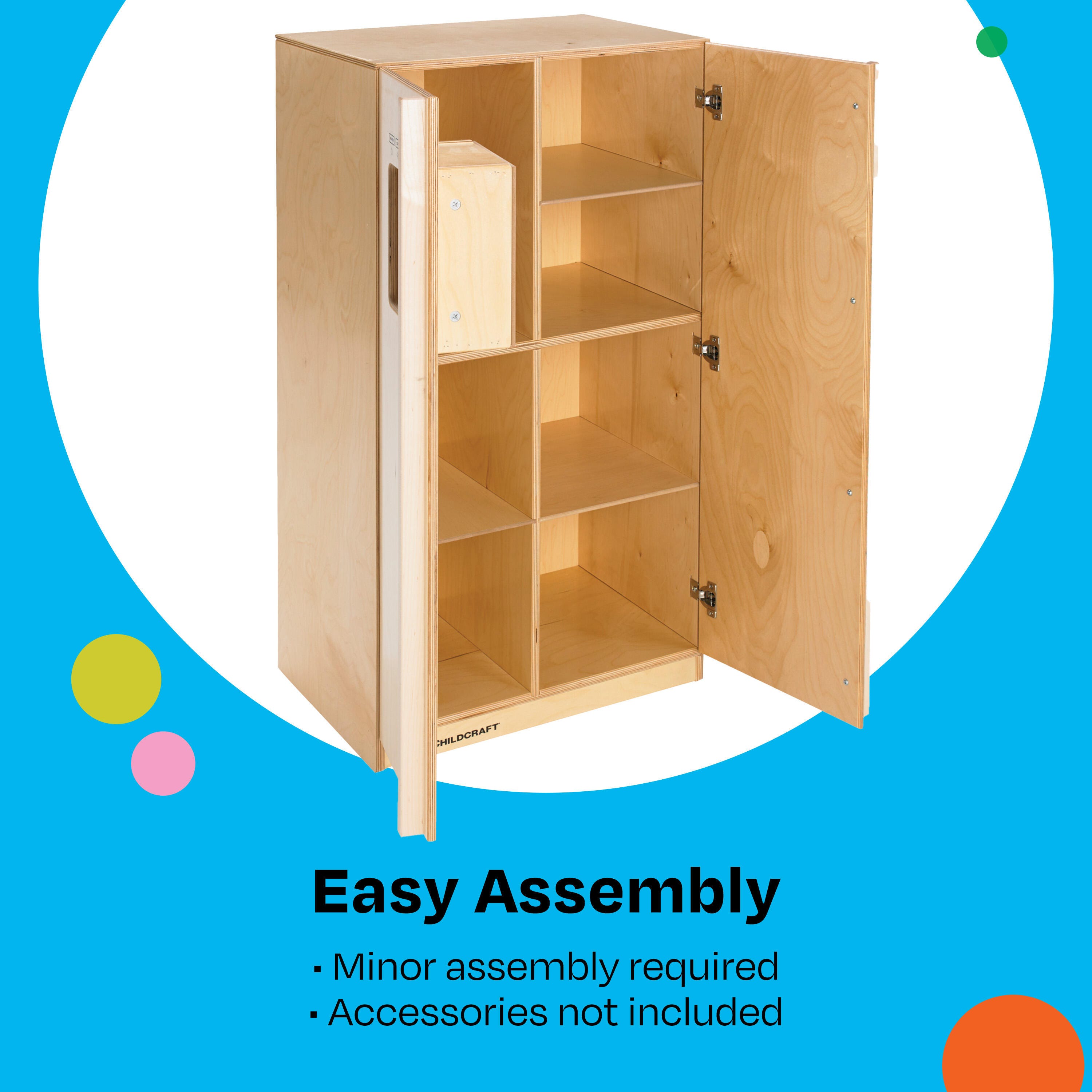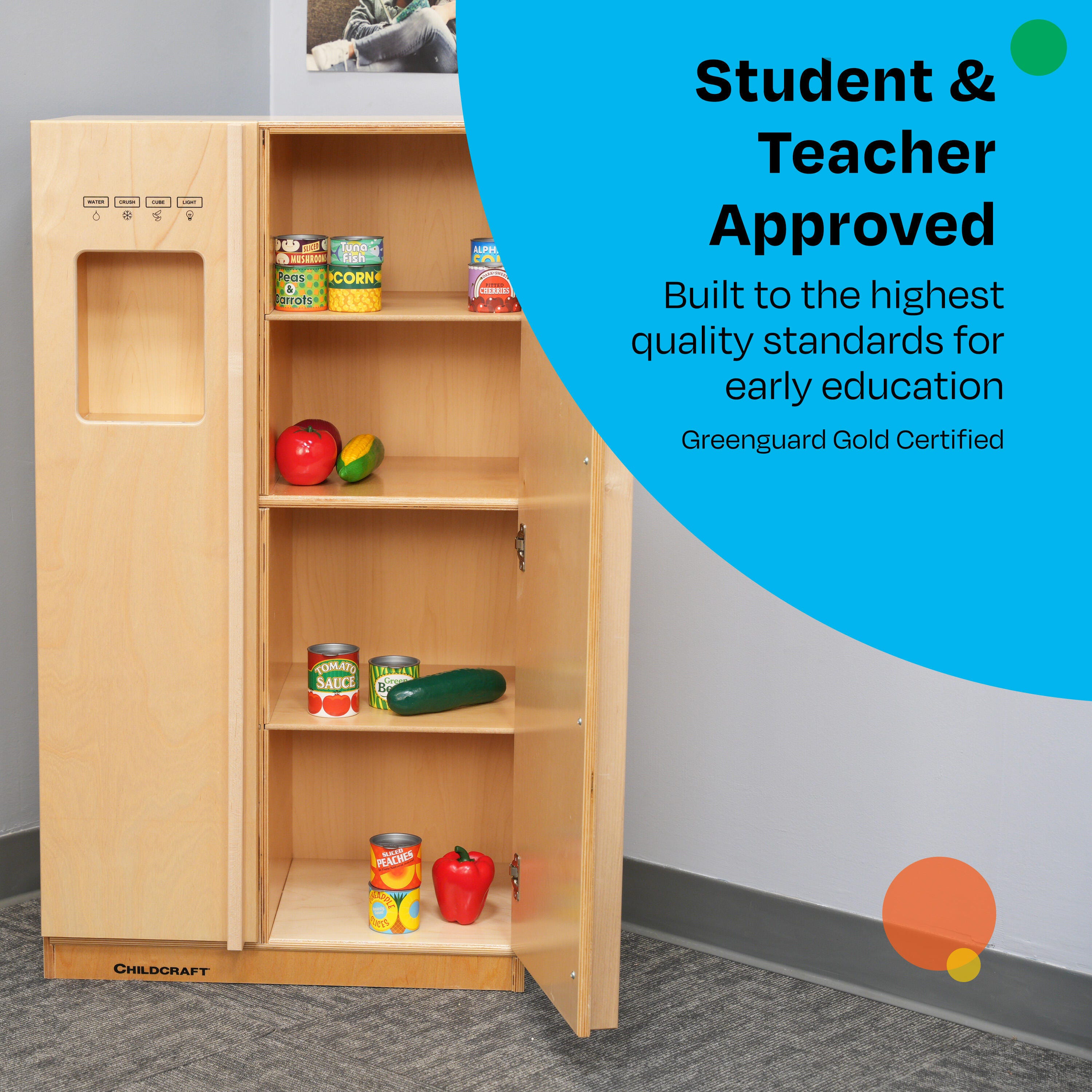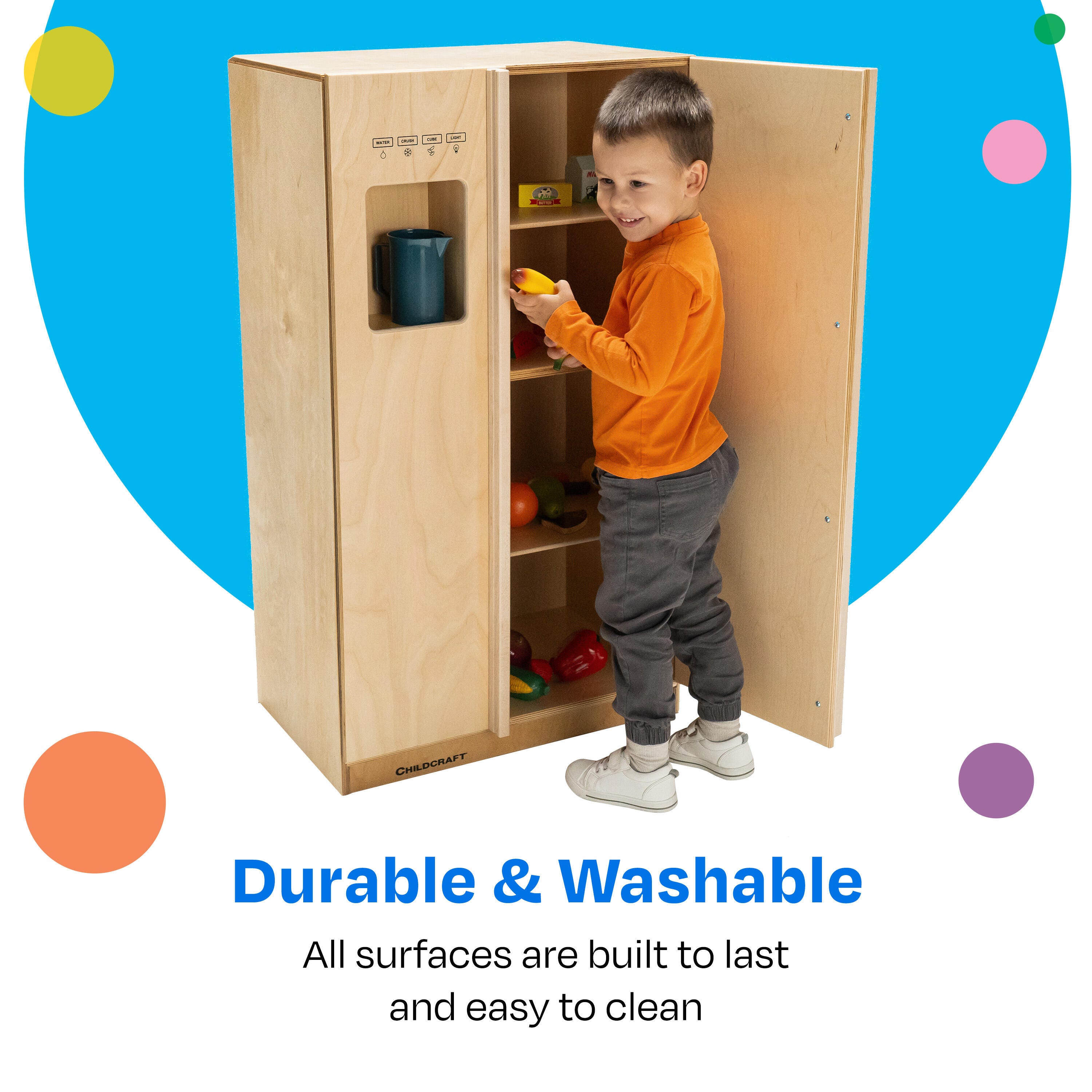 This Childcraft® Modern Kitchen Refrigerator Toy features shelves, slim handles, and a realistic ice/water dispenser on the door. Made with a durable design for young children, the wooden refrigerator adds a realistic feel to any dramatic play area in schools, childcare centers, and homes. Assembly is required, and the fridge comes in a stylish, minimal design. There are no exposed fasteners, and our play refrigerator is crafted in a high-quality design with dado and rabbet construction featuring a four-coat UV acrylic finish. This item comes with a lifetime guarantee against manufacturing defects.