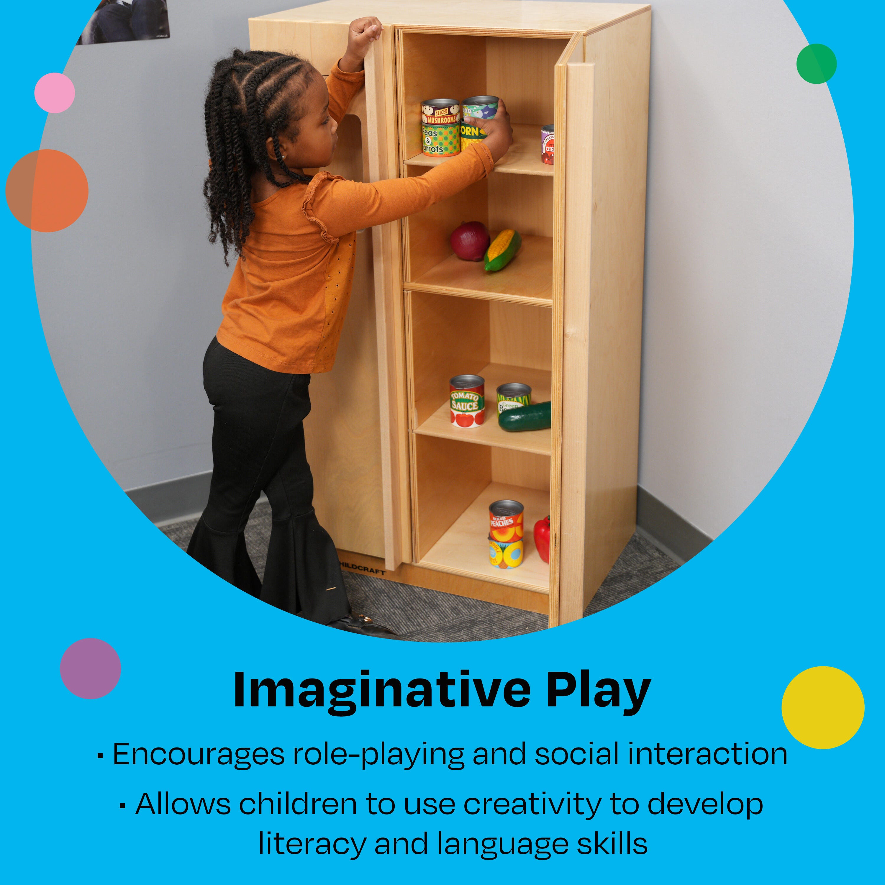 Divided compartment shelves are perfect for storing play food and learning about proper food care for young users