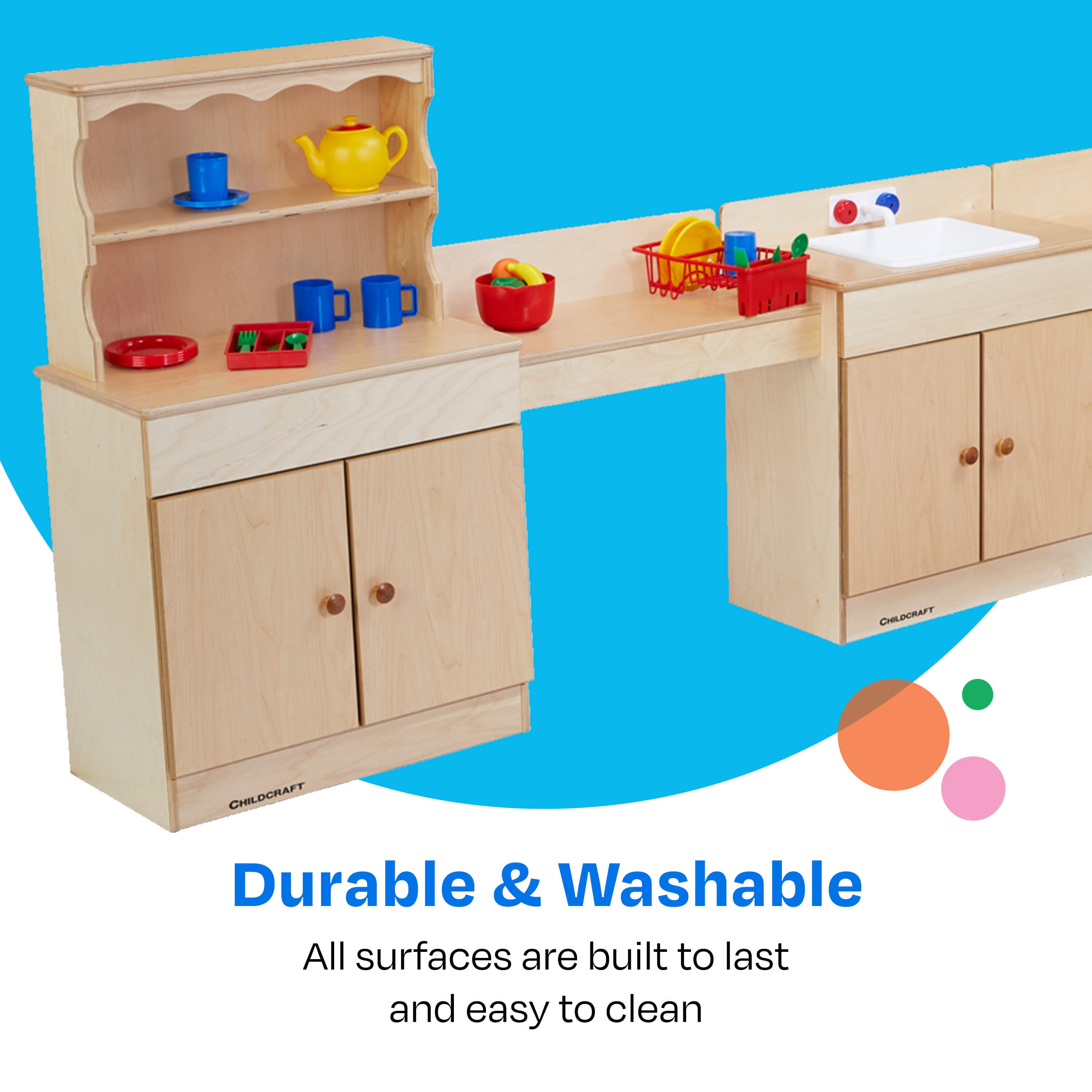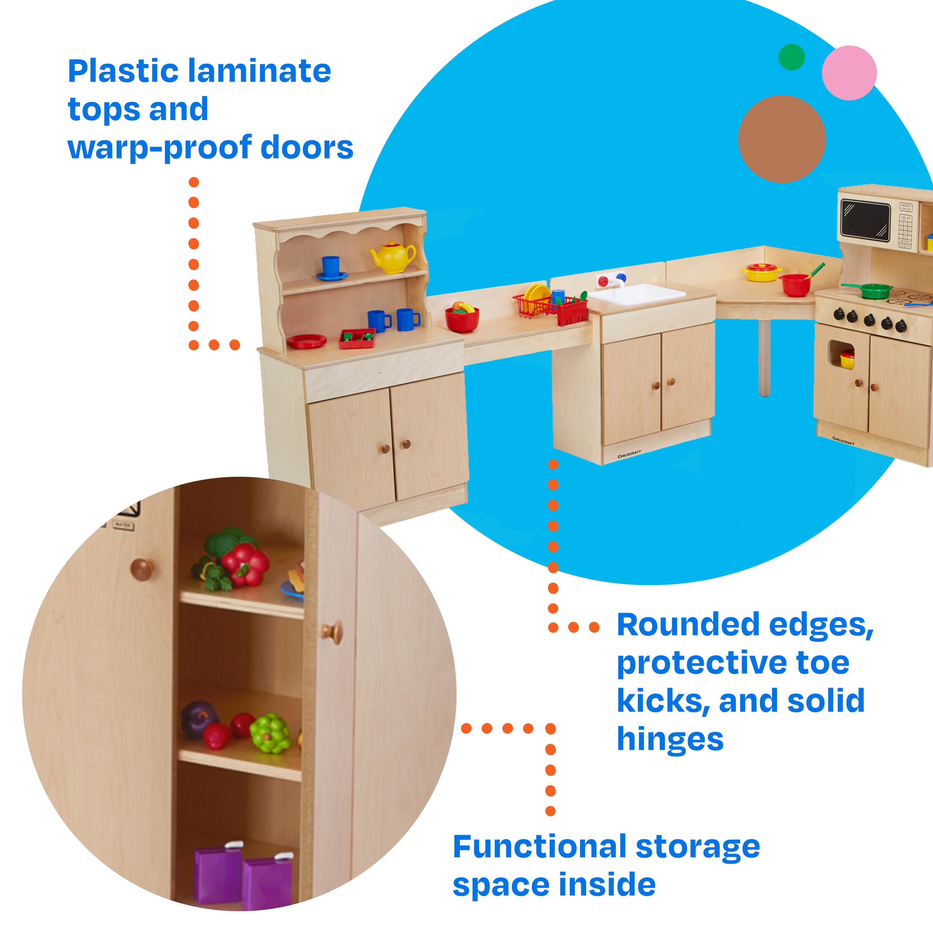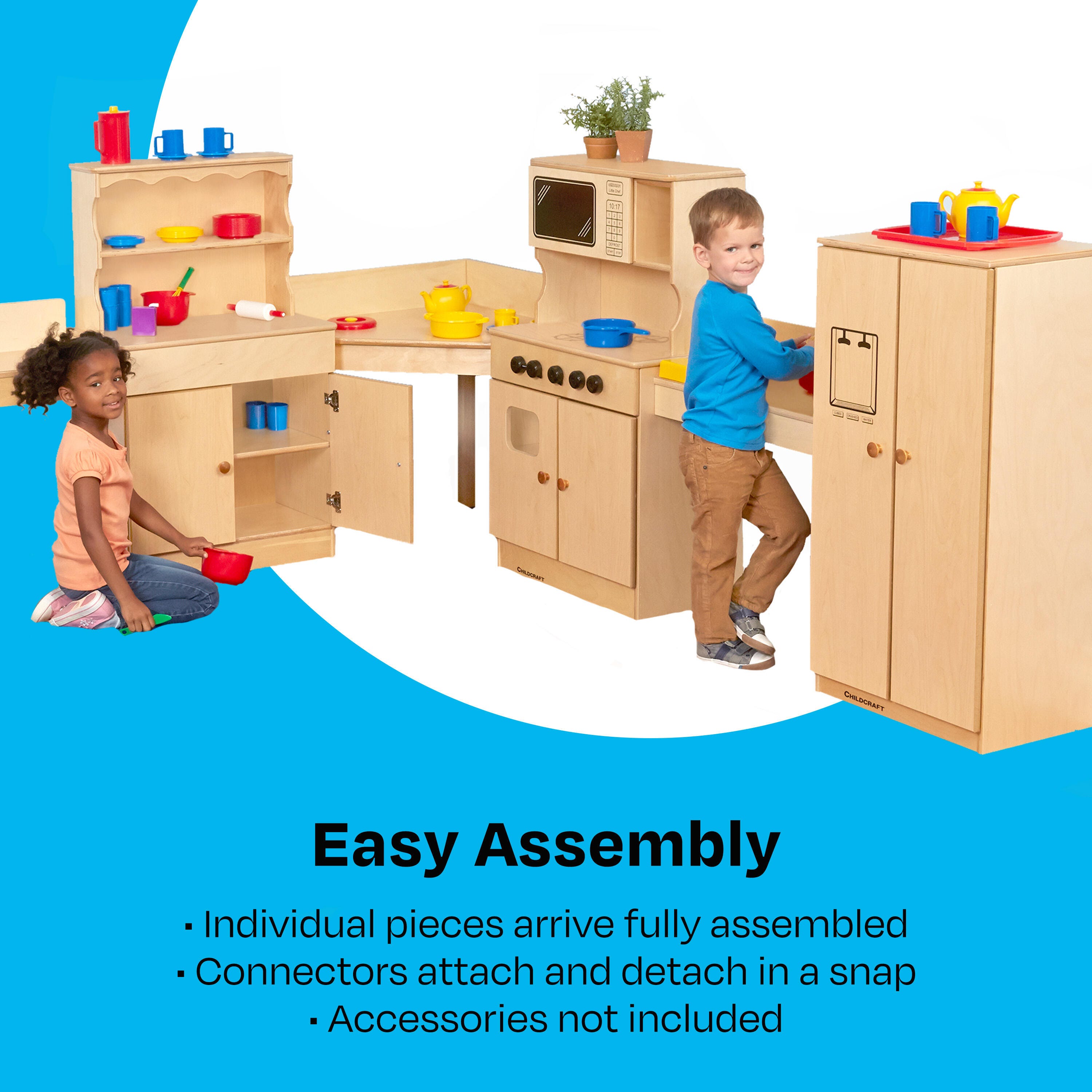 This full kitchen play set has protective toe kicks, rounded edges, and solid hinges for added safety; durable, warp-proof doors and laminate tops for long-lasting use