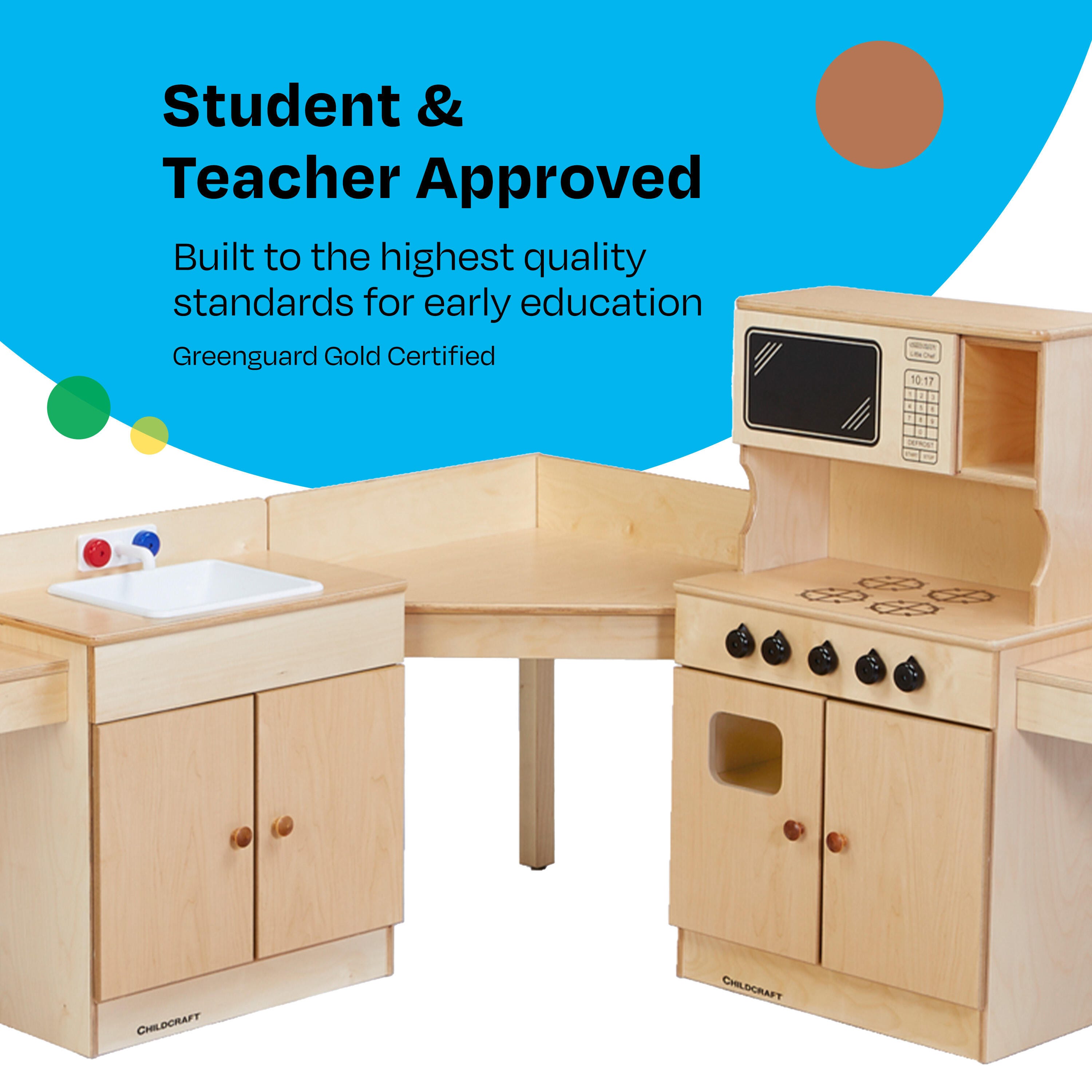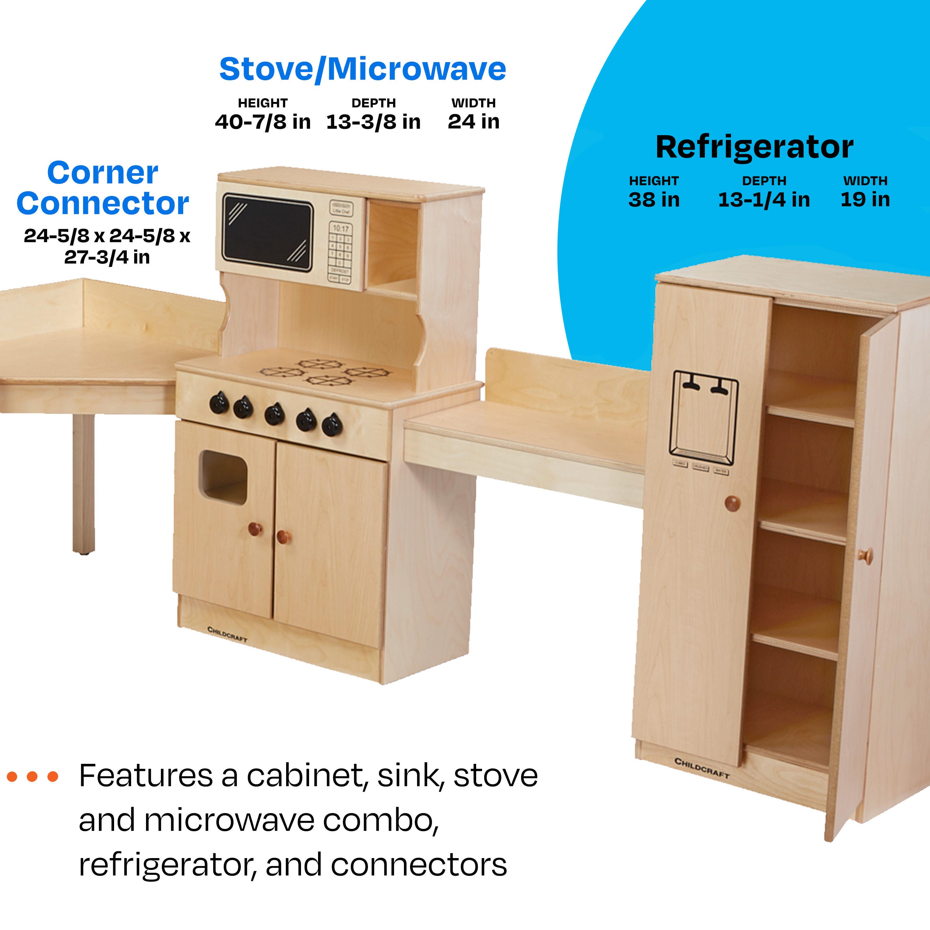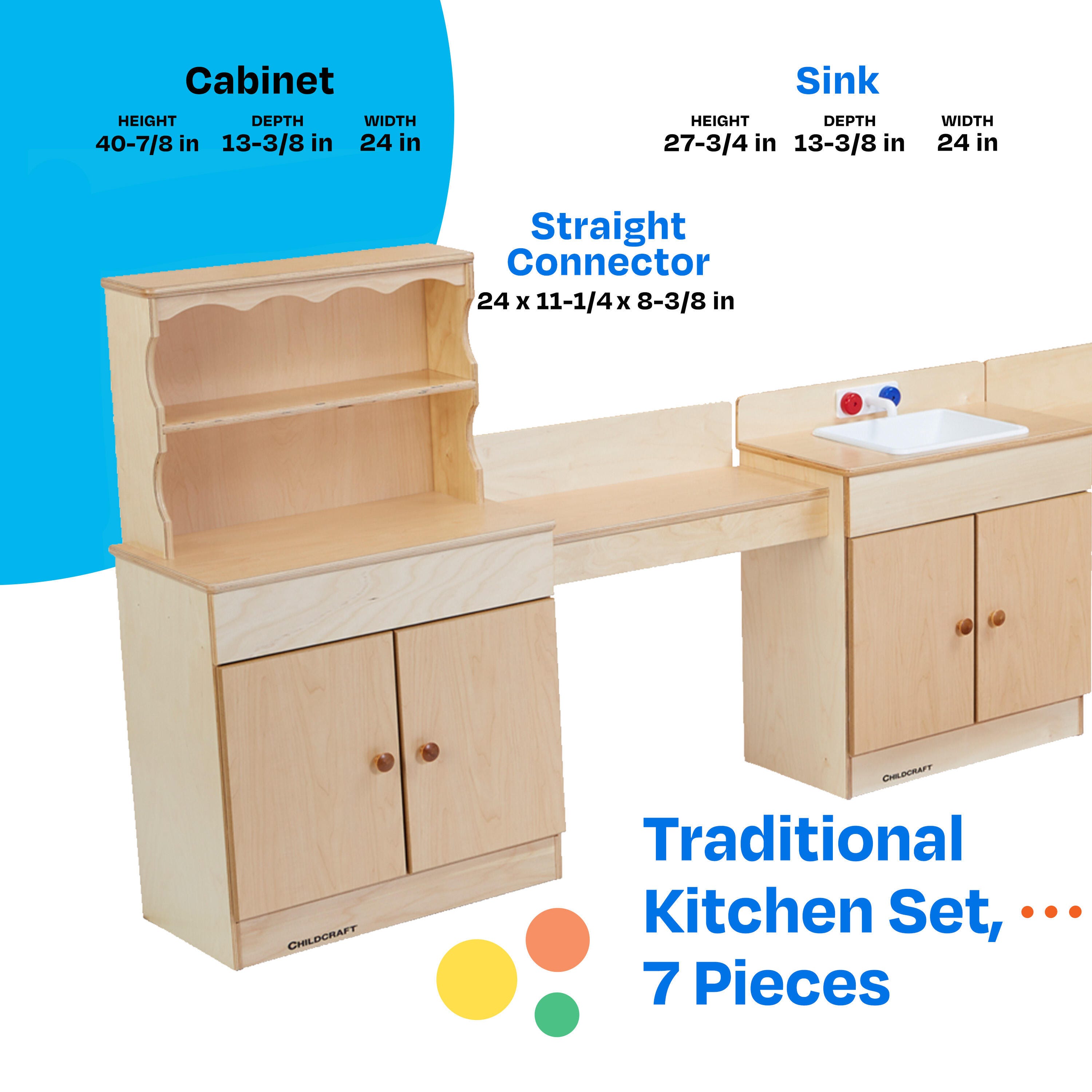 Childcraft® Traditional Kitchen Set is a 7-piece set designed for imaginative play and safe use in schools, childcare centers, and homes. The wooden play set includes a sink with simulated taps and faucet, a Dutch cabinet with a display area and spacious storage below, a microwave and stove combo, a refrigerator with separate freezer and fridge sections, and connectors. Graphics on the freezer door simulate an ice and water dispenser. The full plastic laminate tops and washable surfaces make it easy to clean and maintain. Individual units come fully assembled and simple assembly is required for the countertop connectors; all hardware is included. Sink measures 24 W x 13-3/8 D x 27-3/4 H inches; Cabinet measures 24 W x 13-3/8 D x 40-7/8 H inches; Stove and Microwave Combo measures 24 W x 13-3/8 D x 40-7/8 H inches; Refrigerator measures 19 W x 13-1/4 D x 38 H inches.