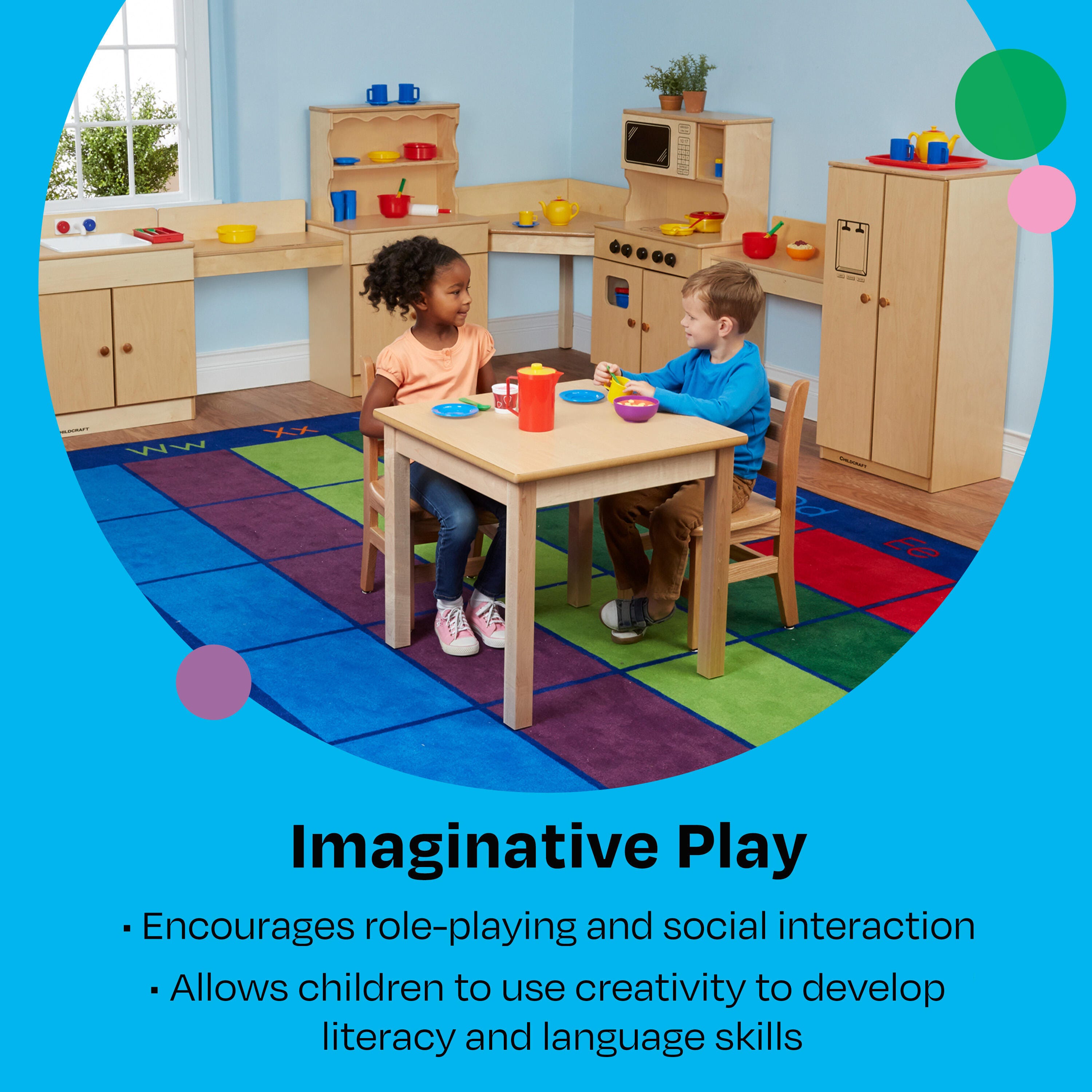 Bring the joy of imaginative play to your classroom or home with this classic kitchen play set, featuring a sink, cabinet, stove with microwave, and refrigerator.