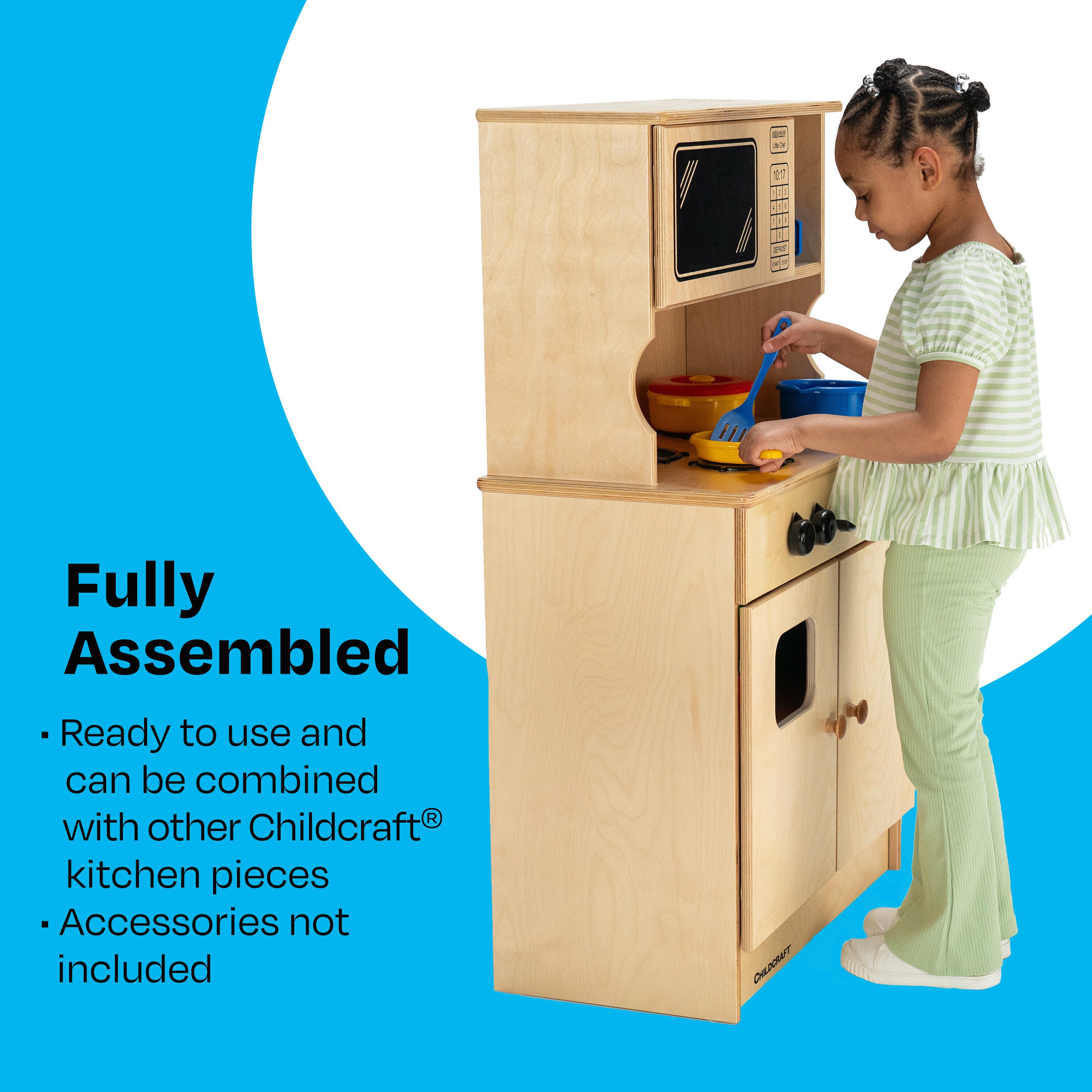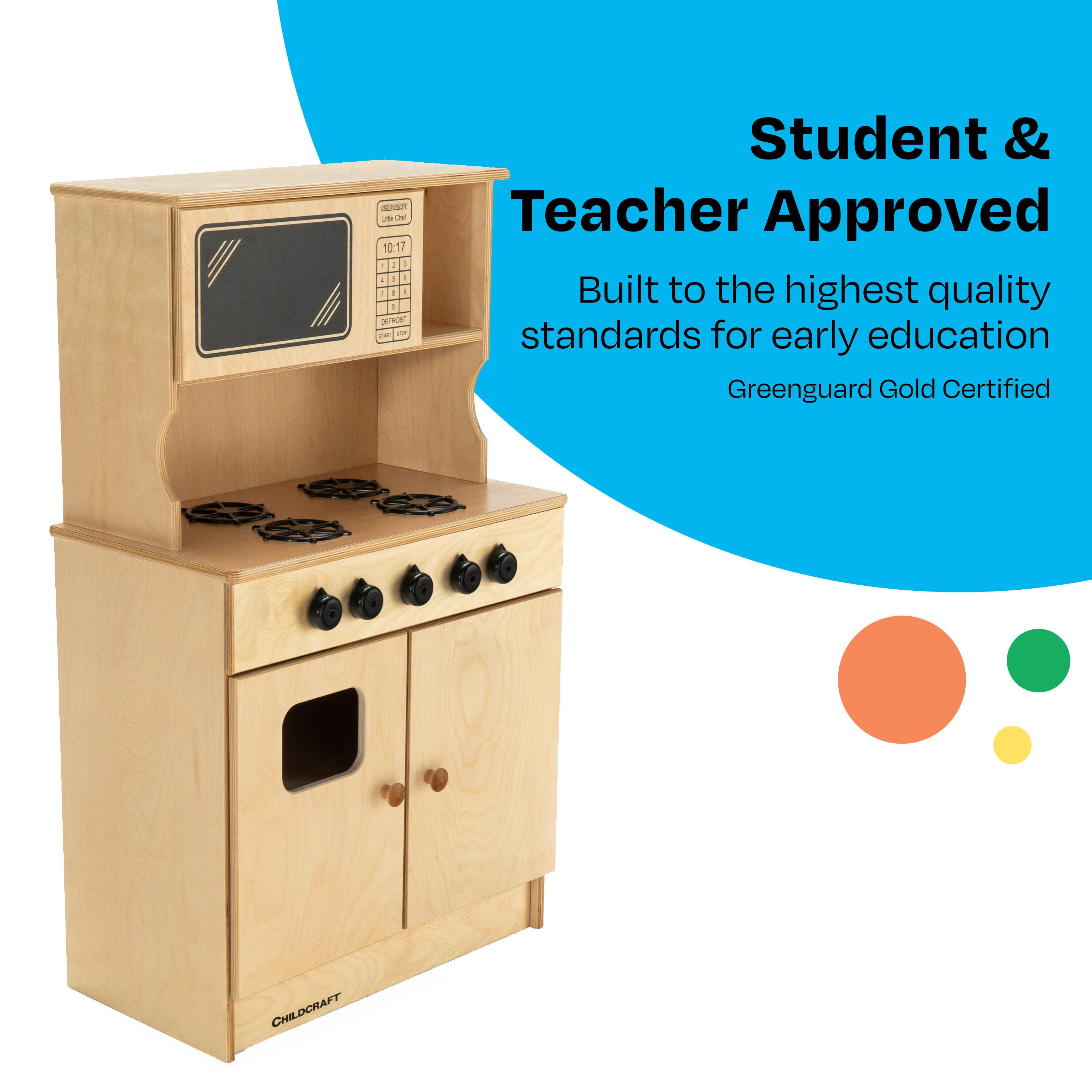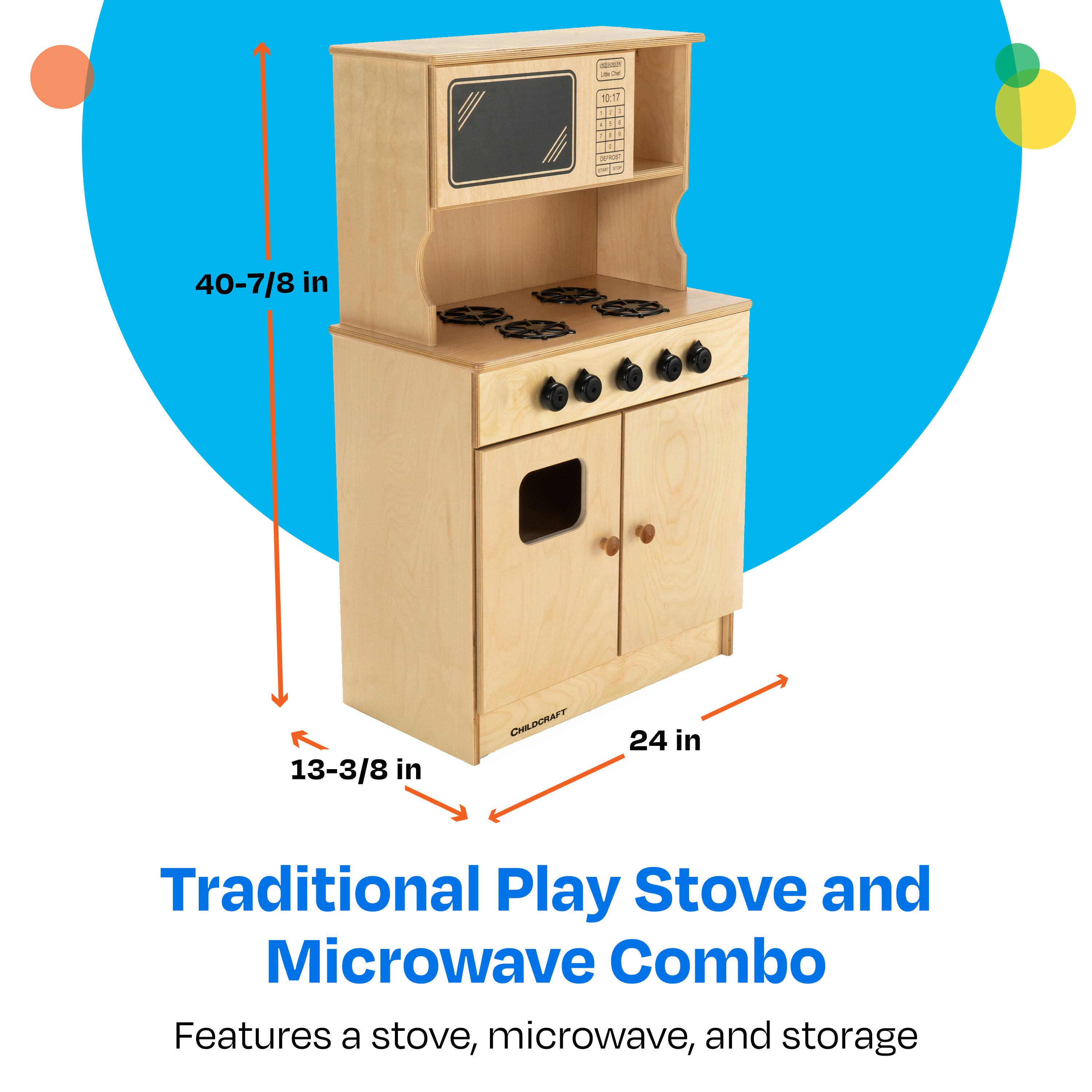 Childcraft® Traditional Play Stove and Microwave Combo is crafted for imaginative play and safe use in schools, childcare centers, and homes. The wooden play stove features four burners, working knobs, an oven with viewing window, and functional storage space inside. The full plastic laminate tops and washable surfaces make it easy to clean and maintain. Comes fully assembled, and all hardware is included. We also offer matching wooden kitchen pieces to complete your full pretend play kitchen setup. The Stove and Microwave Combo measures 24 W x 13-3/8 D x 40-7/8 H inches.