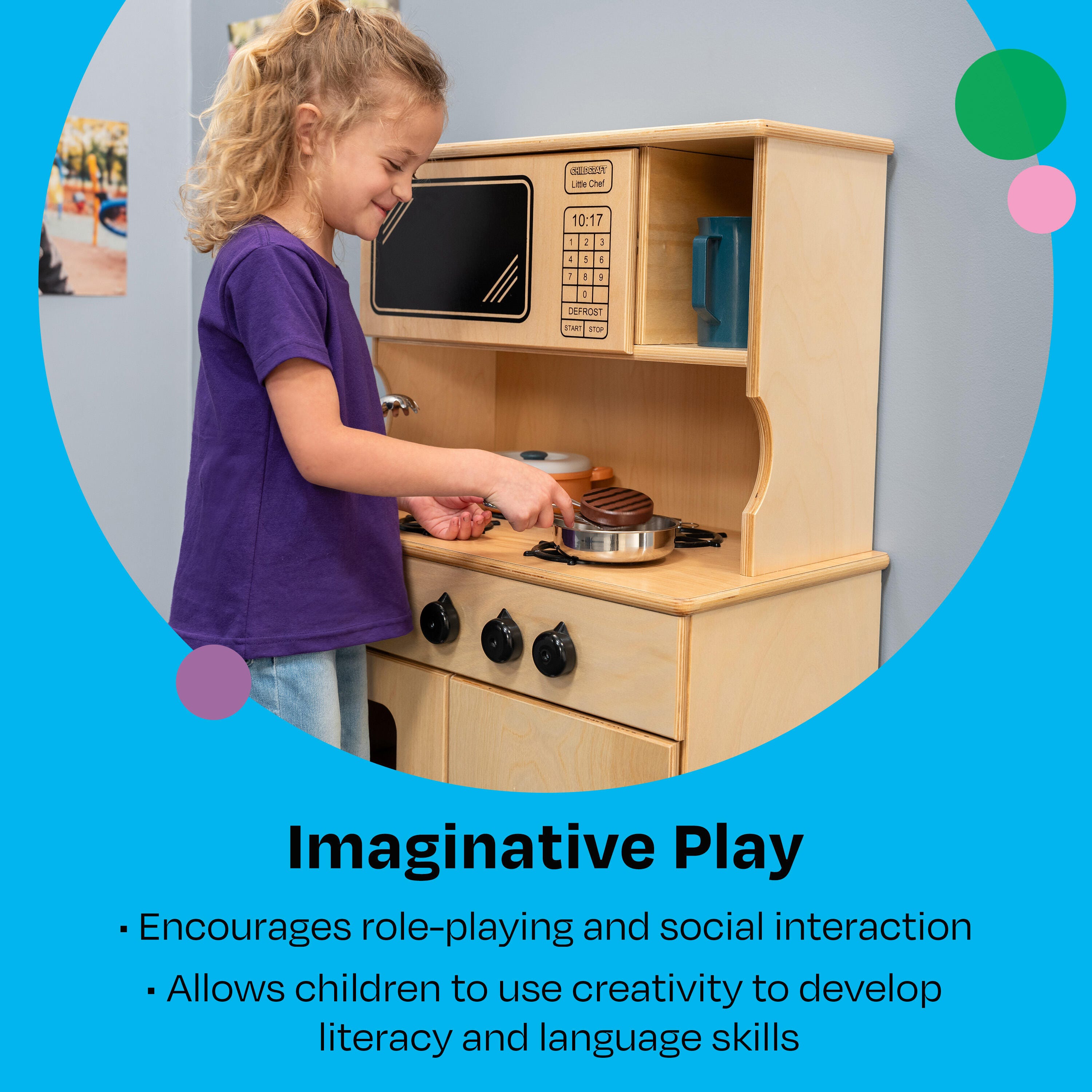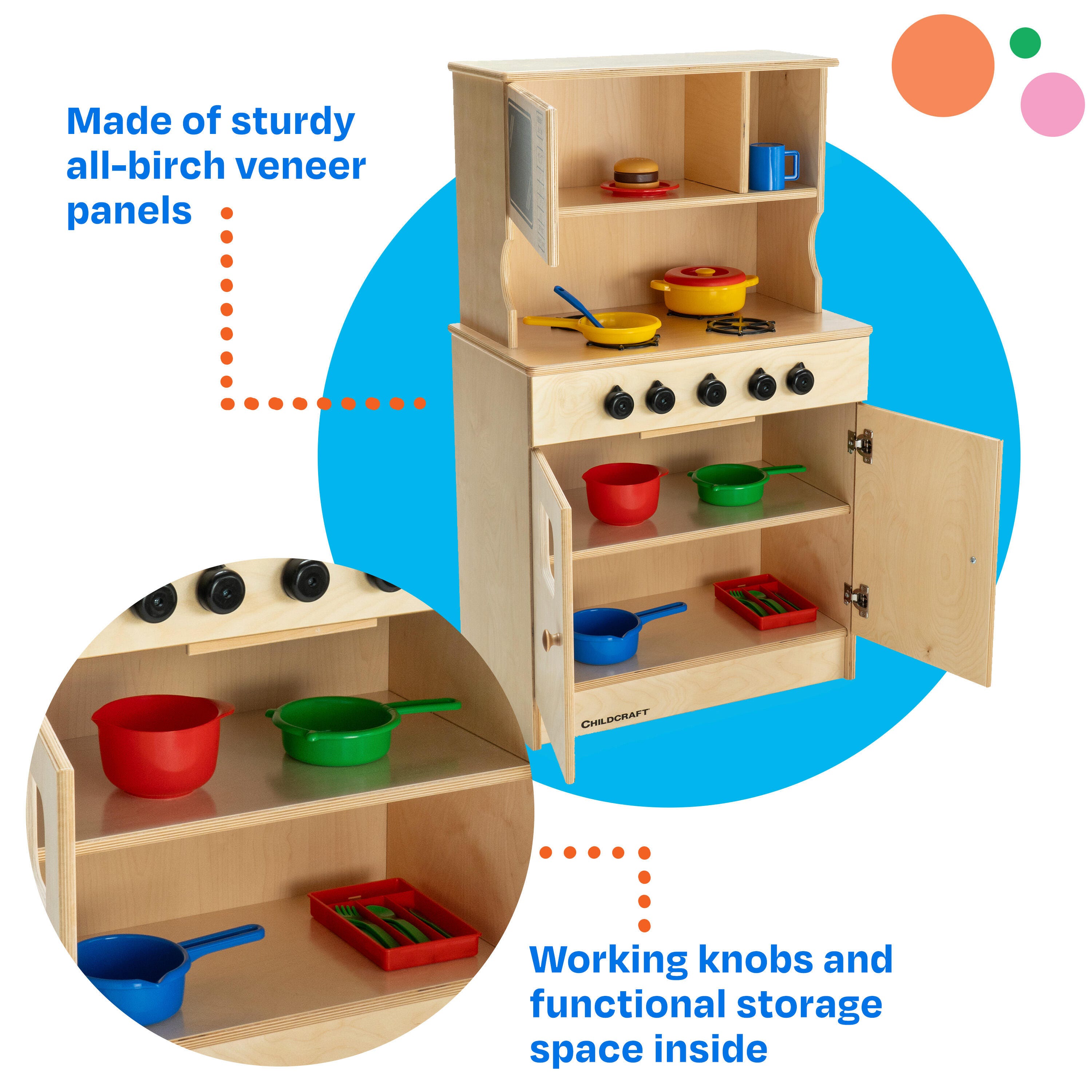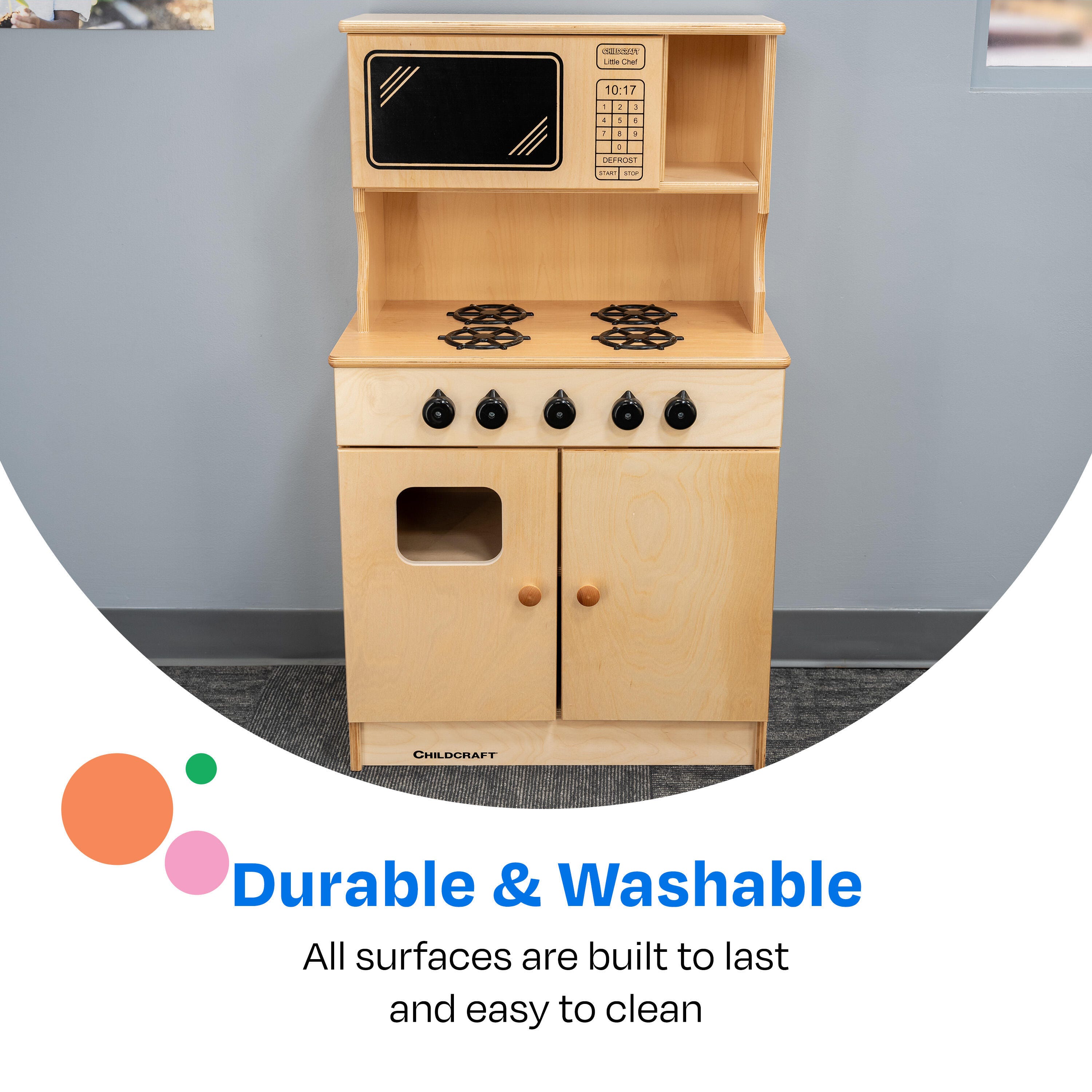 This play stove has protective toe kicks, rounded edges, and solid hinges for added safety; durable, warp-proof doors and laminate tops for long-lasting use