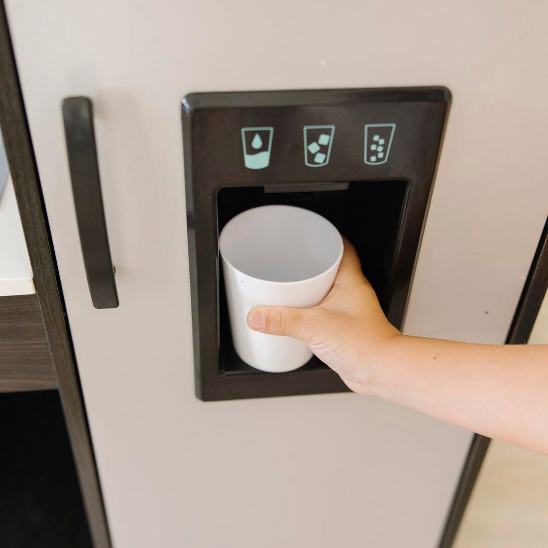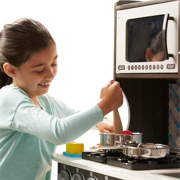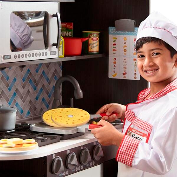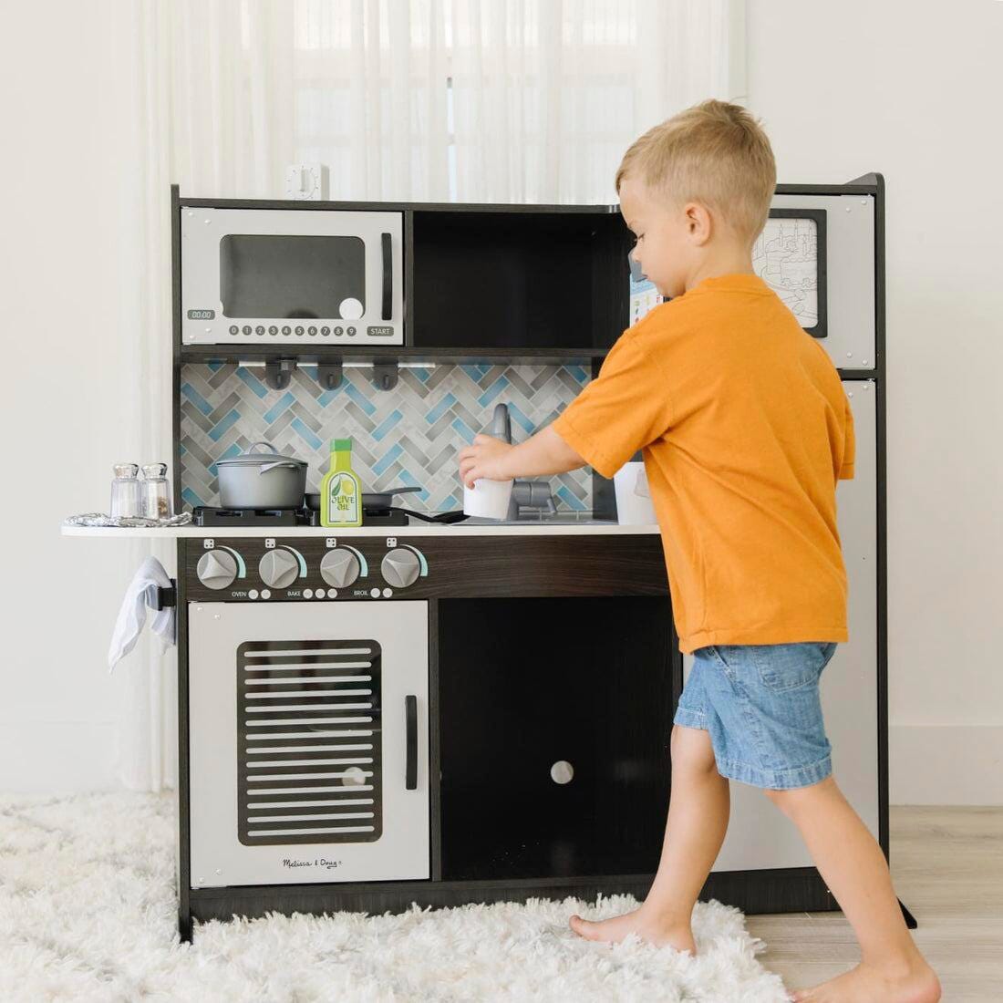 Budding young chefs can hone their craft in this beautifully designed, charcoal-colored modern play kitchen by Melissa & Doug!