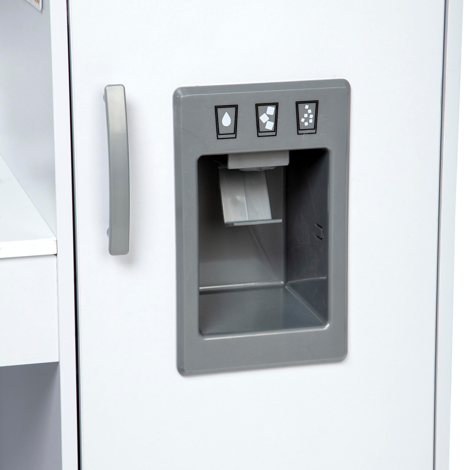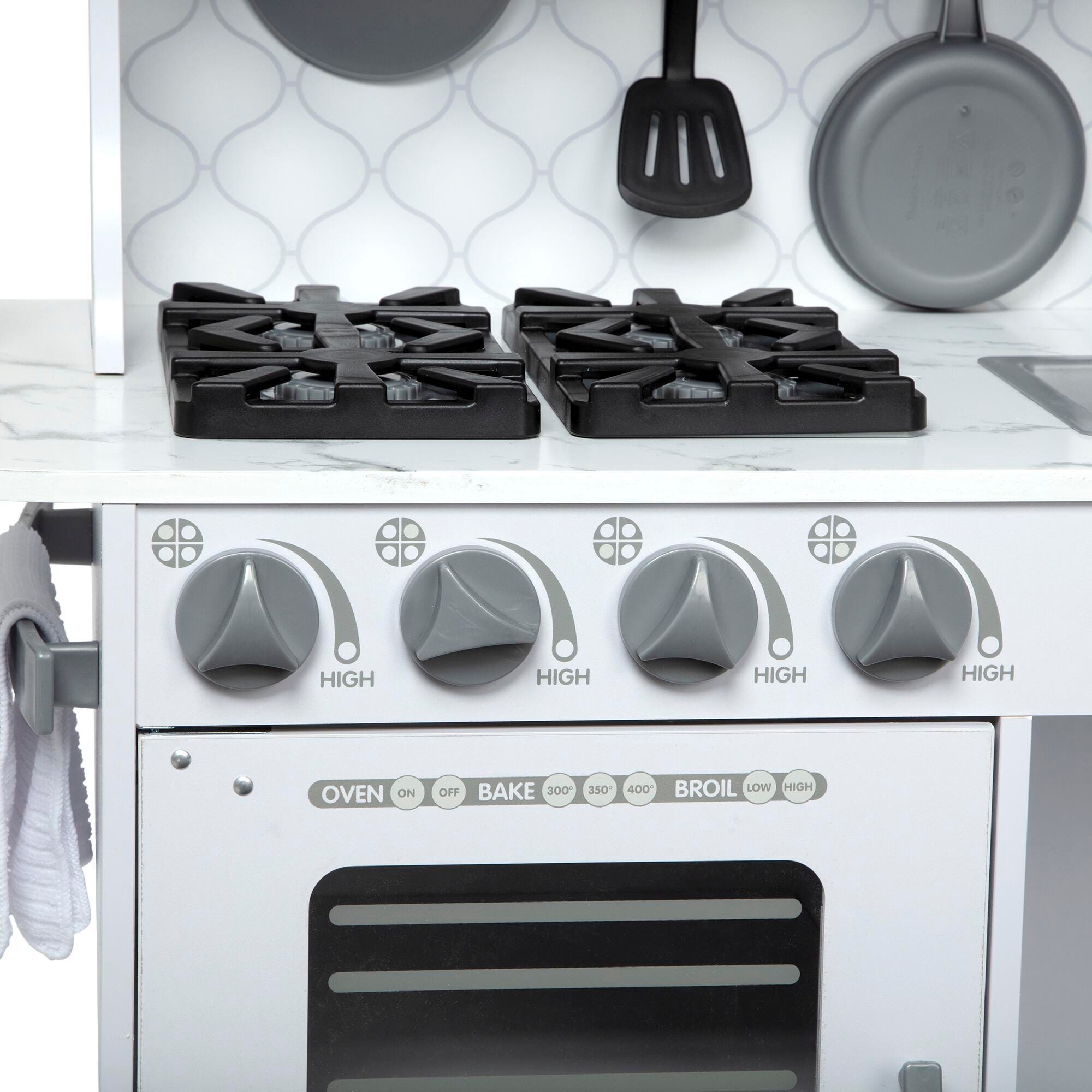 Easy to assemble white marble-colored wooden modern play kitchen - roomy enough for multiple children to play at once
