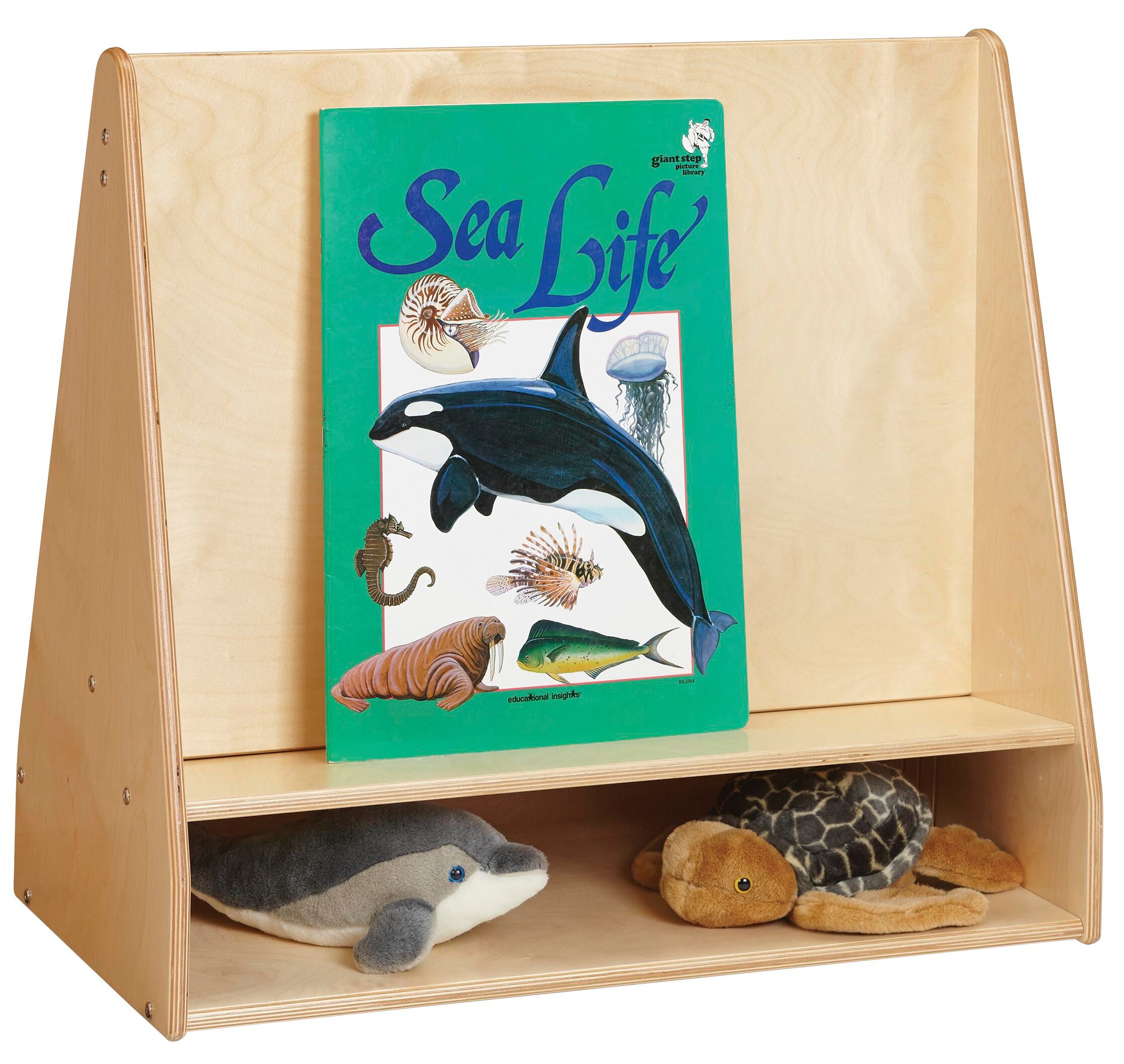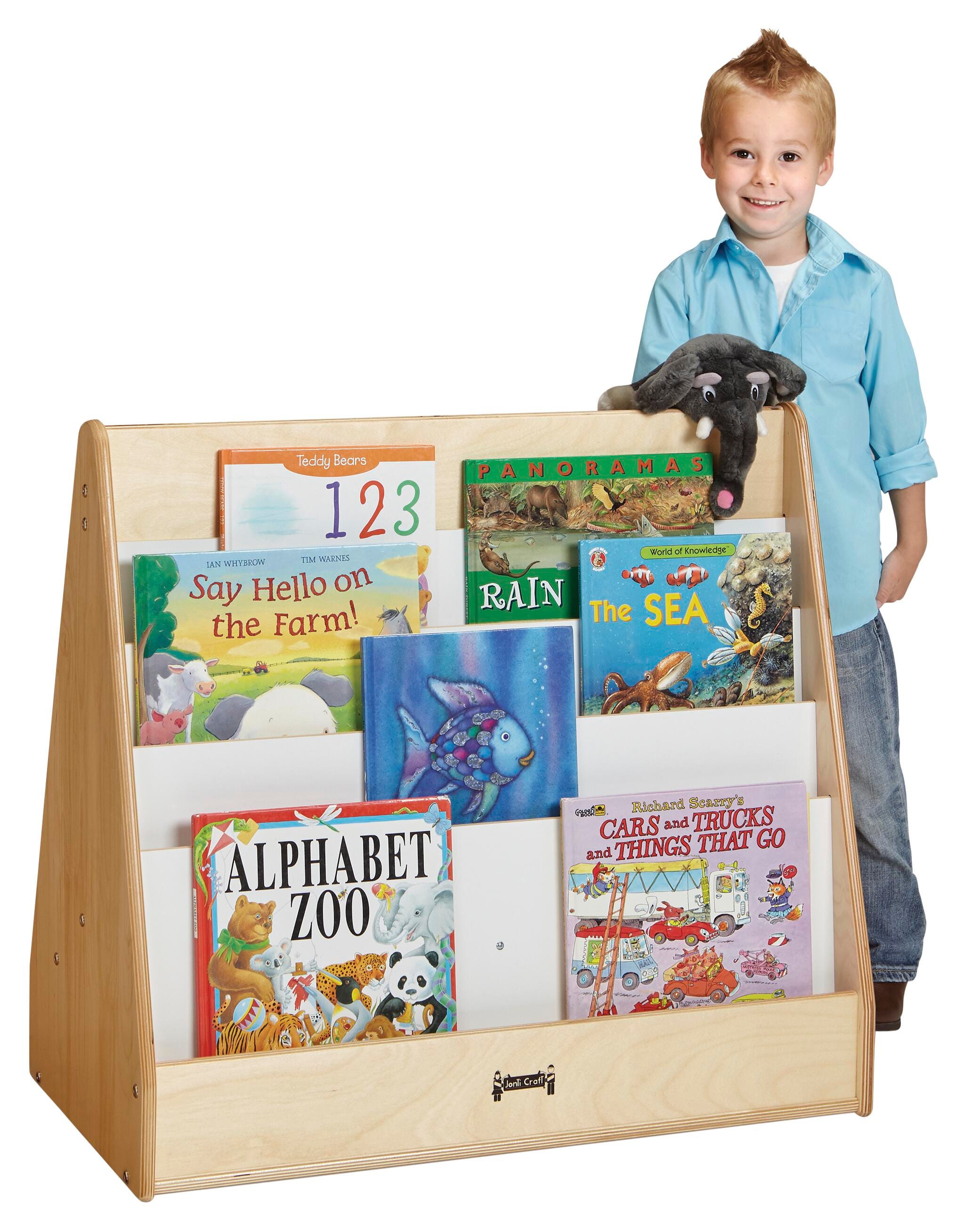 Jonti-Craft Birch One-Sided Book Stand measuring 30 W x 16-1/2 D x 27-1/2 H inches has four shelves and is made from plywood. Provides a helpful organizational unit for your classroom, child care center, or home.