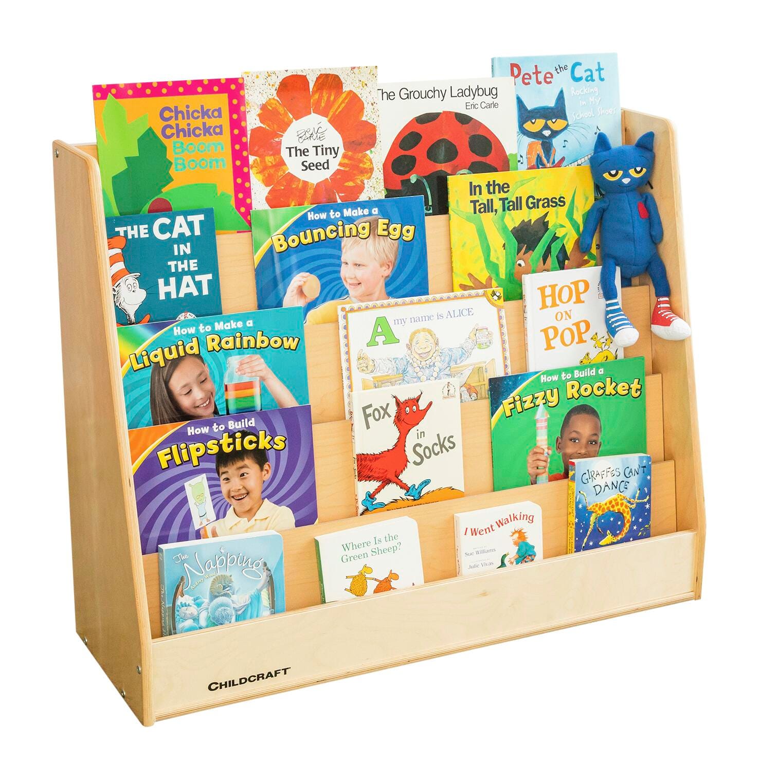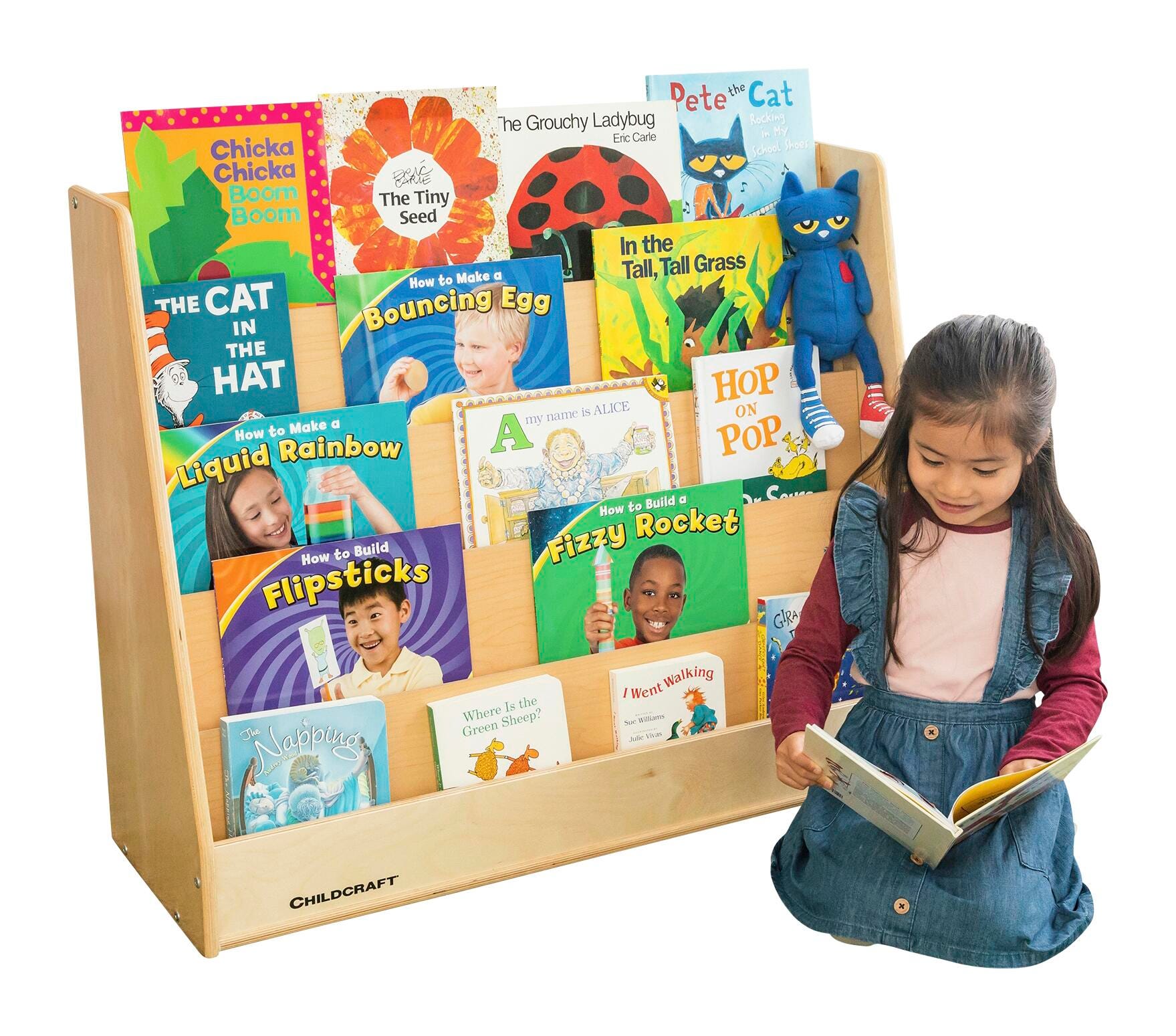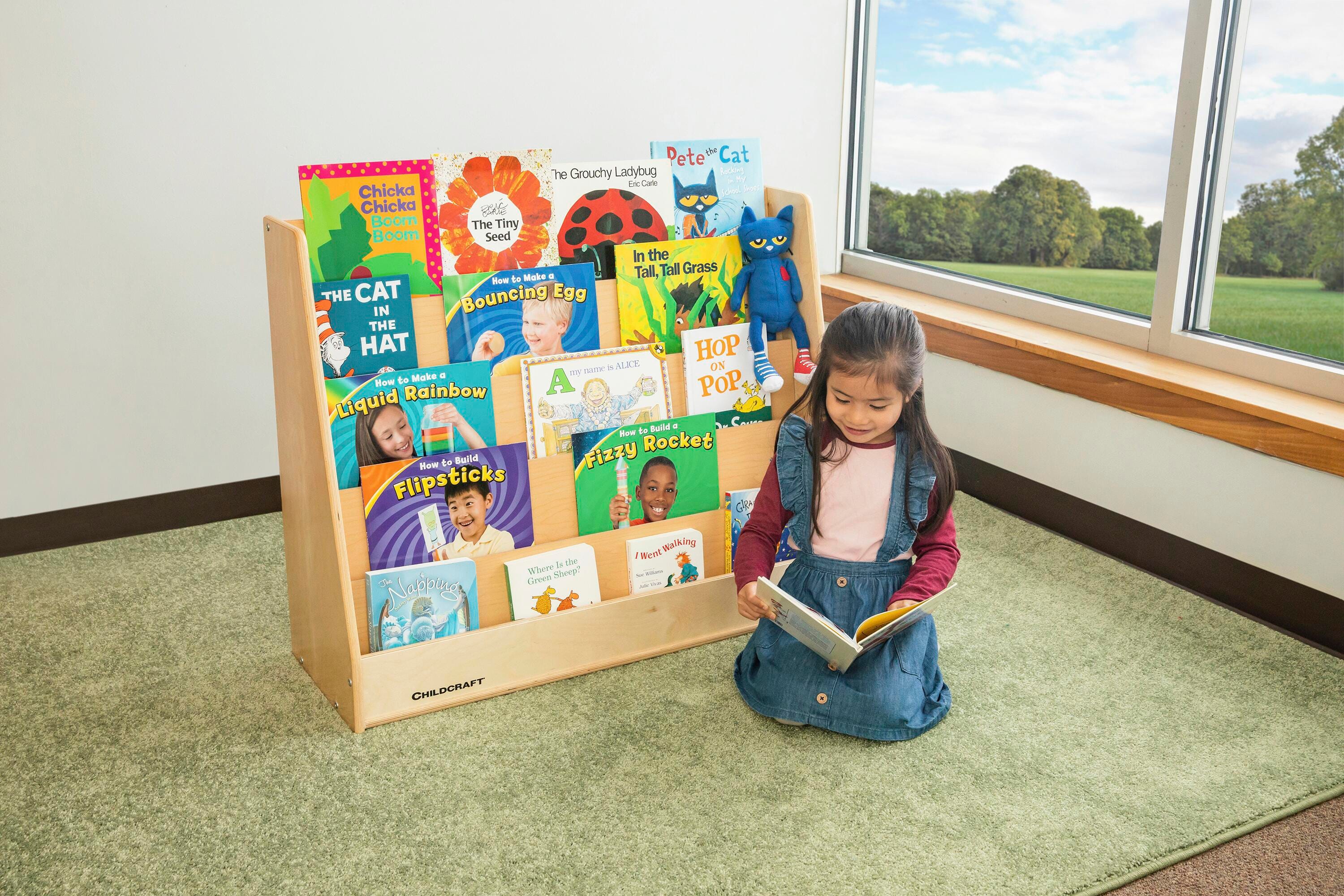 Description Childcraft® 5-Shelf Book Stand Display provides a durable and functional storage solution for books and learning materials. The front side features five slanted hardboard shelves, ideal for displaying picture books, magazines, and easy browsing. The back side offers three long open shelves for additional storage, accommodating bins, baskets, or classroom supplies. Constructed from sturdy birch veneer with an intelligent dado construction and a smooth, UV-cured acrylic finish, this wooden bookshelf resists stains, marks, and frequent cleaning. Ships fully assembled for immediate use. The classroom bookcase measures 36 W x 12-3/4 D x 29 H inches.Features Dual-sided design with five slanted shelves for a front-facing book display and three open shelves on the back for additional classroom storage Sturdy birch veneer construction with a UV-cured acrylic finish resists wear, stains, and daily use Deep storage shelves on the backside of the bookshelf display accommodate bins, baskets, or classroom supplies GREENGUARD Gold Certified for use in children’s rooms and settings Team up with Childcraft to design and outfit your early education environment; we have 75+ years of experience and offer a limited lifetime warranty Committed to the 5C’s of Childcraft: Child-safe, Crafted with quality, Constructed for durability, Complete solutions, and Cleanable design Includes 1 Double-Sided Book Display Stand