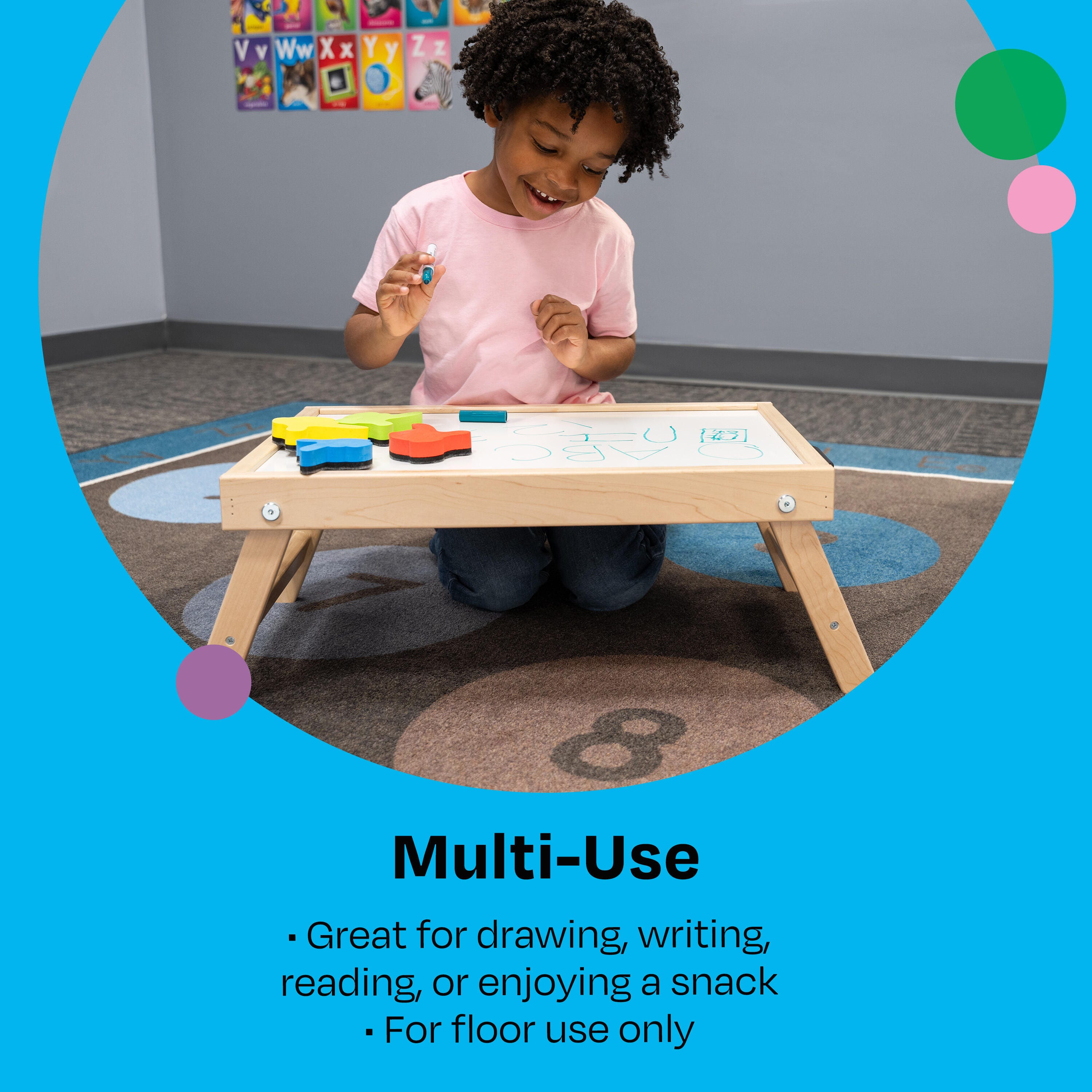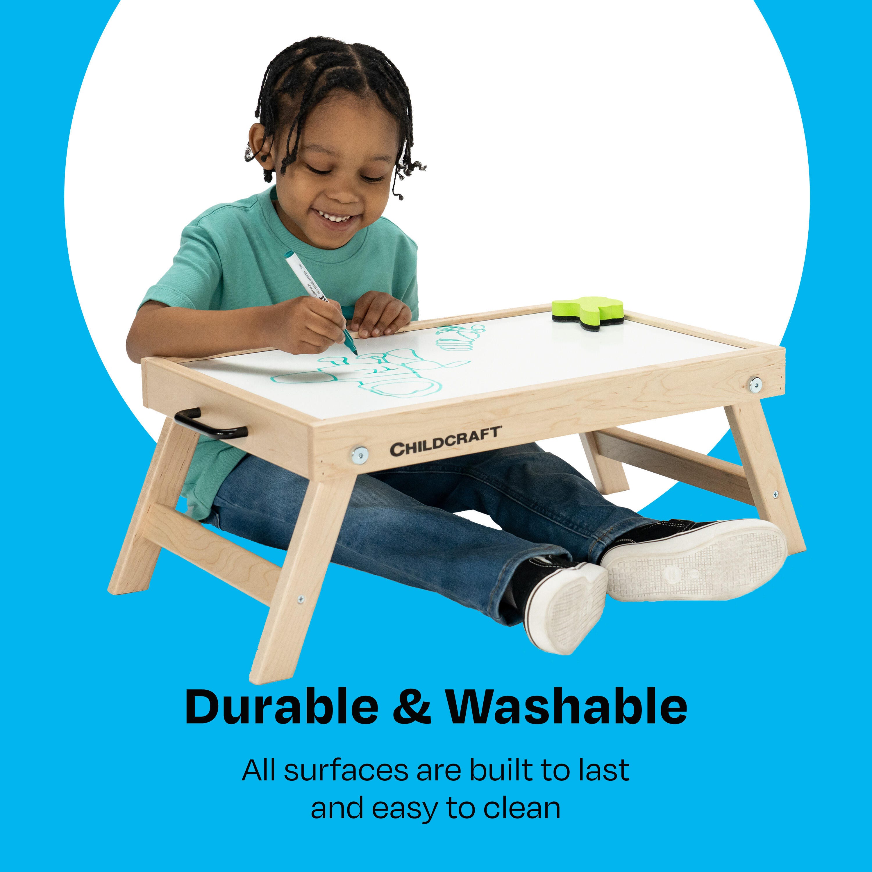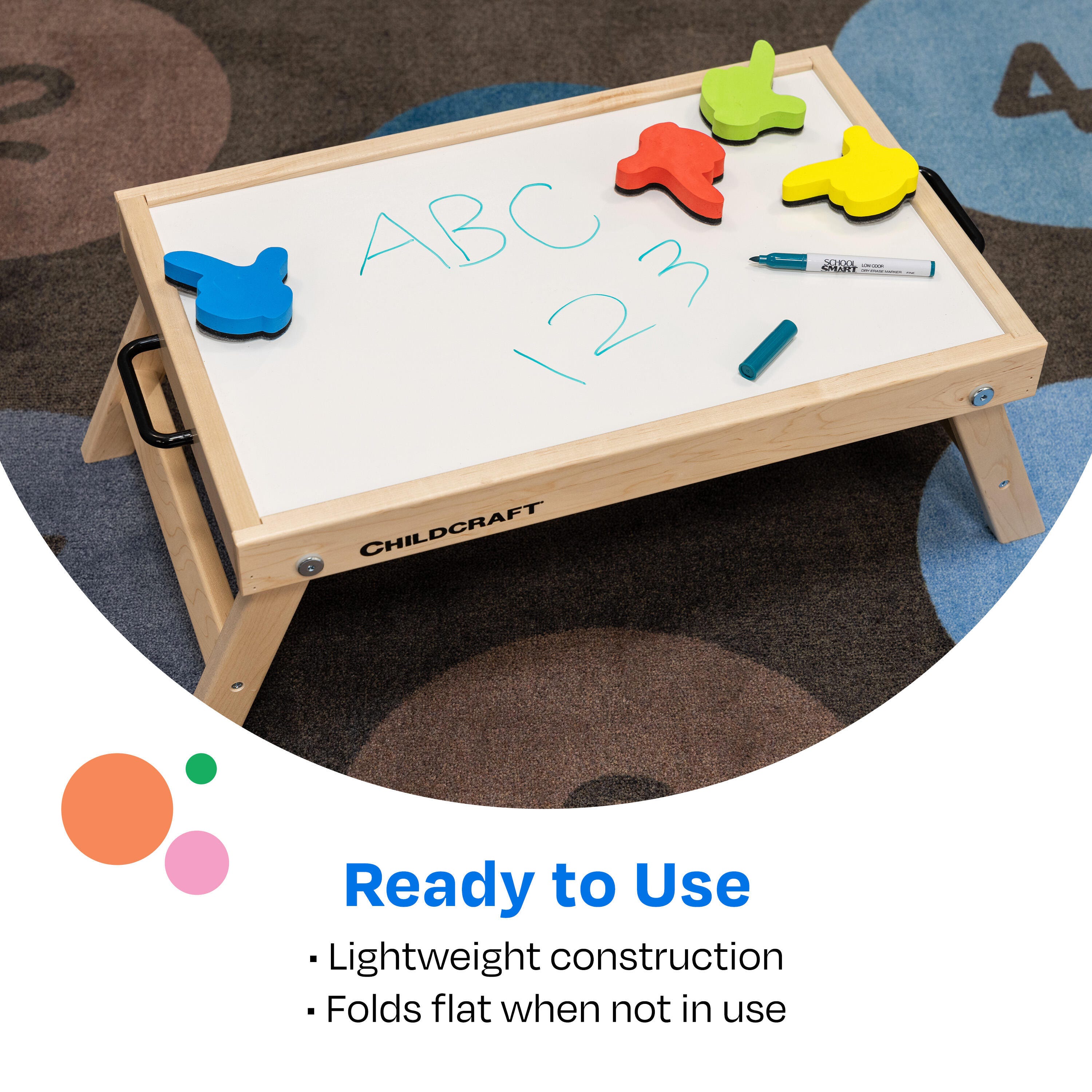Childcraft® Folding Wood Tray with Dry Erase Markerboard is the perfect multi-use addition to classrooms, daycare centers, or home learning spaces. Children can color, draw, write, read, or even snack on this versatile whiteboard table. Dry erase tables for classrooms encourage creativity, while the lightweight design and folding legs make it simple to store flat when not in use. With an attached handle for easy transport, this compact whiteboard desk is easy to carry and use. The activity table comes fully assembled and is for floor use only. This dry erase board table measures 25-1/2 W x 13-3/4 D x 9 H inches.