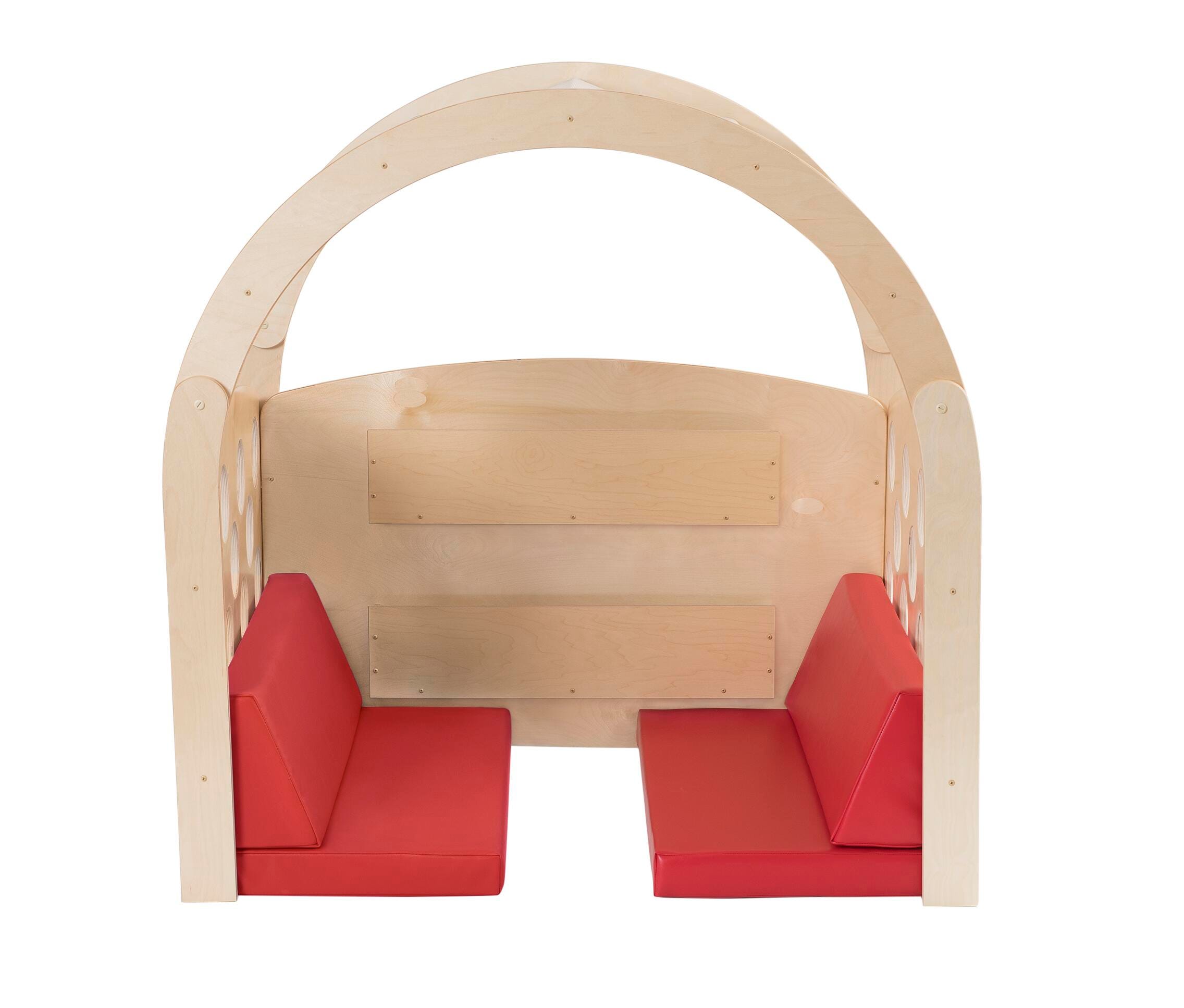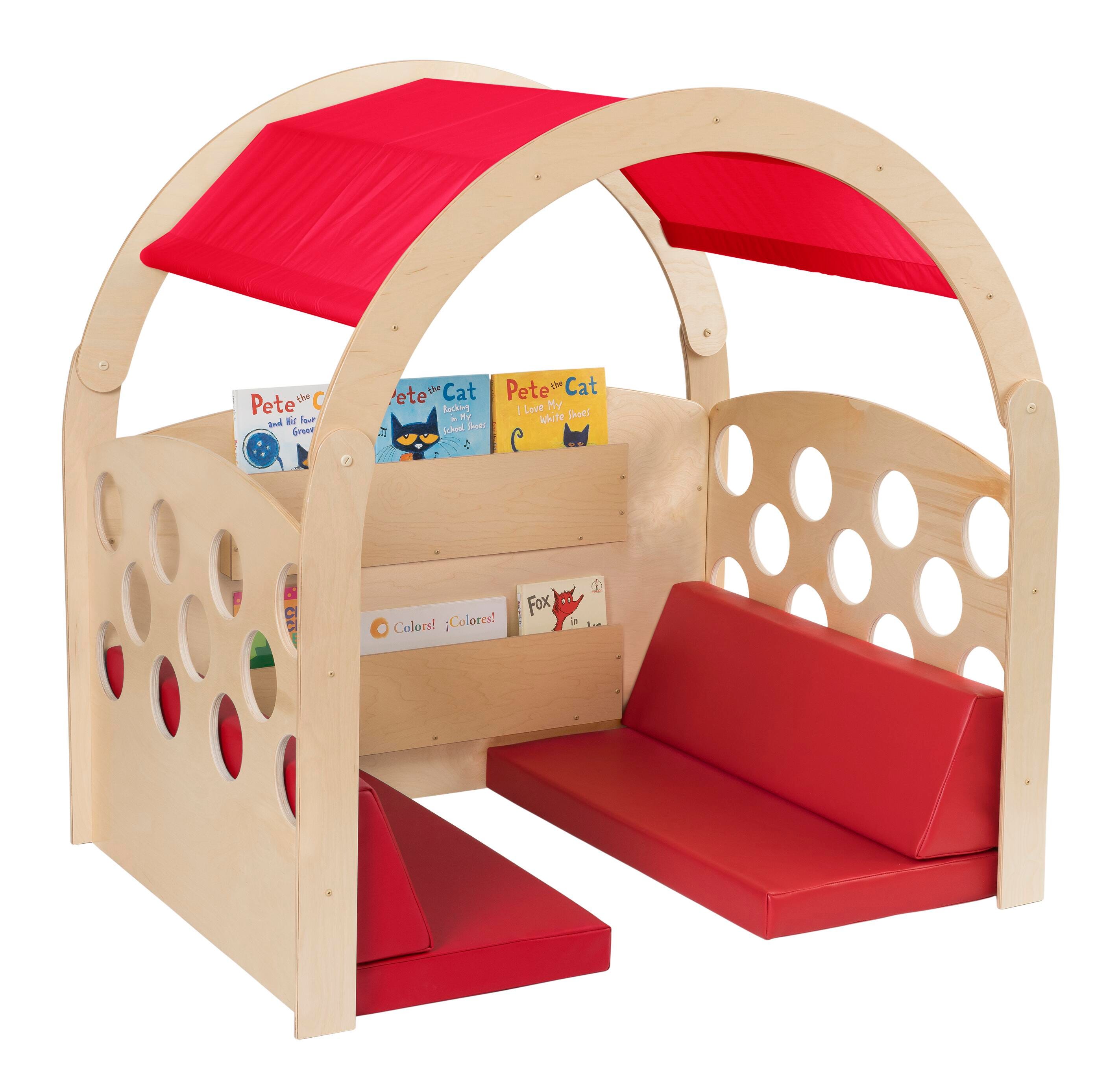 The Childcraft® Reading Nook provides a comfortable retreat for young learners to explore books and unwind. Designed for classrooms, libraries, and early learning spaces, this wooden reading nook features a sturdy frame with side cutouts for teacher visibility, two built-in bookshelves for easy access to reading materials, and a soft canopy for a calming atmosphere. The included red seat cushions offer extra comfort, making this the perfect spot for independent reading or small group activities. This reading nook with seating comes with two interchangeable canopies. The full unit measures 49-1/2 W x 37 D x 50 H inches. Assembly required.Features