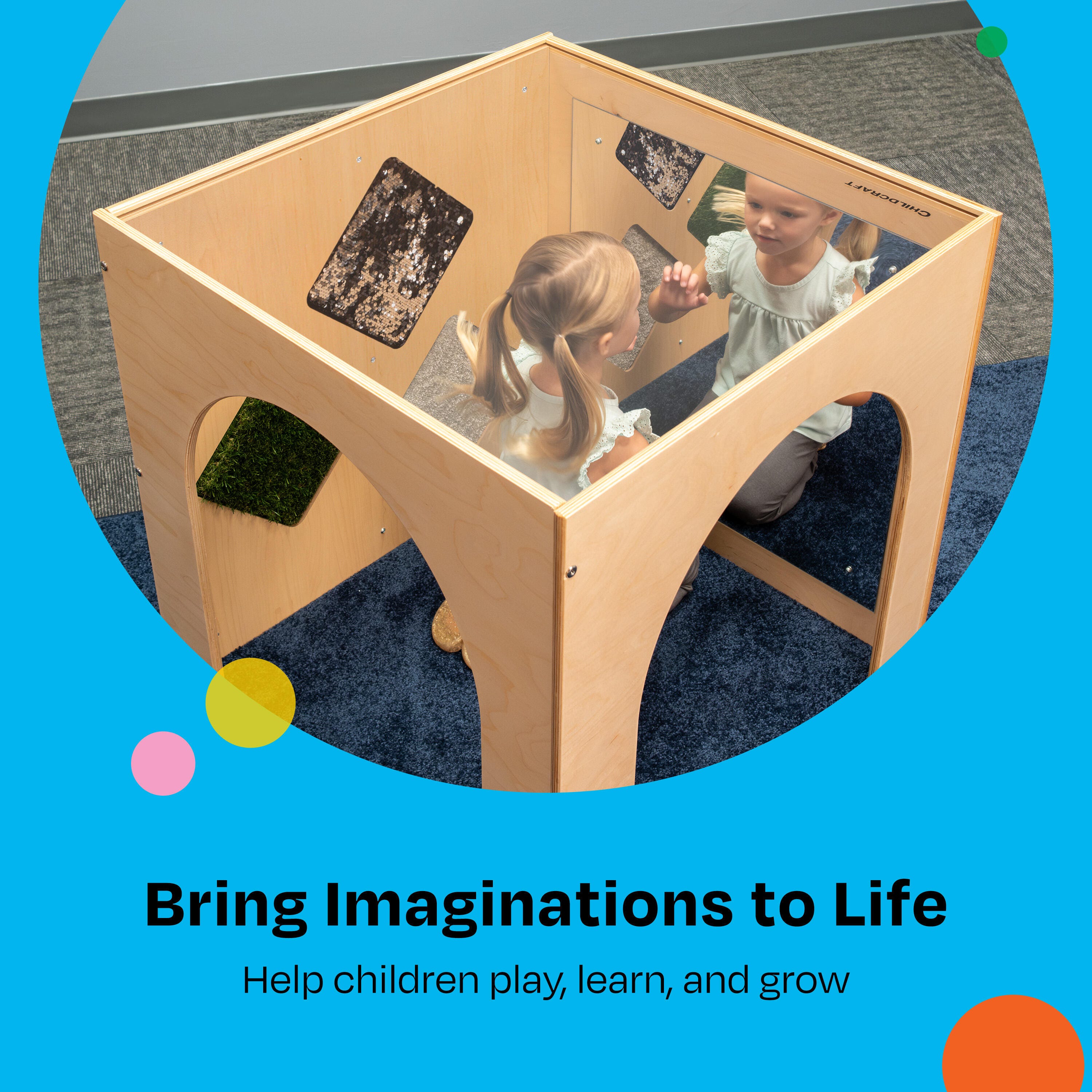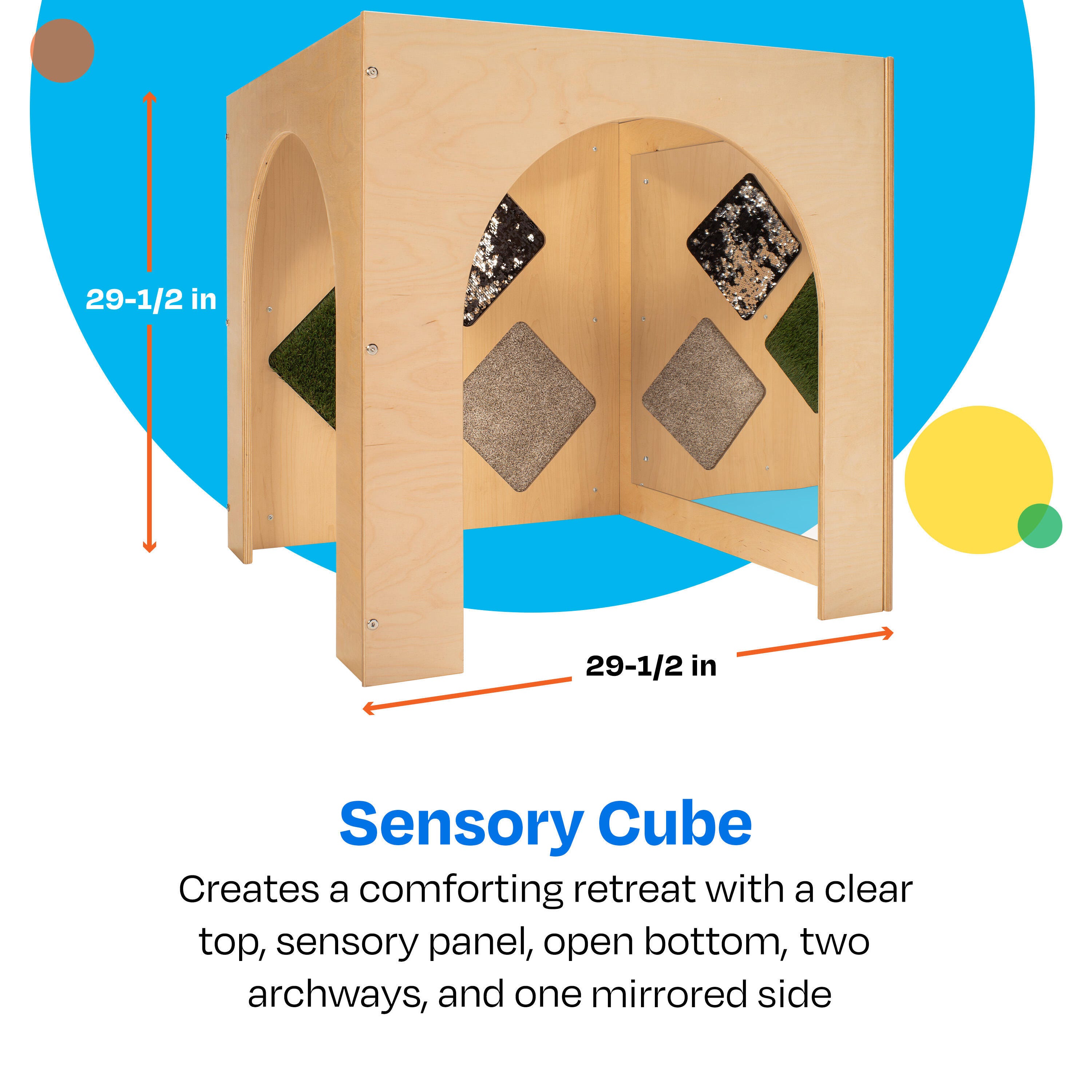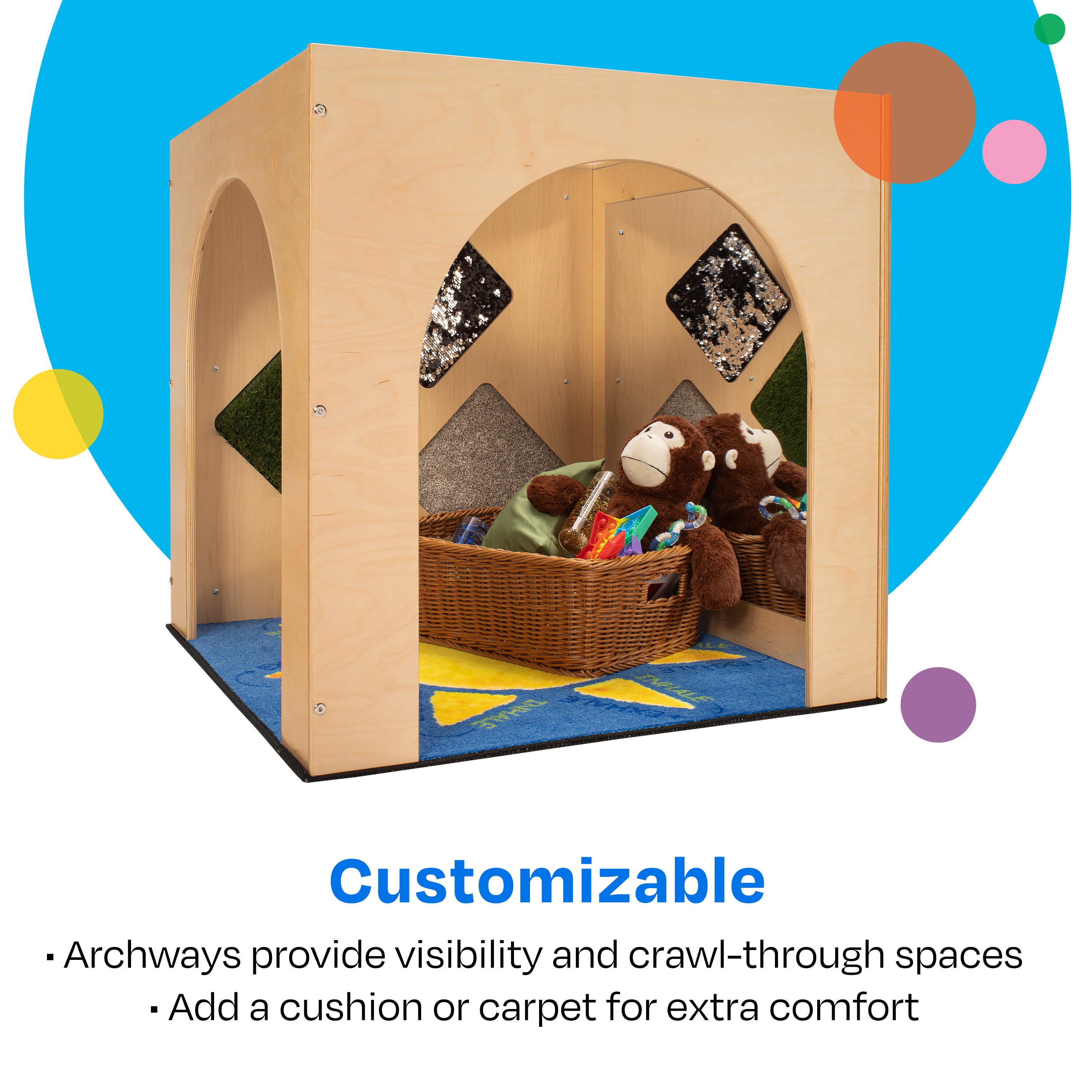 Childcraft® Cozy Arch Cube with Sensory Panel creates a comforting and multi-sensory retreat with a clear top, 2 arch openings, a wall with 3 sensory panels, and a wall with a shatterproof mirror. Sized for young children, this privacy cube creates the perfect reading nook or quiet space. The sensory panels are reversible sequins, carpet, and simulated grass turf; the shatterproof acrylic mirror is a 23-3/4 inch square. Mix and match wooden activity cubes to create your ideal space. A cushion or carpet square can be added for comfort. Light assembly is required. This cube measures 29-1/2 W x 29-1/2 D x 29-1/2 H inches; each arch measures 20 W x 25-1/2 H inches.