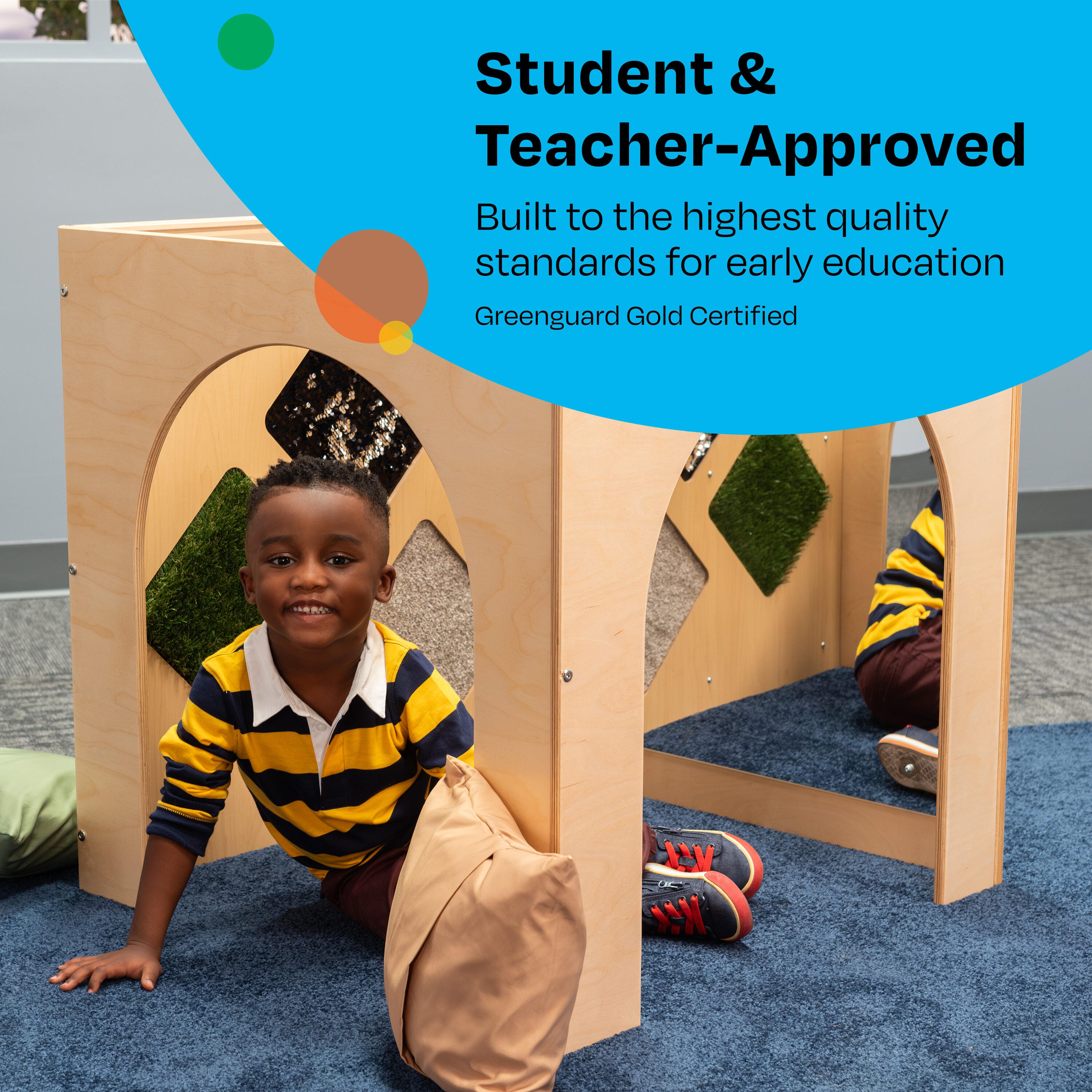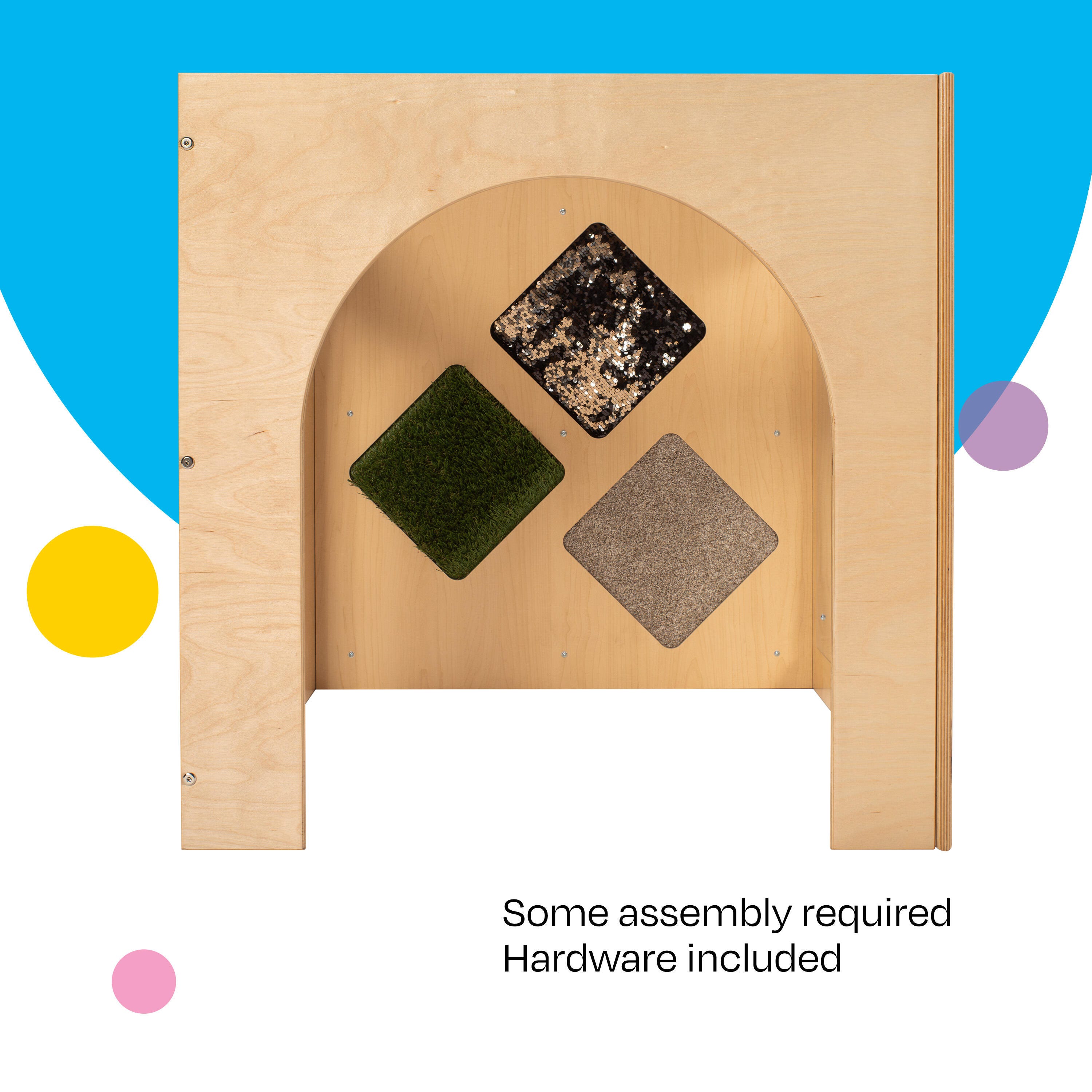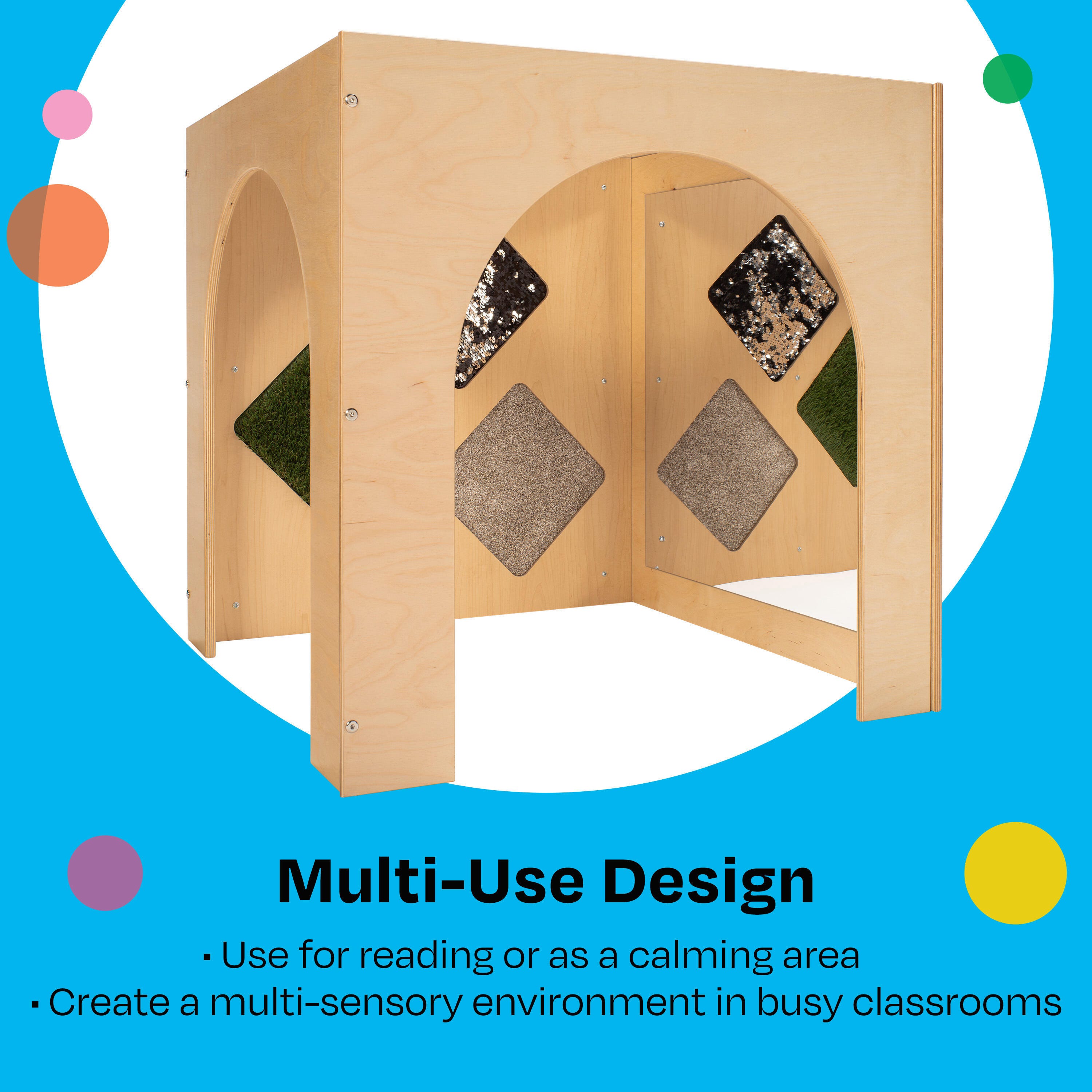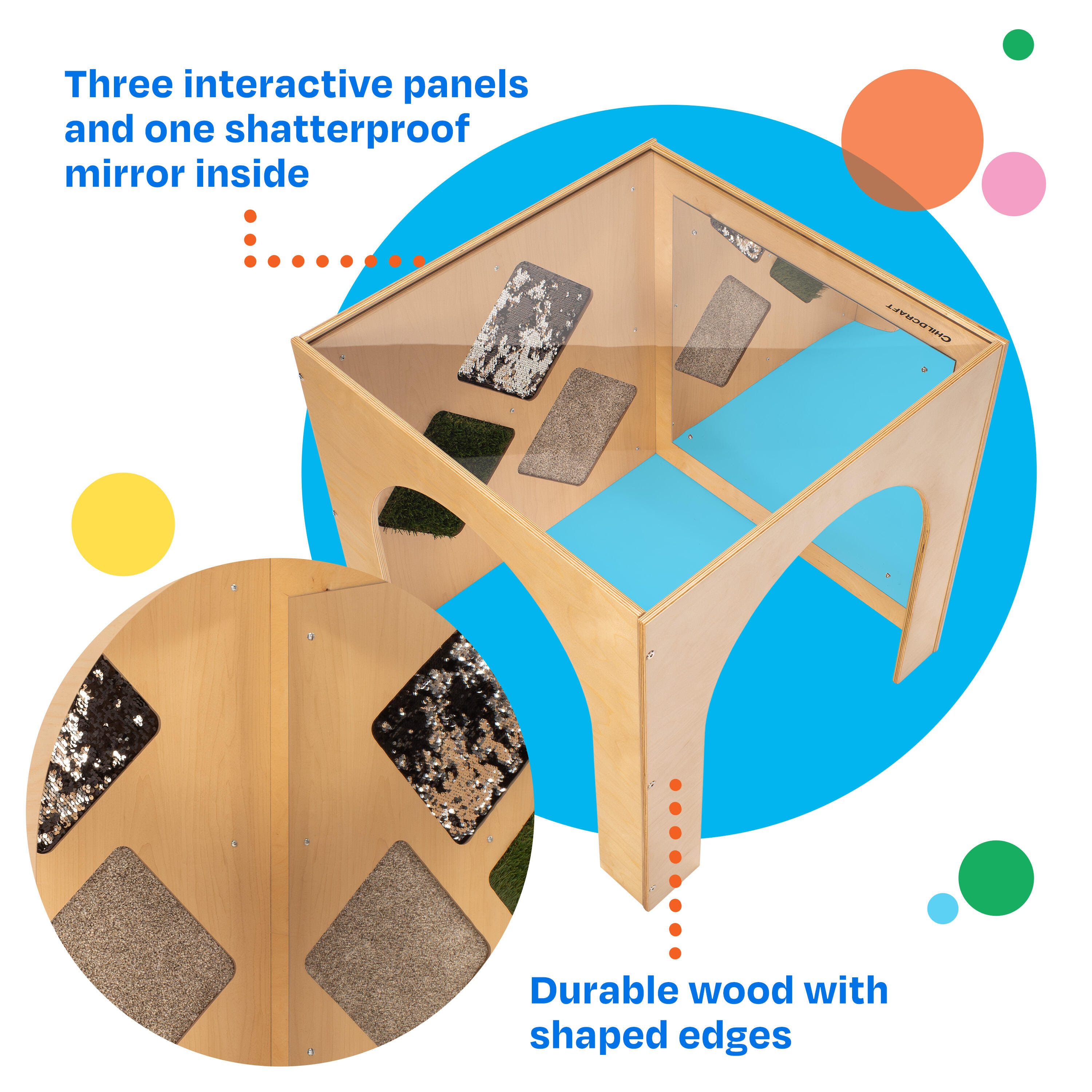 Childcraft® Cozy Arch Cube with Sensory Panel creates a comforting and multi-sensory retreat with a clear top, 2 arch openings, a wall with 3 sensory panels, and a wall with a shatterproof mirror. Sized for young children, this privacy cube creates the perfect reading nook or quiet space. The sensory panels are reversible sequins, carpet, and simulated grass turf; the shatterproof acrylic mirror is a 23-3/4 inch square. Mix and match wooden activity cubes to create your ideal space. A cushion or carpet square can be added for comfort. Light assembly is required. This cube measures 29-1/2 W x 29-1/2 D x 29-1/2 H inches; each arch measures 20 W x 25-1/2 H inches.