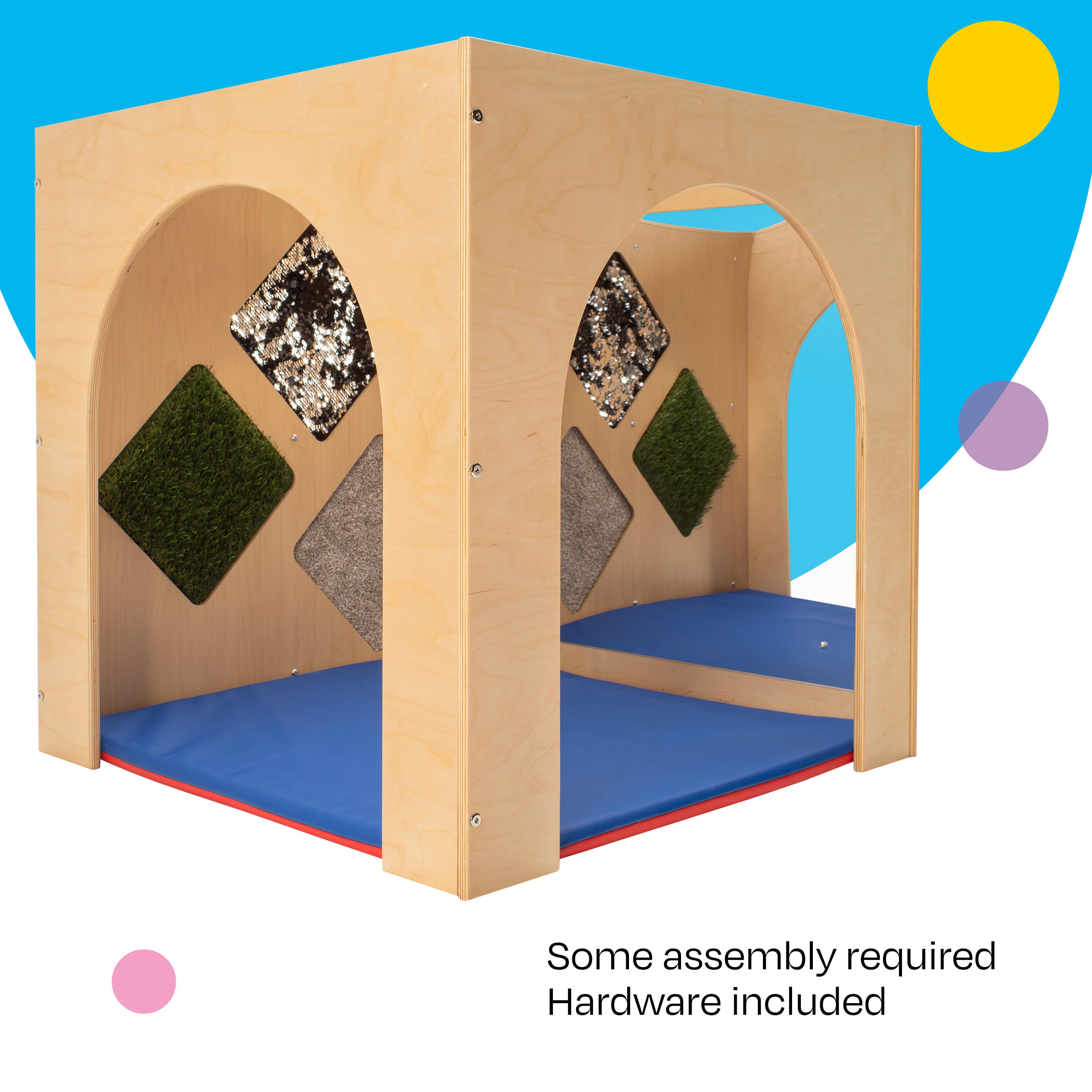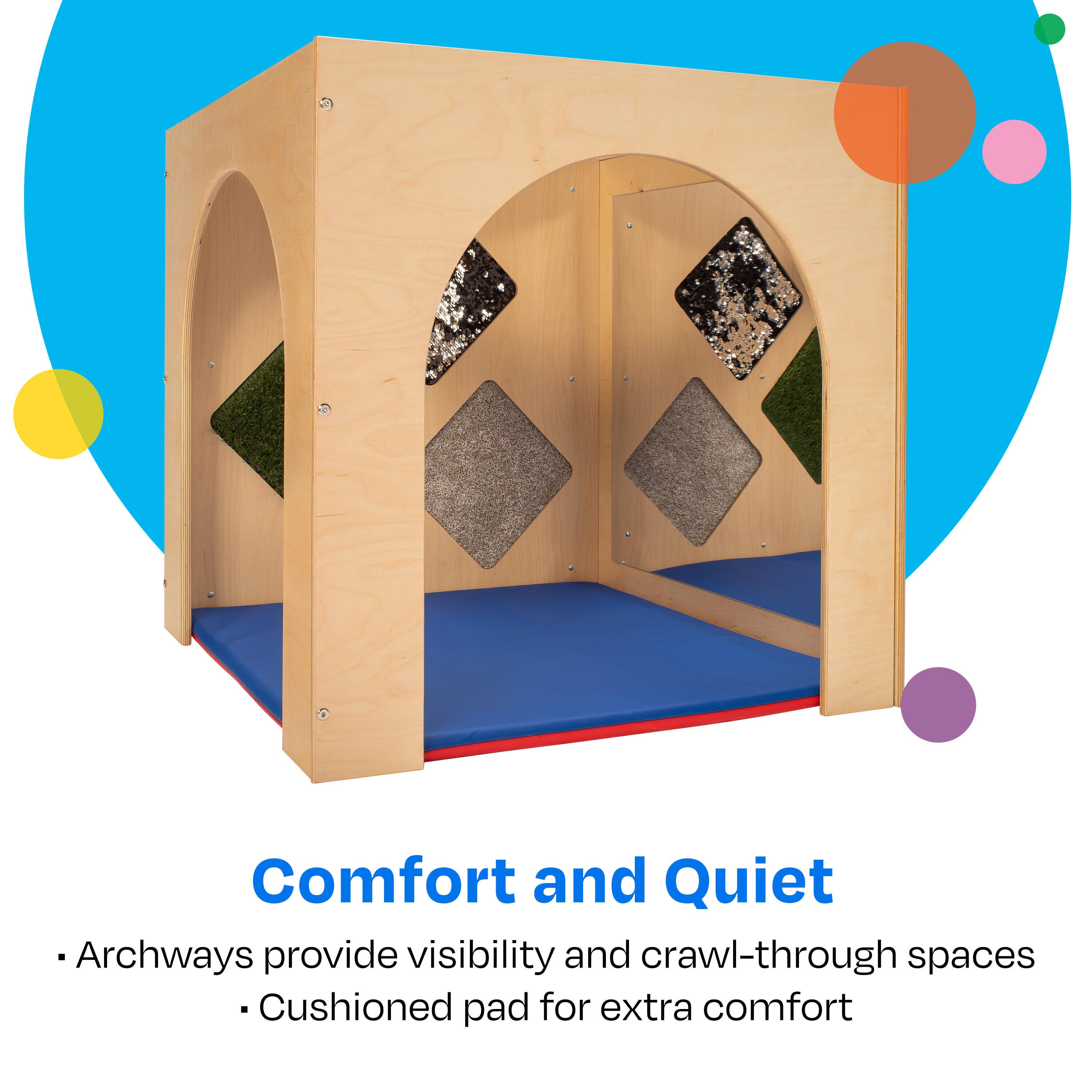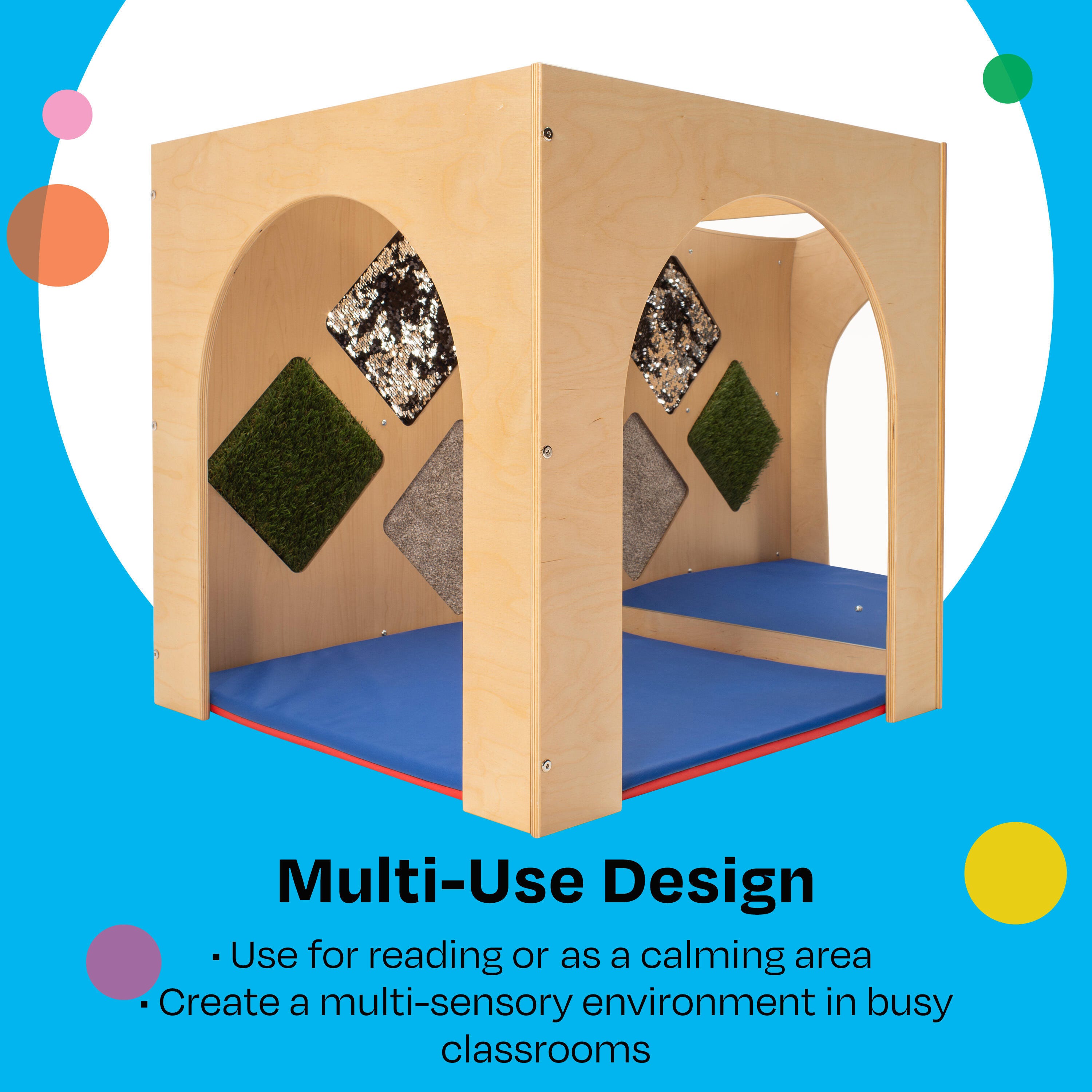 Create a sensory-friendly space in preschool or early education classrooms with this cozy cube with cushion, sensory panels, and mirror.