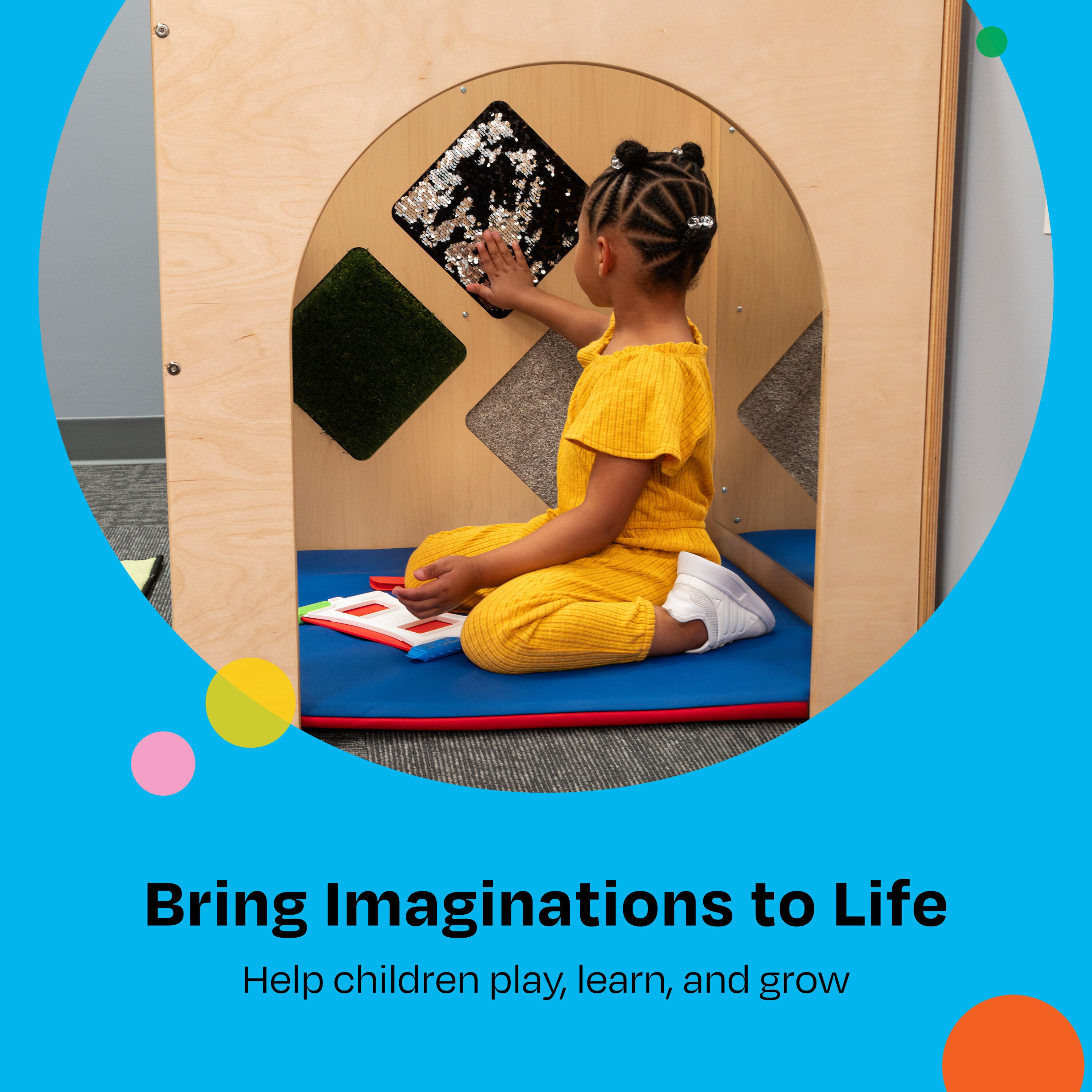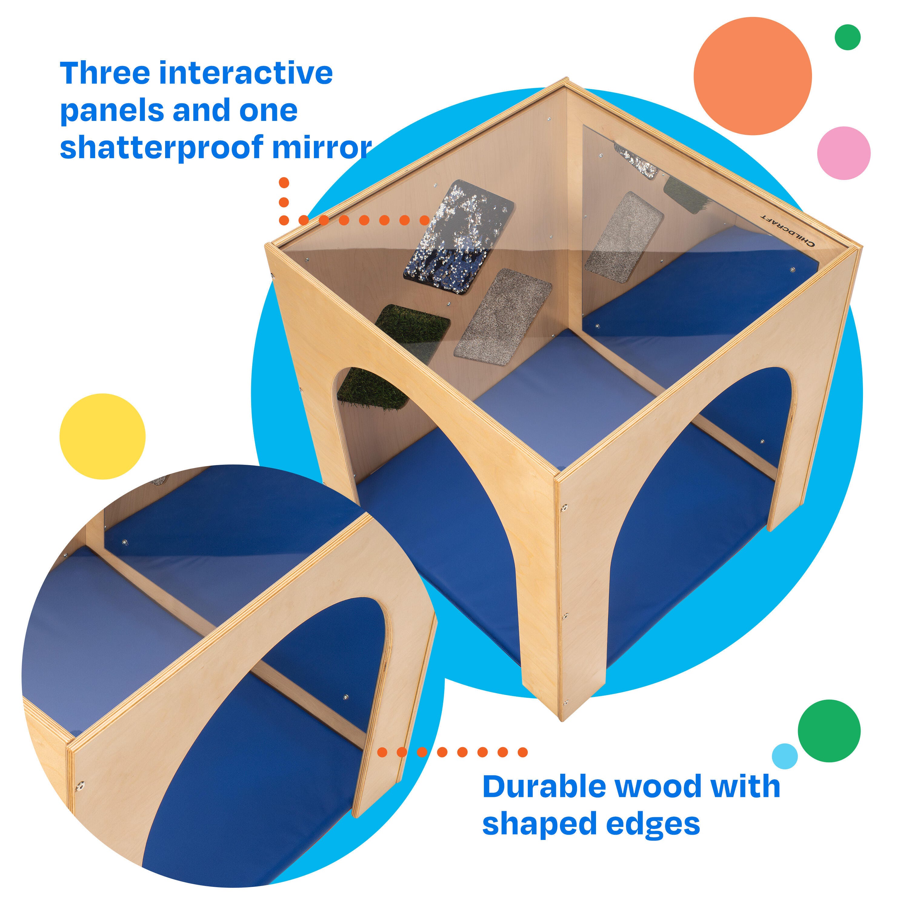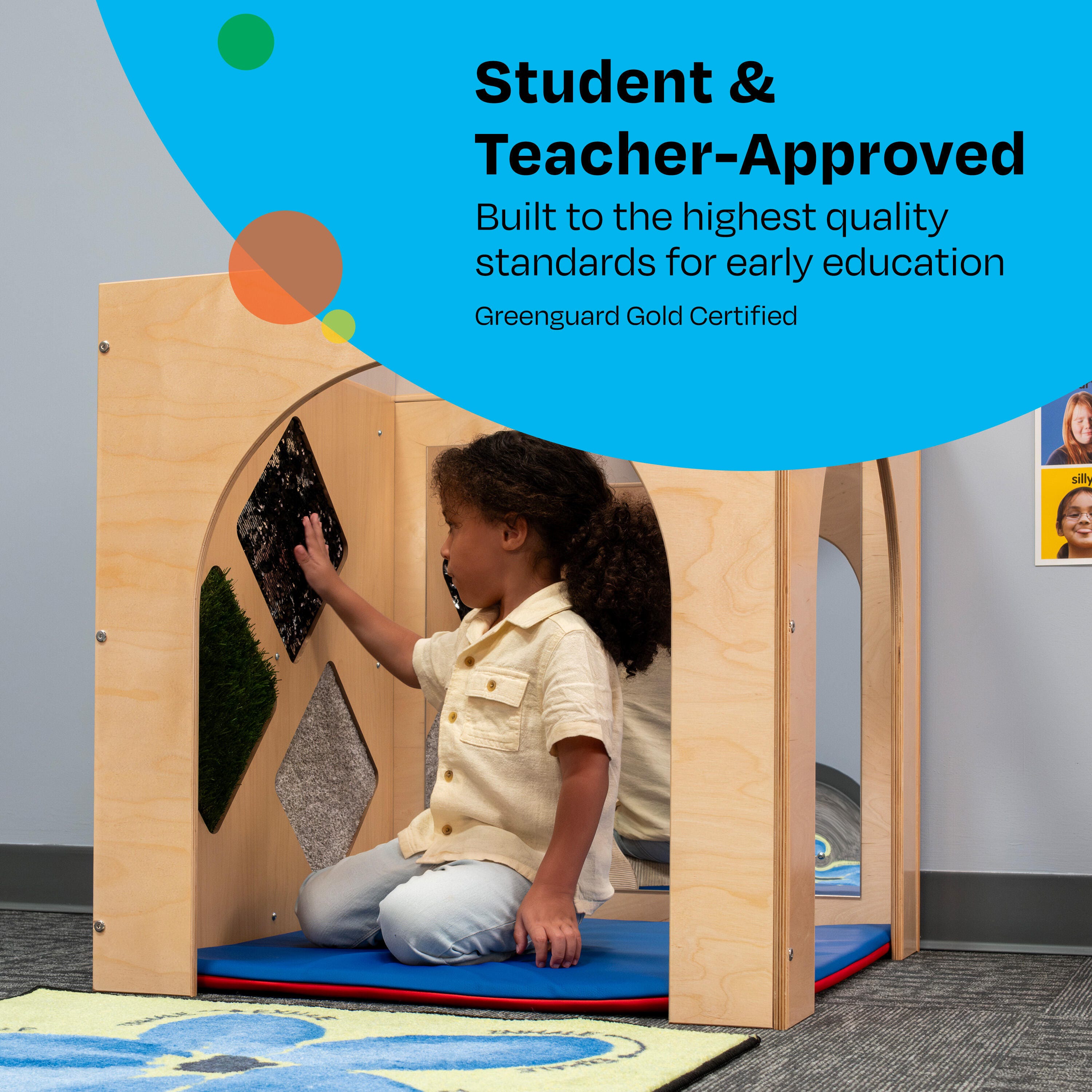 Create a sensory-friendly space in preschool or early education classrooms with this cozy cube with cushion, sensory panels, and mirror.