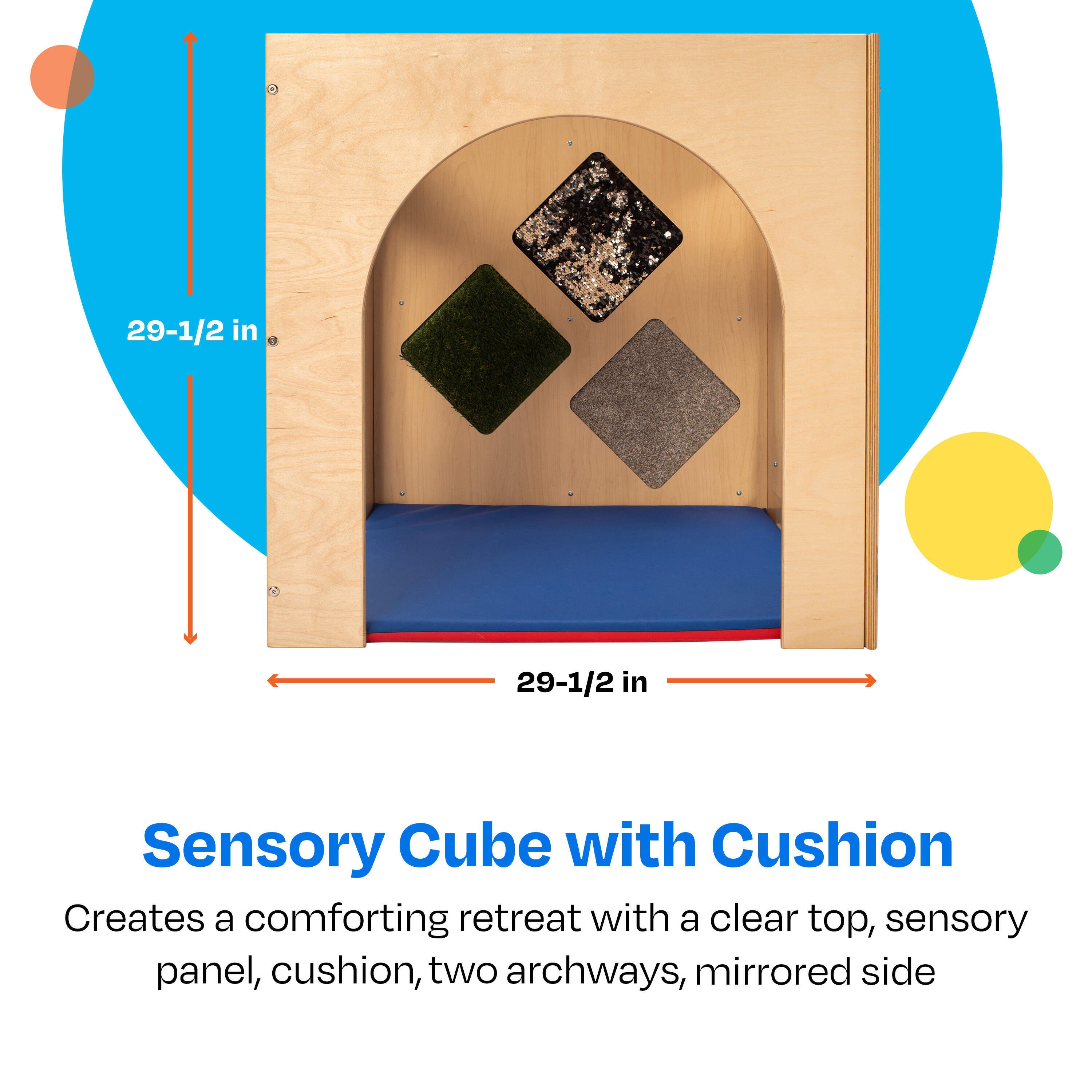 Description Childcraft® Cozy Arch Cube with Cushion and Sensory Panel creates a comforting and multi-sensory retreat with a clear top, cushion, 2 arch openings, a wall with 3 sensory panels, and a wall with a shatterproof mirror. Sized for young children, this privacy cube creates the perfect reading nook or quiet space. The sensory panels are reversible sequins, carpet, and simulated grass turf; the shatterproof acrylic mirror is a 23-3/4 inch square. Easy to use and clean, the removable cushion can be wiped down and sanitized. Light assembly is required. This cube measures 29-1/2 W x 29-1/2 D x 29-1/2 H inches. Each arch measures 20 W x 25-1/2 H inches.Features This wooden cube has 2 arched open sides for supervisor visibility and 2 sides for sensory play A reversible and removable soft cushion provides comfortable seating Made of durable birch plywood and finished with environmentally friendly ultra-cured clear acrylic for easy cleaning and sanitizing Use as a reading nook for children, cozy corner, safe space, flexible floor seating, and more GREENGUARD Gold Certified for use in children’s rooms and settings Team up with Childcraft to design and outfit your early education environment; we have 75+ years of experience and offer a limited lifetime warranty Committed to the 5C’s of Childcraft: Child-safe, Crafted with quality, Constructed for durability, Complete solutions, and Cleanable design Includes: 1 Cozy Cube with Cushion and Sensory Panels Instructions and Hardware