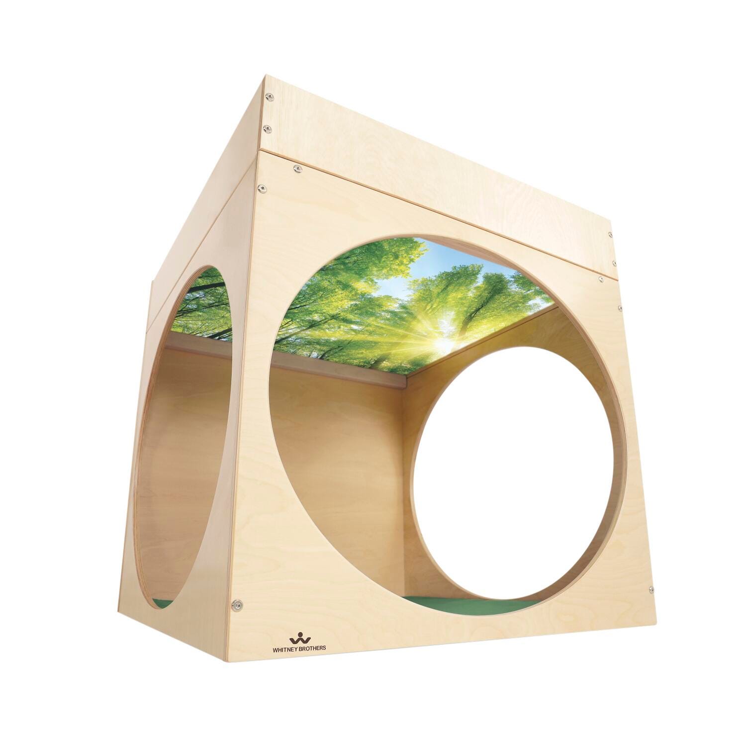An exclusive Whitney Brothers innovation: A reading cube with a light table and a clever twist! Every child will love the cozy, quiet interior with a view that looks up through a brilliant sunlit forest canopy printed on the underside of the light table mounted on top. Two products in one provides a substantial savings in space! The light table features LED lights, 30.5"H play surface, a cord with an on/off toggle switch and is UL Listed for use in Canada and the US. The cube includes a green vinyl floor pad and satisfies every state requirement for a quiet space in Early Learning environments without restricting visibility of the child inside for adult supervision. All edges are rounded over and sanded smooth for safety. Constructed in beautiful, durable birch plywood in safe, non-toxic natural UV finish that won't yellow and withstands rigorous use.Features