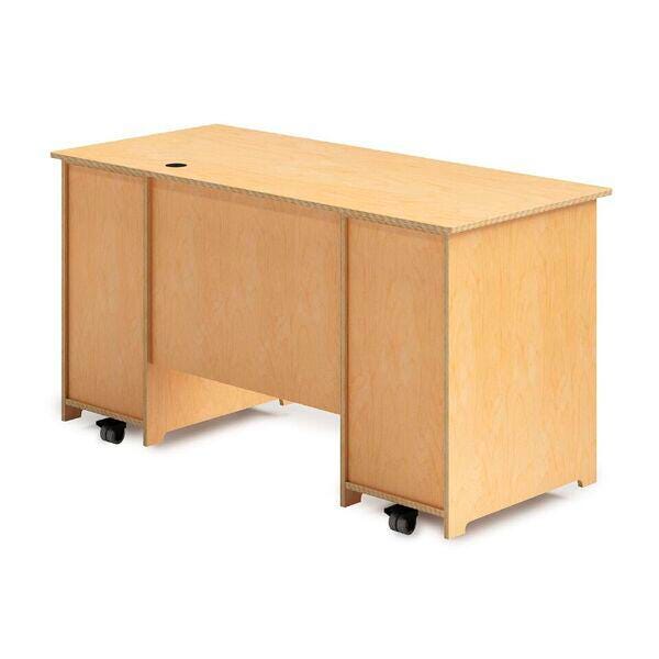 A purpose-built desk for Early Childhood teachers! This double pedestal desk features a generous work surface of 57-3/4 W x 26 D inches with a grommet that neatly accommodates computer cables, phone line and power cords. The left pedestal includes drawer glides that accommodate two shallow, one medium and one large Gratnell tray (included). The right pedestal features an adjustable internal shelf and grommet. A center modesty panel completes the finished look. Constructed with no visible external screws or joinery for a fine finished furniture look.