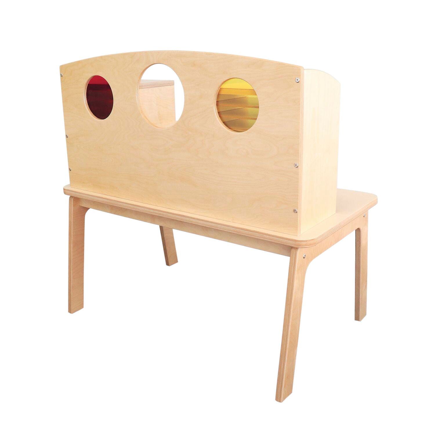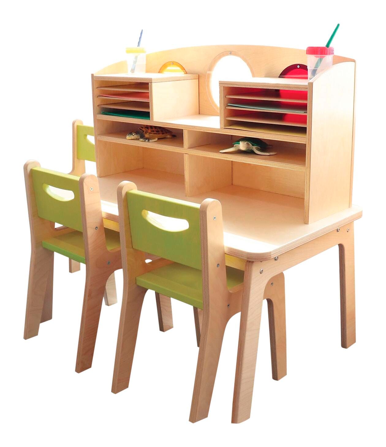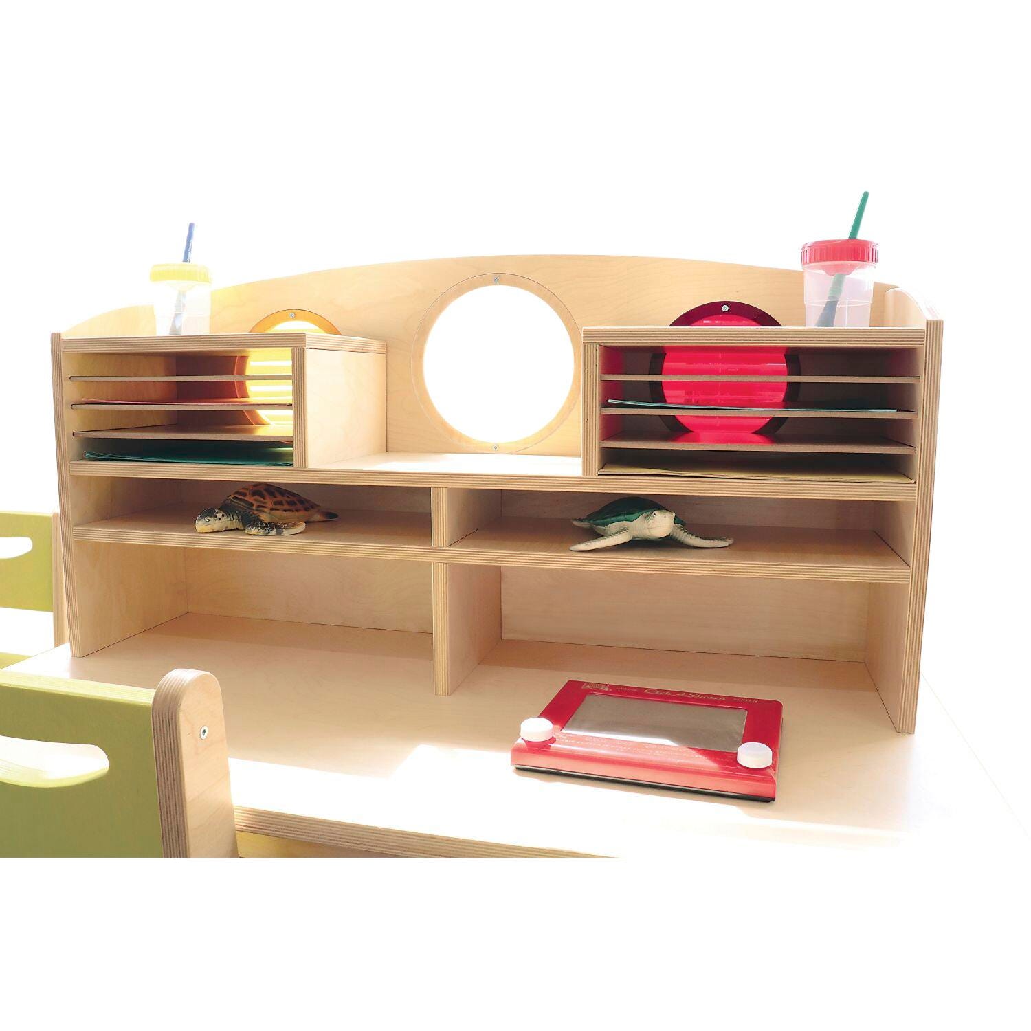 A uniquely styled desk that invites one or two children to sit down and read, write, draw, create, play or whatever the classroom activity entails. There's plenty of storage for papers, books or other materials and the colorful acrylic porthole inserts add a striking design element that also enable front to back supervision of children. The desk surface is 20-inches high and finished in kitchen-quality high pressure laminate (HPL) to resist scratches.