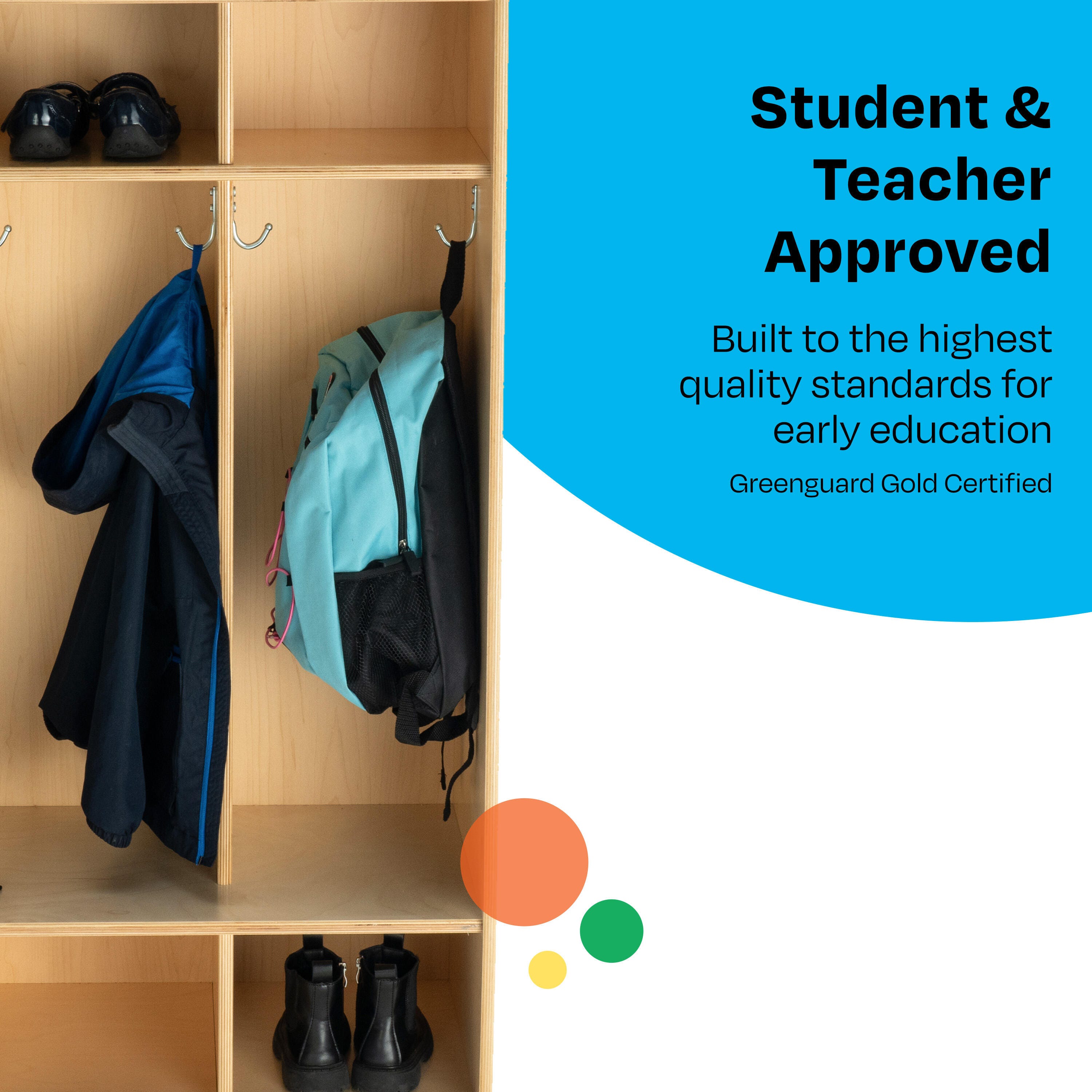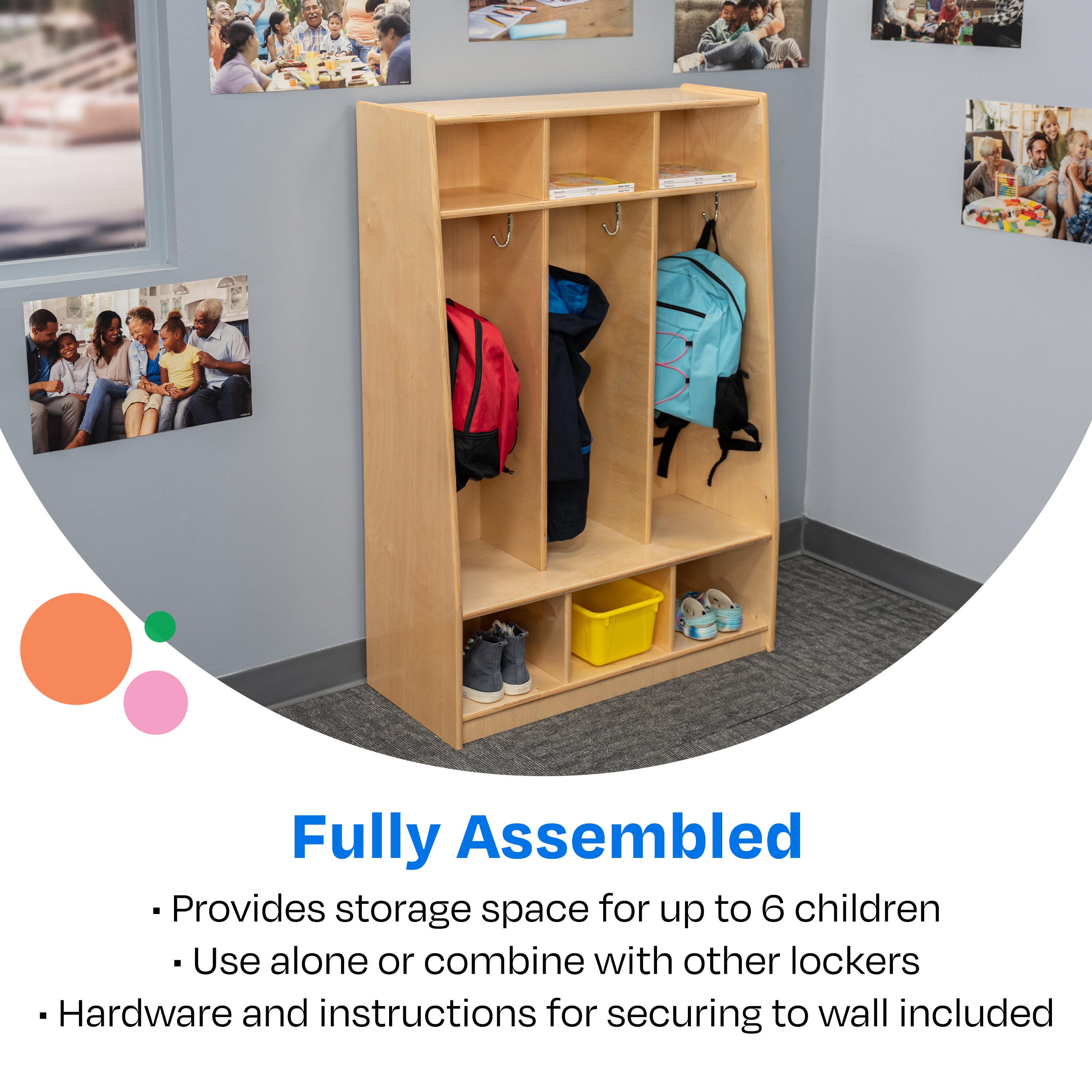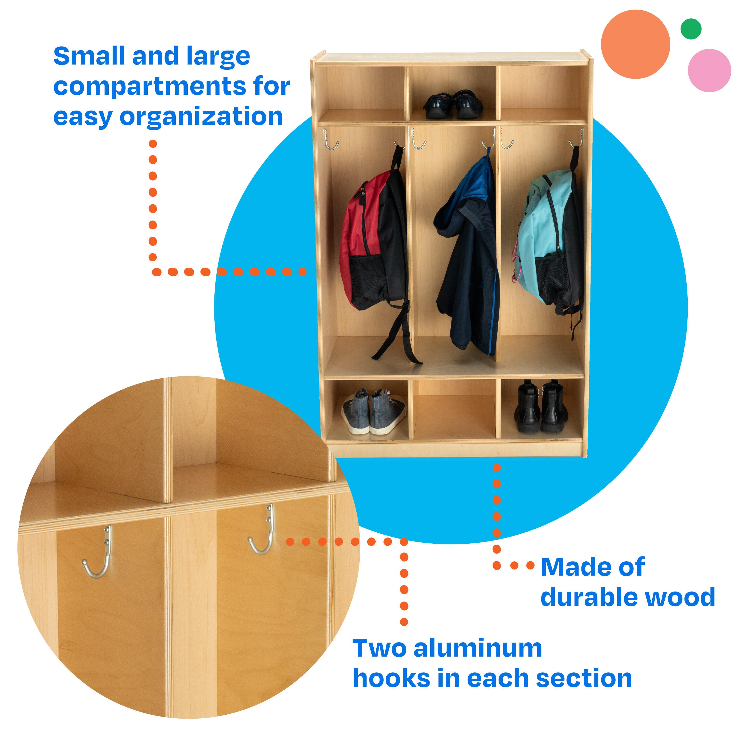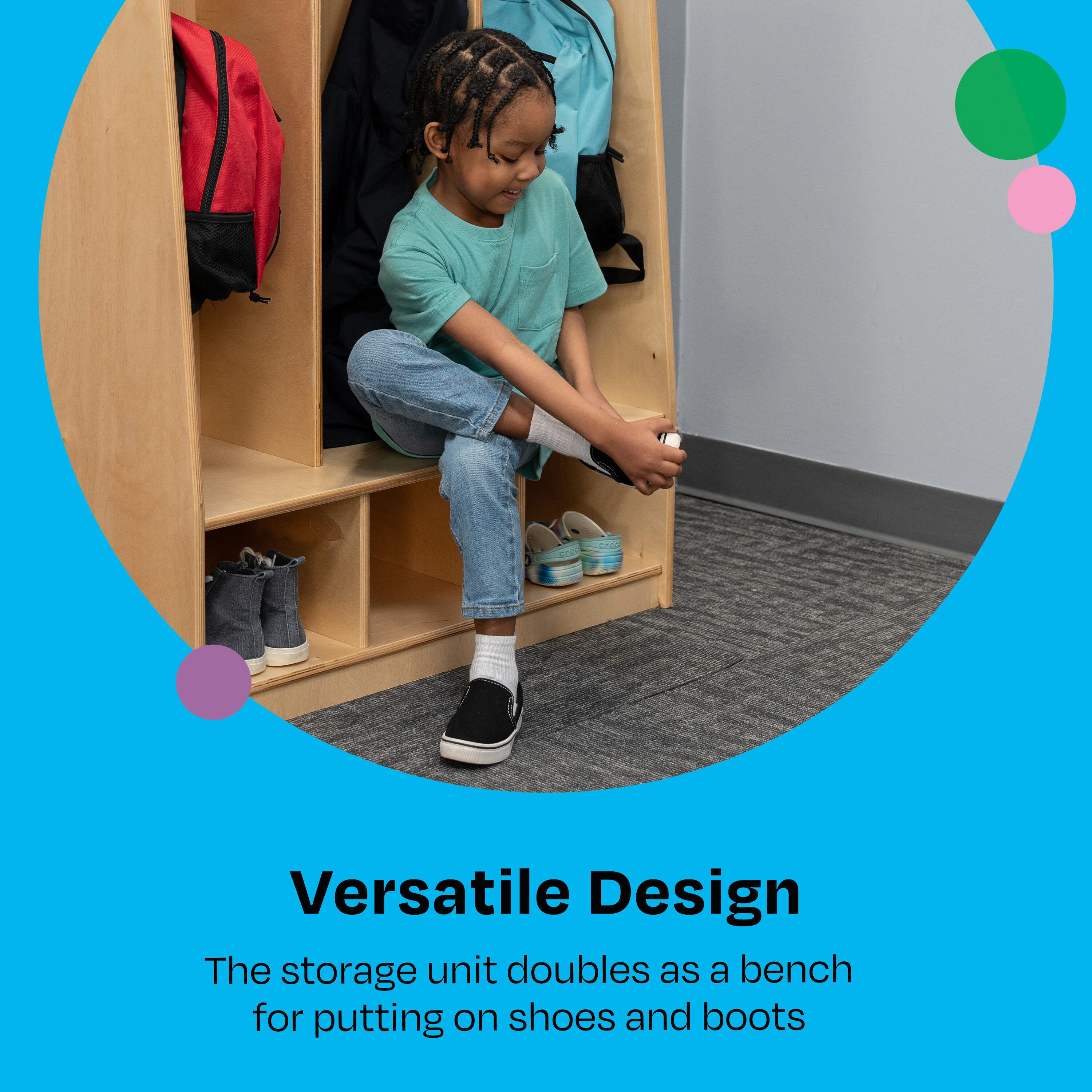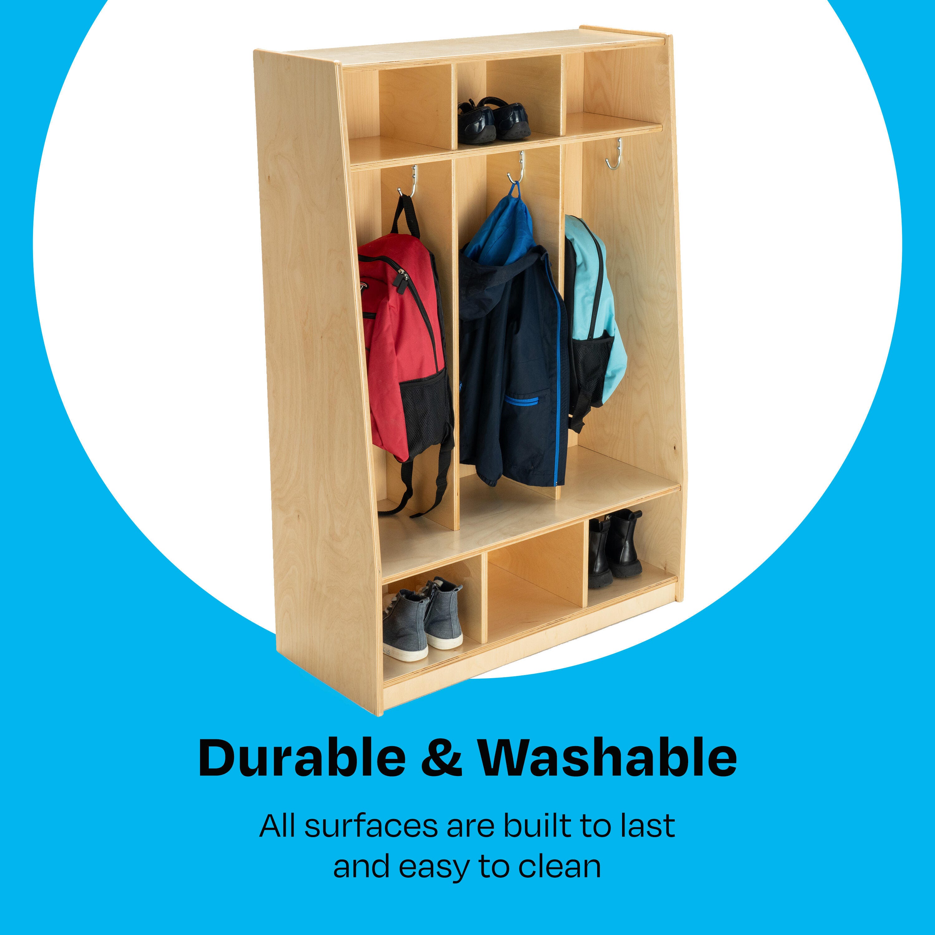 Childcraft® Bench Coat Locker combines convenience and durability with a thoughtful design. Ideal for schools, daycare centers, and homes, the children’s coat locker features three spacious sections with two aluminum hooks per section, offering plenty of space for outerwear, backpacks, and more. The upper and bottom compartments provide additional room for shoes, lunchboxes, or supplies, ensuring all items stay neatly organized. Made with durable birch veneer panels and finished with a UV-cured acrylic coating, this storage unit is built to withstand frequent use and cleaning. Use alone or combine with other Childcraft coat lockers for additional locker space. Comes fully assembled; secure the unit to a wall for safety and stability. Not recommended as a room divider. This locker with bench measures 32-1/2 W x 14-1/4 D x 48 H inches; accommodates up to 6 children.