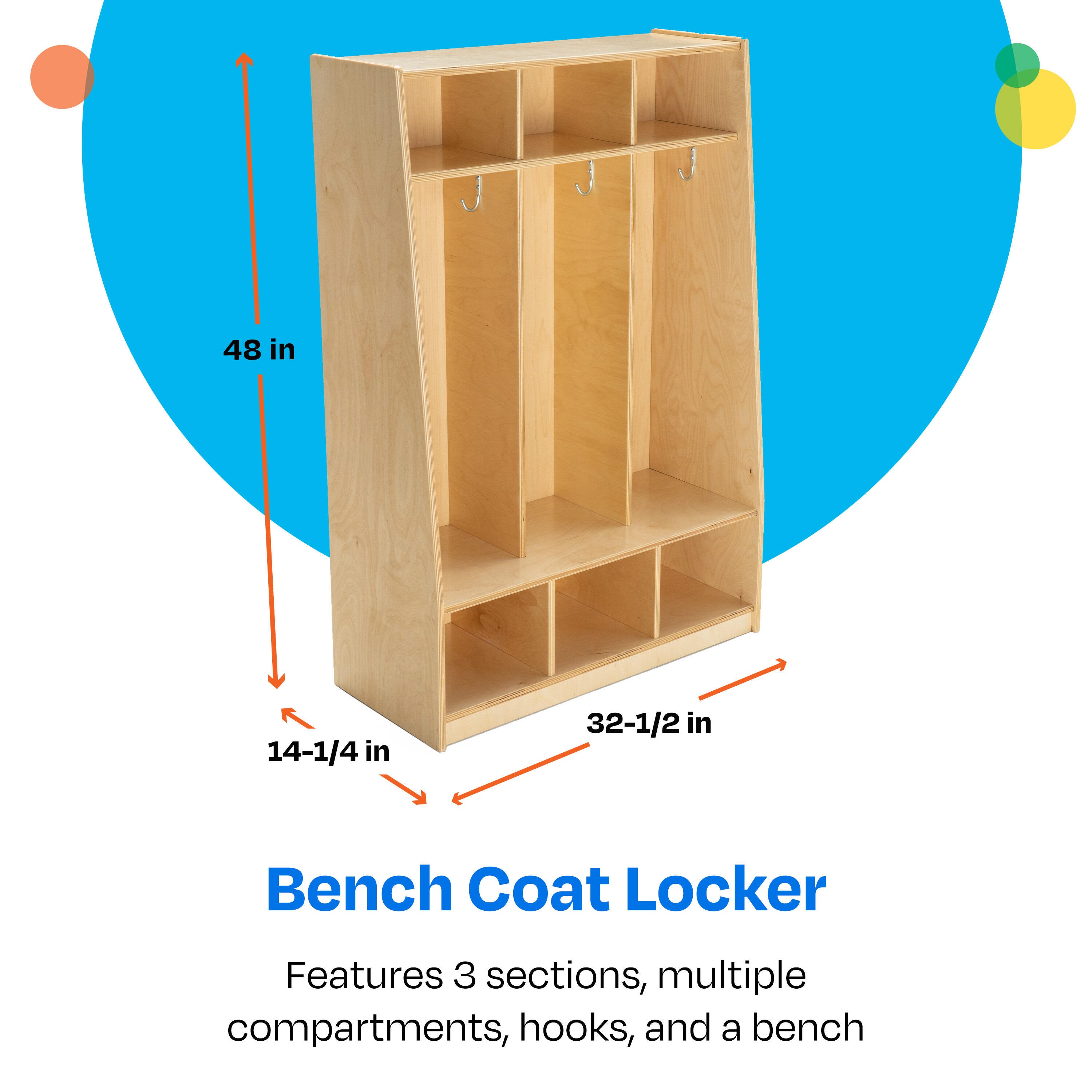 Childcraft Bench Coat Locker, 3 Sections, Wooden, 32-1/2 x 14-1/4 x 48 Inches