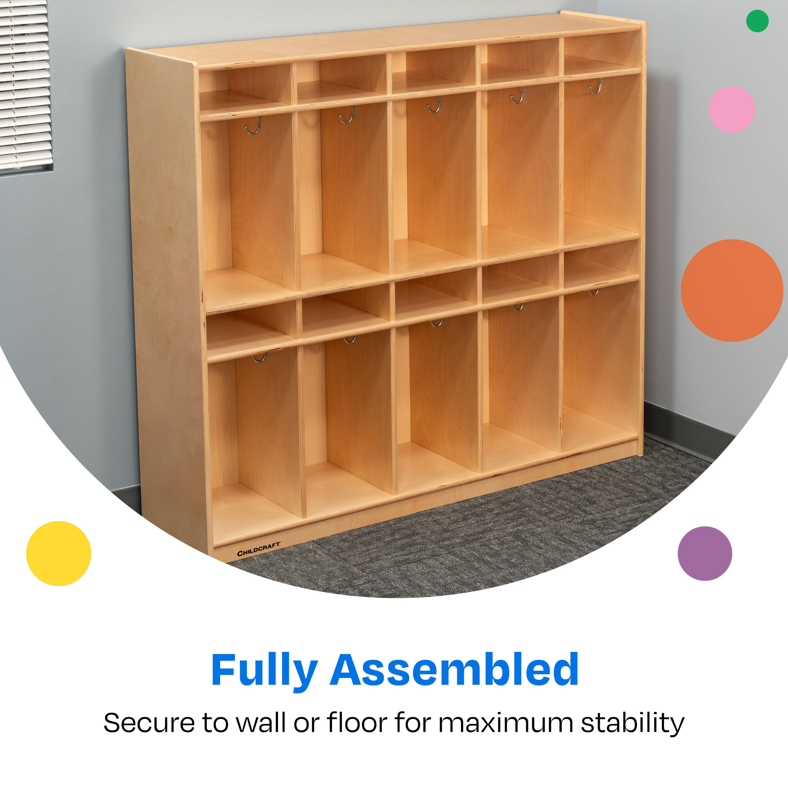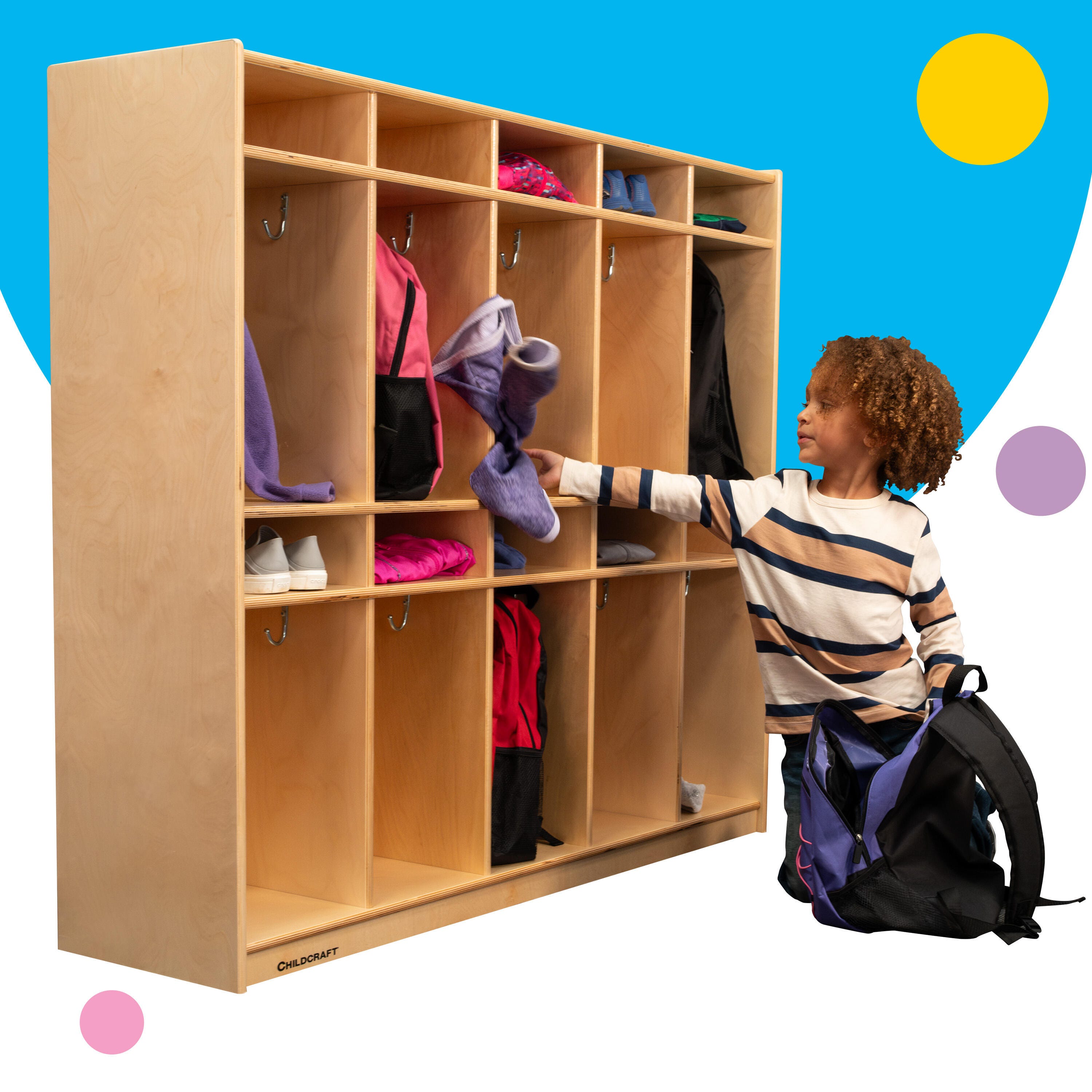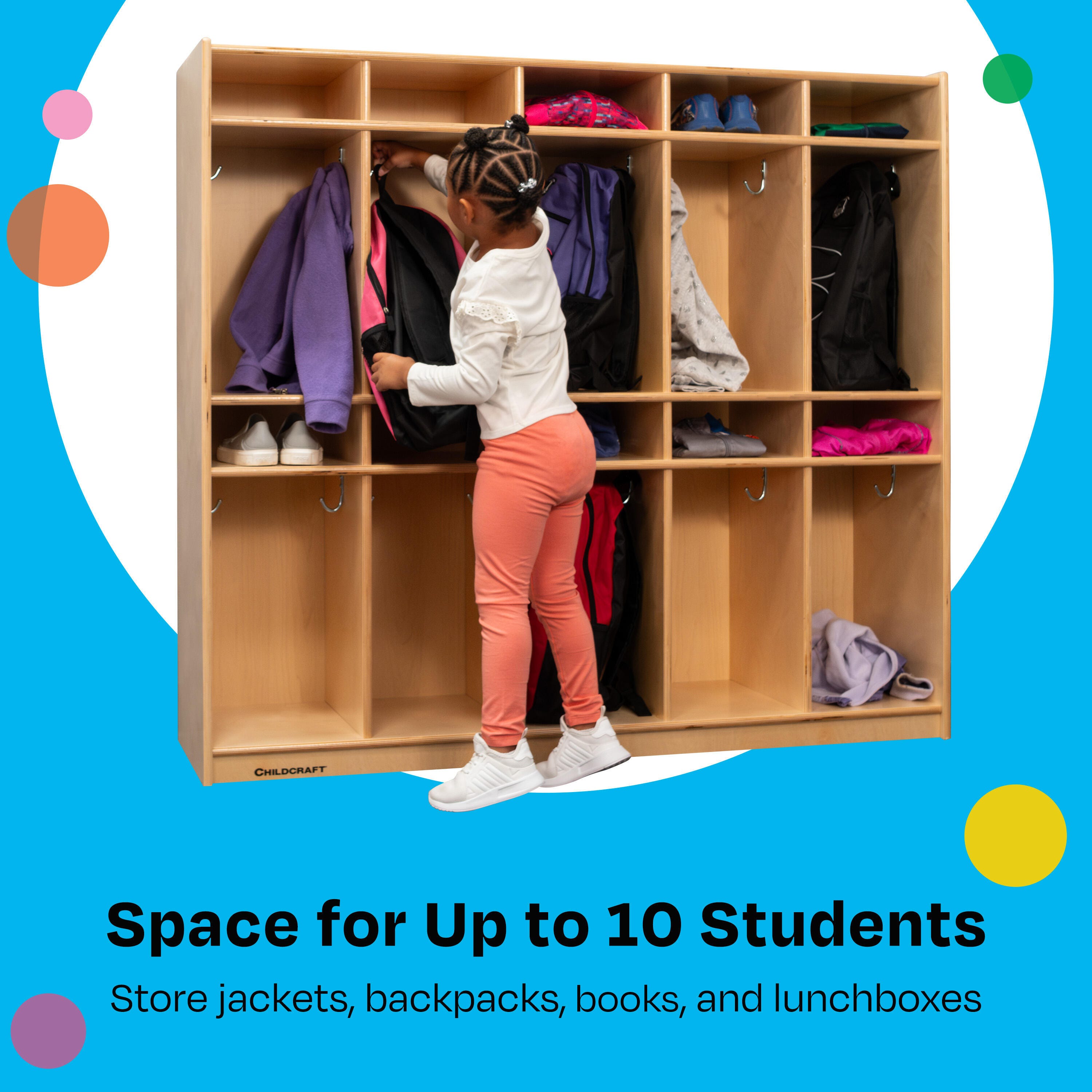 Childcraft® Coat Locker with Book Shelves simplifies organization for classrooms with an open locker design. The wooden shelf is perfect for preschool, kindergarten, daycare centers, homes, and beyond. Each spacious locker section has two aluminum hooks along with upper and middle compartments for extra storage space. One wooden locker unit accommodates up to 10 students. For best results and maximum stability, secure the shelf to the wall or floor. It is not recommended as a room divider. Crafted for long-lasting use, this classroom furniture piece is made of durable birch plywood that’s easy to wipe clean. Comes fully assembled. This item comes with a Limited Lifetime Warranty. This coat locker measures 53-3/4 W x 14-1/4 D x 48 H inches; each locker cubby measures 10 W x 13 D x 4 H inches.