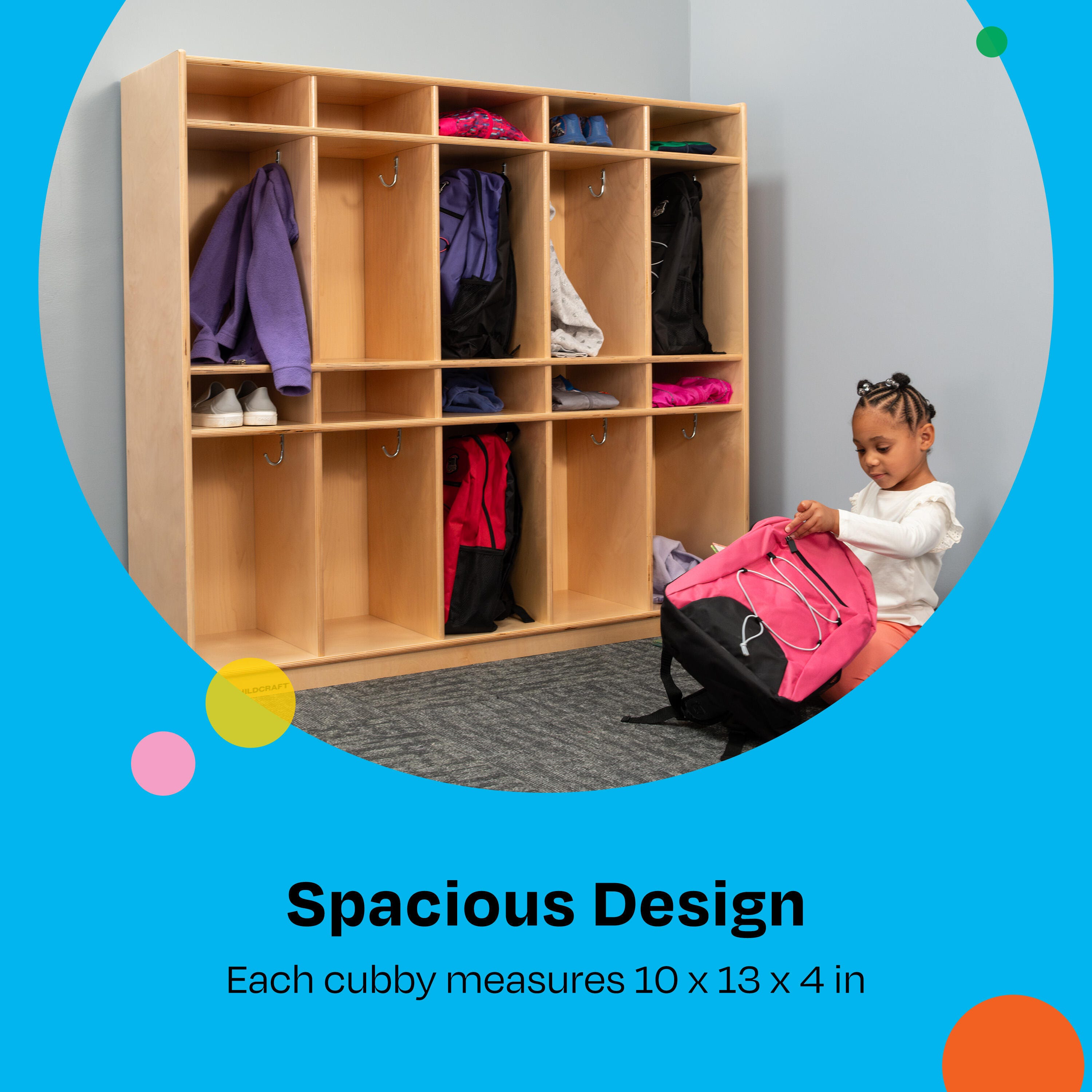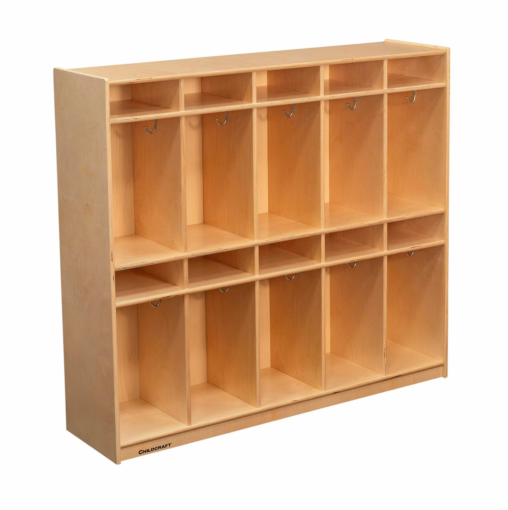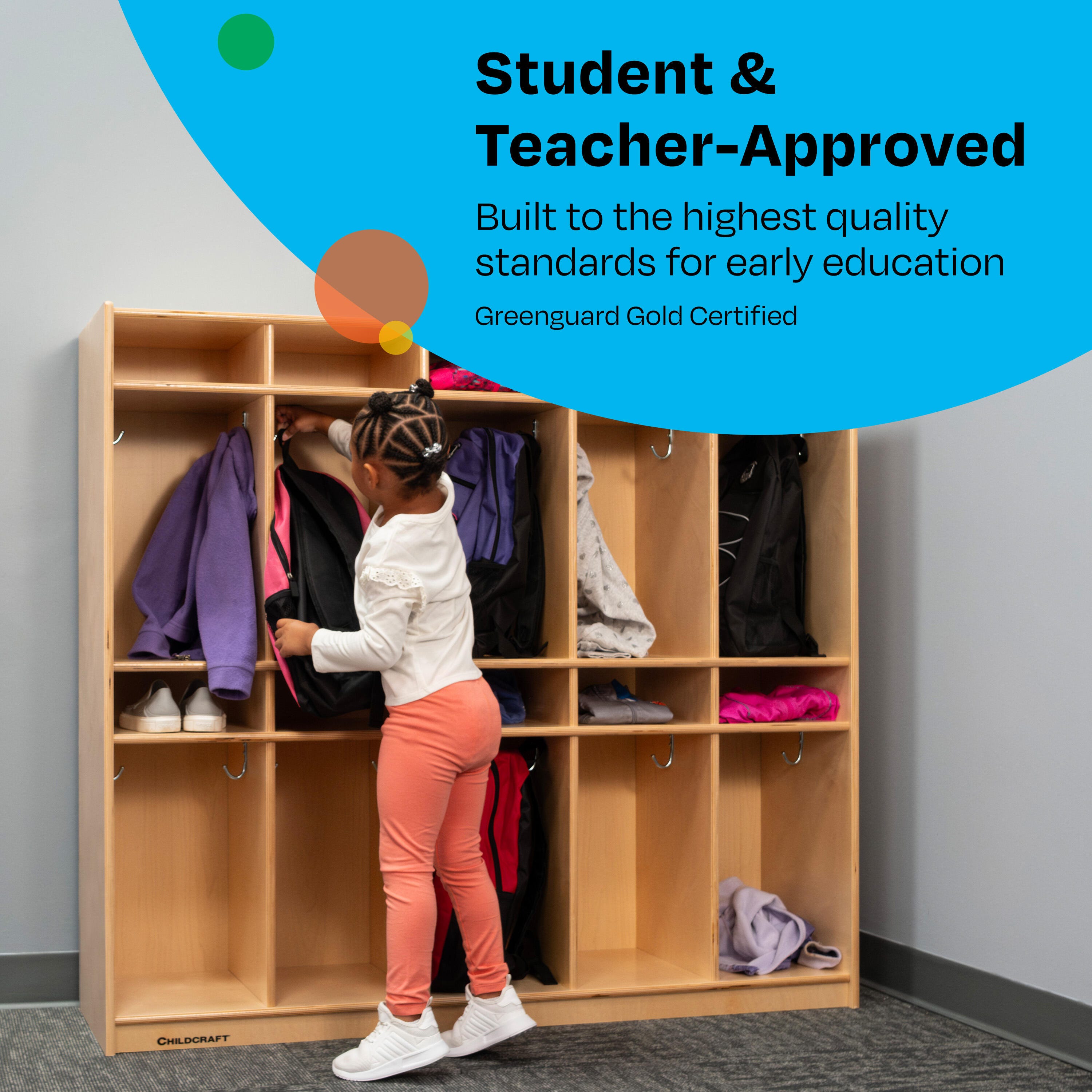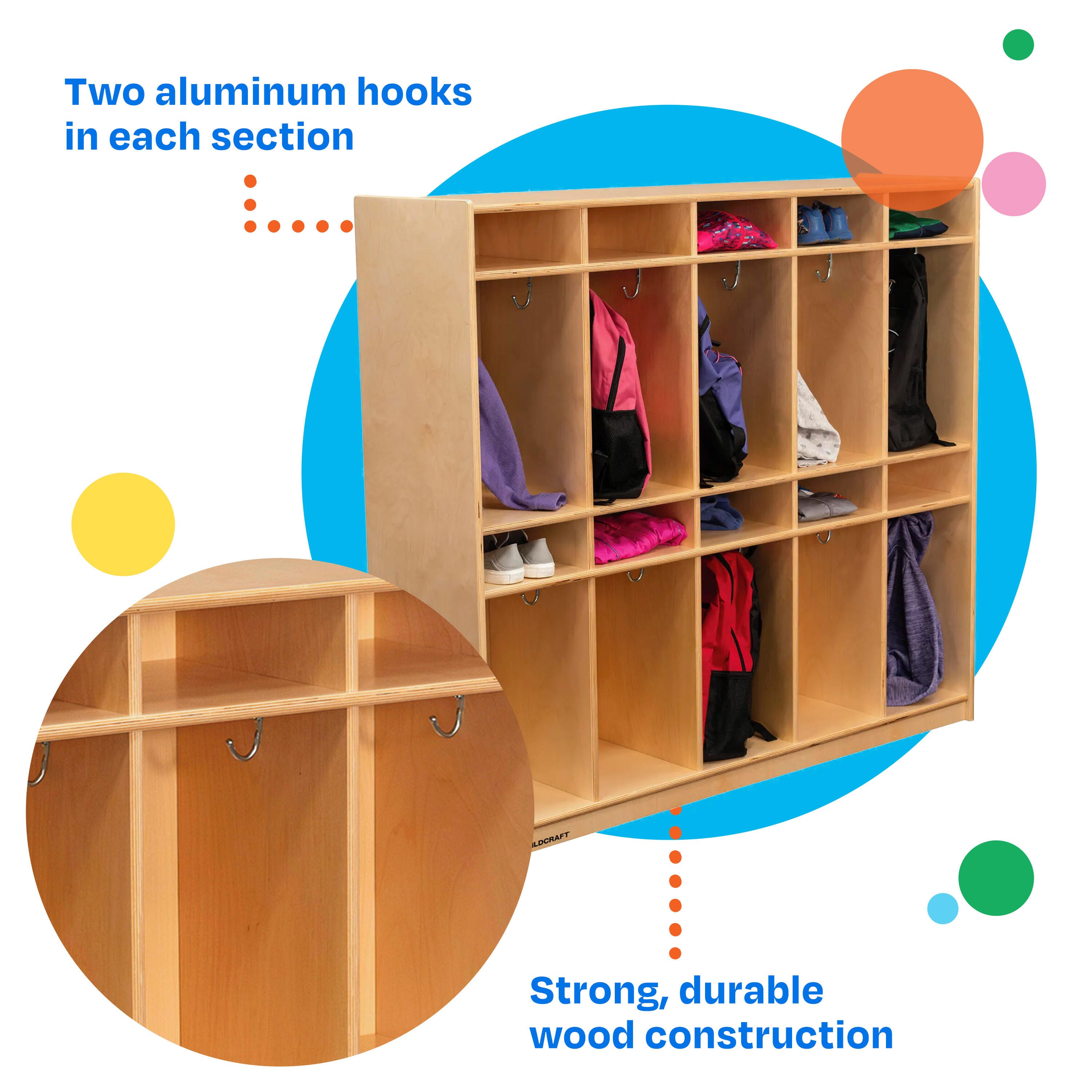 Childcraft® Coat Locker with Book Shelves simplifies organization for classrooms with an open locker design. The wooden shelf is perfect for preschool, kindergarten, daycare centers, homes, and beyond. Each spacious locker section has two aluminum hooks along with upper and middle compartments for extra storage space. One wooden locker unit accommodates up to 10 students. For best results and maximum stability, secure the shelf to the wall or floor. It is not recommended as a room divider. Crafted for long-lasting use, this classroom furniture piece is made of durable birch plywood that’s easy to wipe clean. Comes fully assembled. This item comes with a Limited Lifetime Warranty. This coat locker measures 53-3/4 W x 14-1/4 D x 48 H inches; each locker cubby measures 10 W x 13 D x 4 H inches.