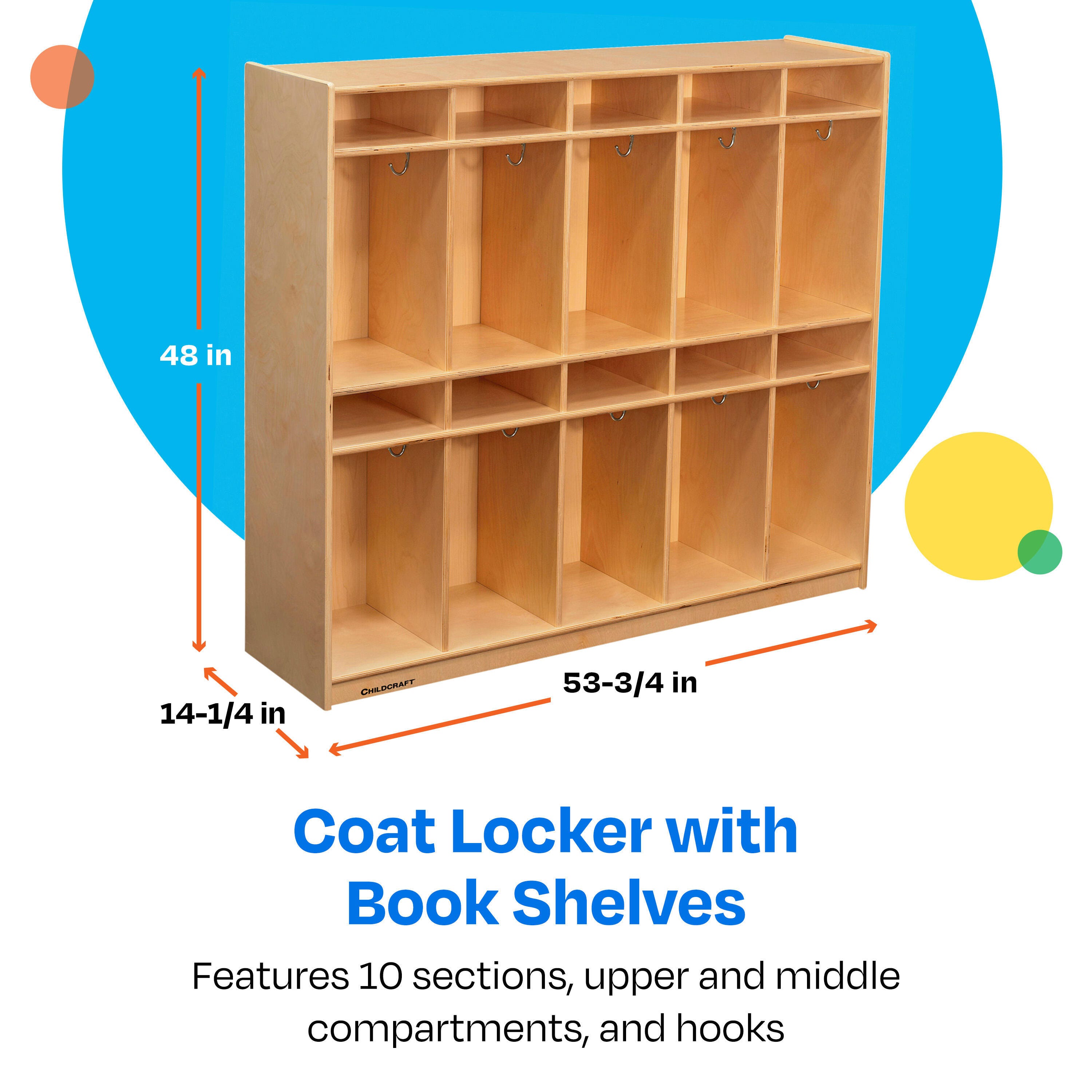 Childcraft Coat Locker with Book Shelves, 10 Sections, Wooden, 53-3/4 x 14-1/4 x 48 Inches