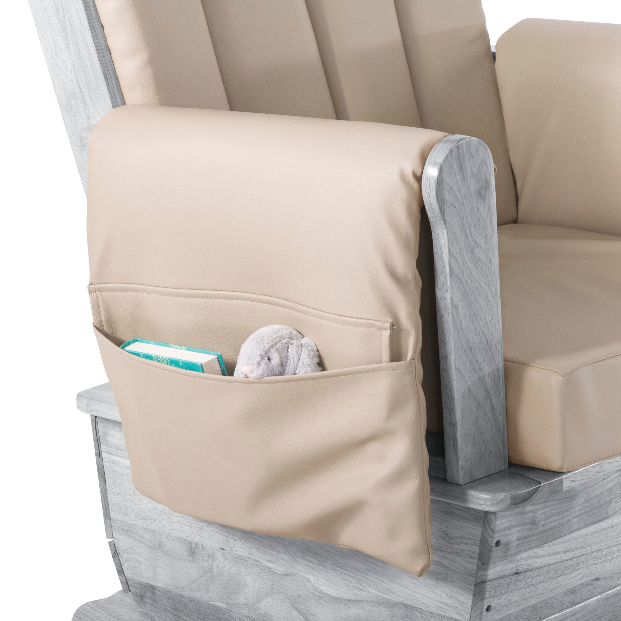 Foundations SafeRocker Glider Rocker Replacement Cushion Set features a tan vinyl material for easy cleanup. Wide seating surface with high-density foam cushions provide comfort for both caregiver and child. Arm covers have extra-large storage pockets. The seat pad measures 19-1/2 x 19-1/2 x 3-3/4 inches. The seat back measures 27 x 24 x 1-3/4 inches. The arm pad measures 34-1/2 x 14-1/2 x 3/4 inches.Features