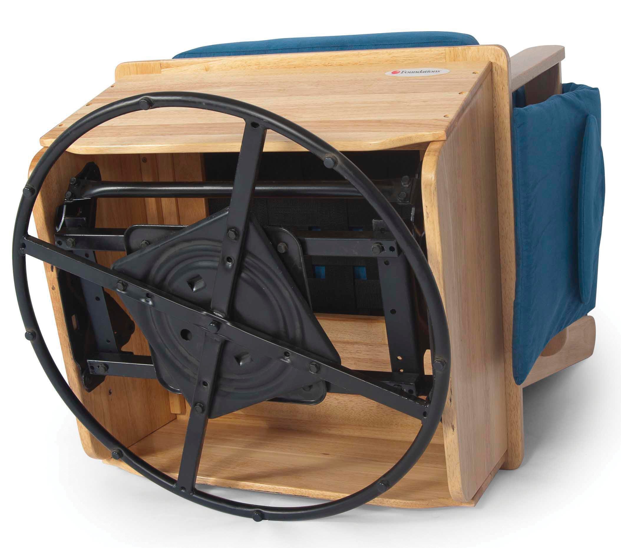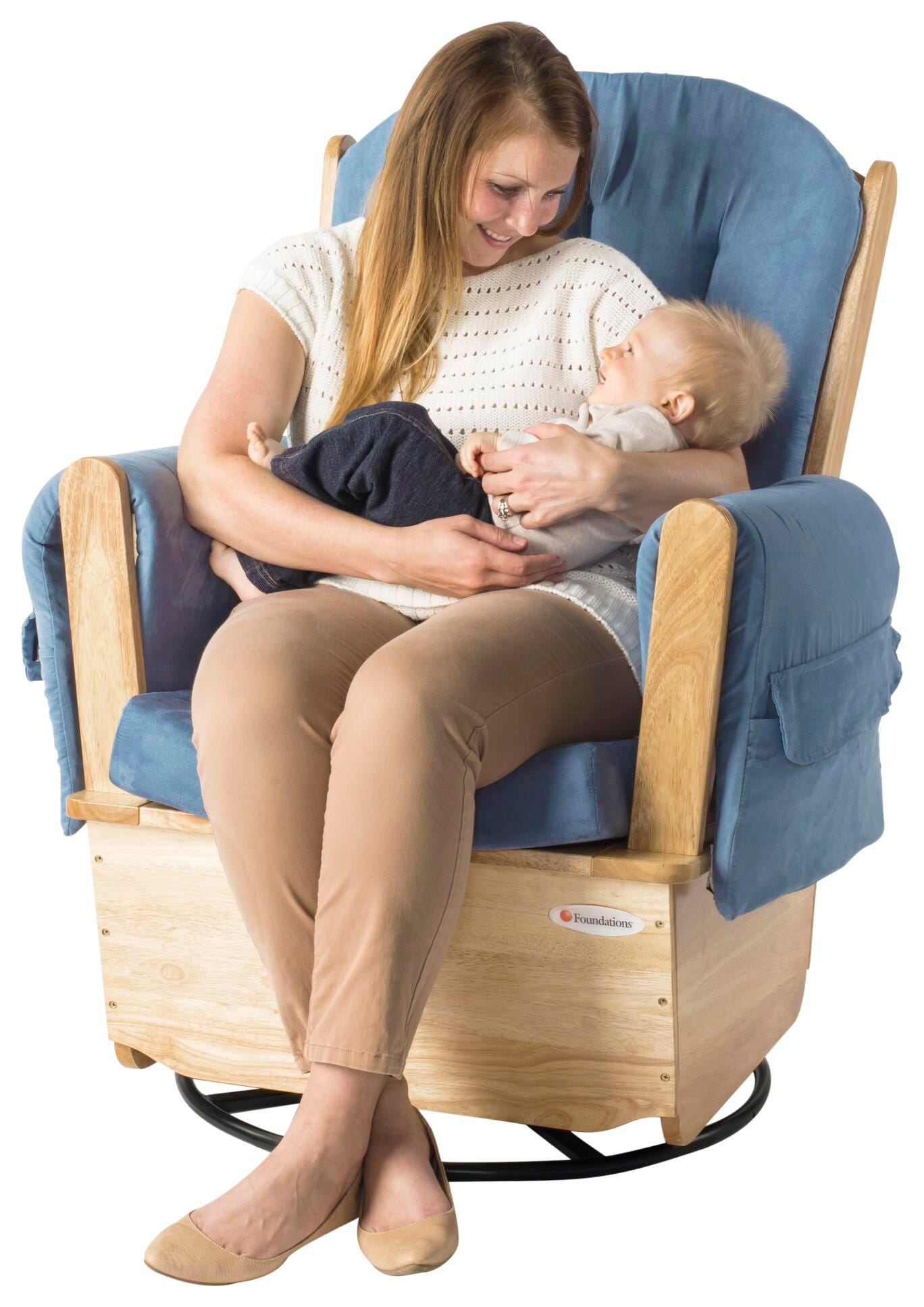 Foundations SafeRocker Swivel Glider with Extra Wide Seat features a steel gliding mechanism that provides unprecedented durability. This is the only authentic commercial glider that can withstand the demands of a childcare environment. Glider has an extra wide seating with extra thick, high-density-foam cushions in blue, to provide the ultimate comfort for both caregiver and child. Base is fully enclosed so that it keeps the children away from the mechanism. extra-large, storage pockets on the arm covers help to keep supplies close at hand while offering easy laundering as the ultra-durable microfiber material cover and arm-rests are removable. Glider comes with an additional swivel action allows for superior maneuverability.