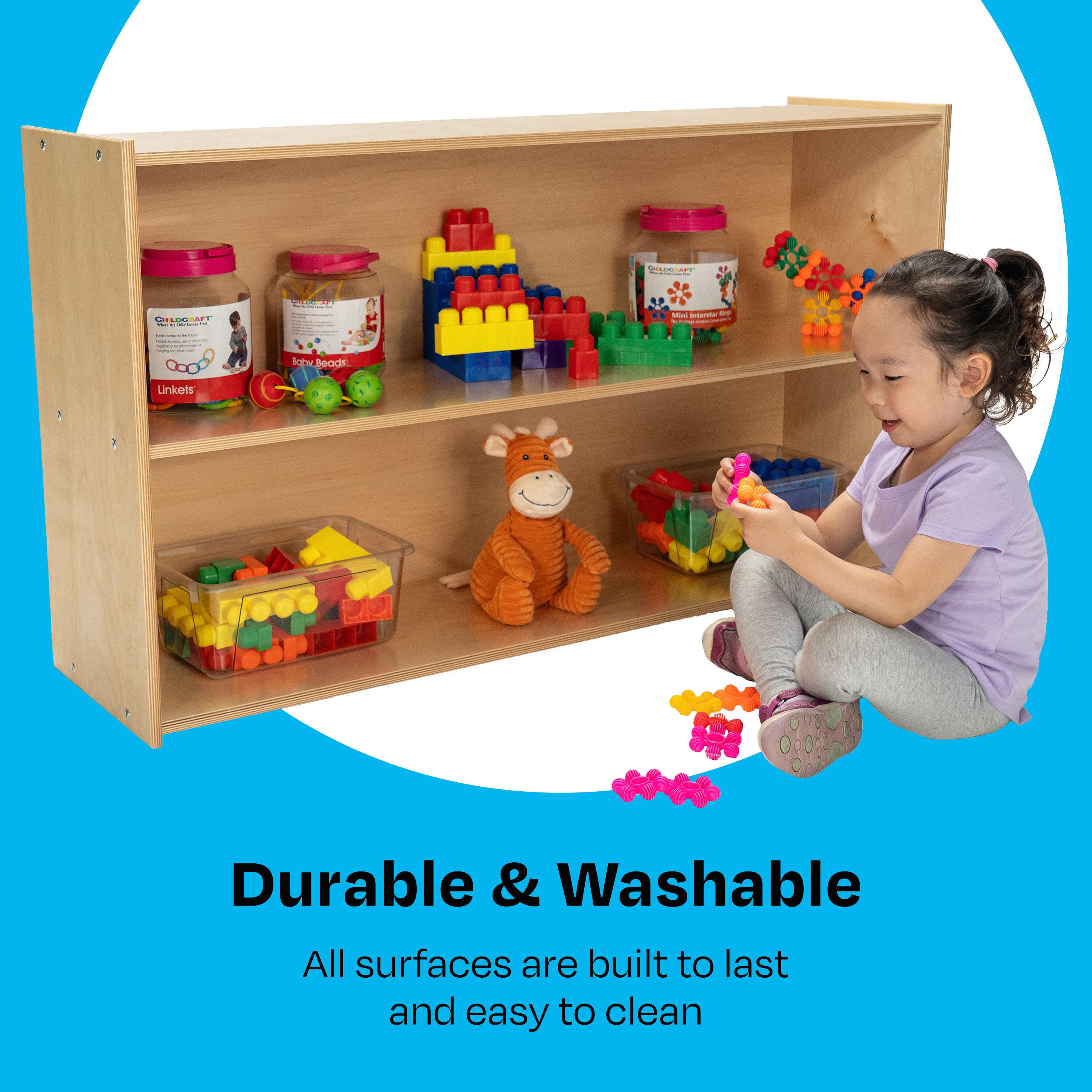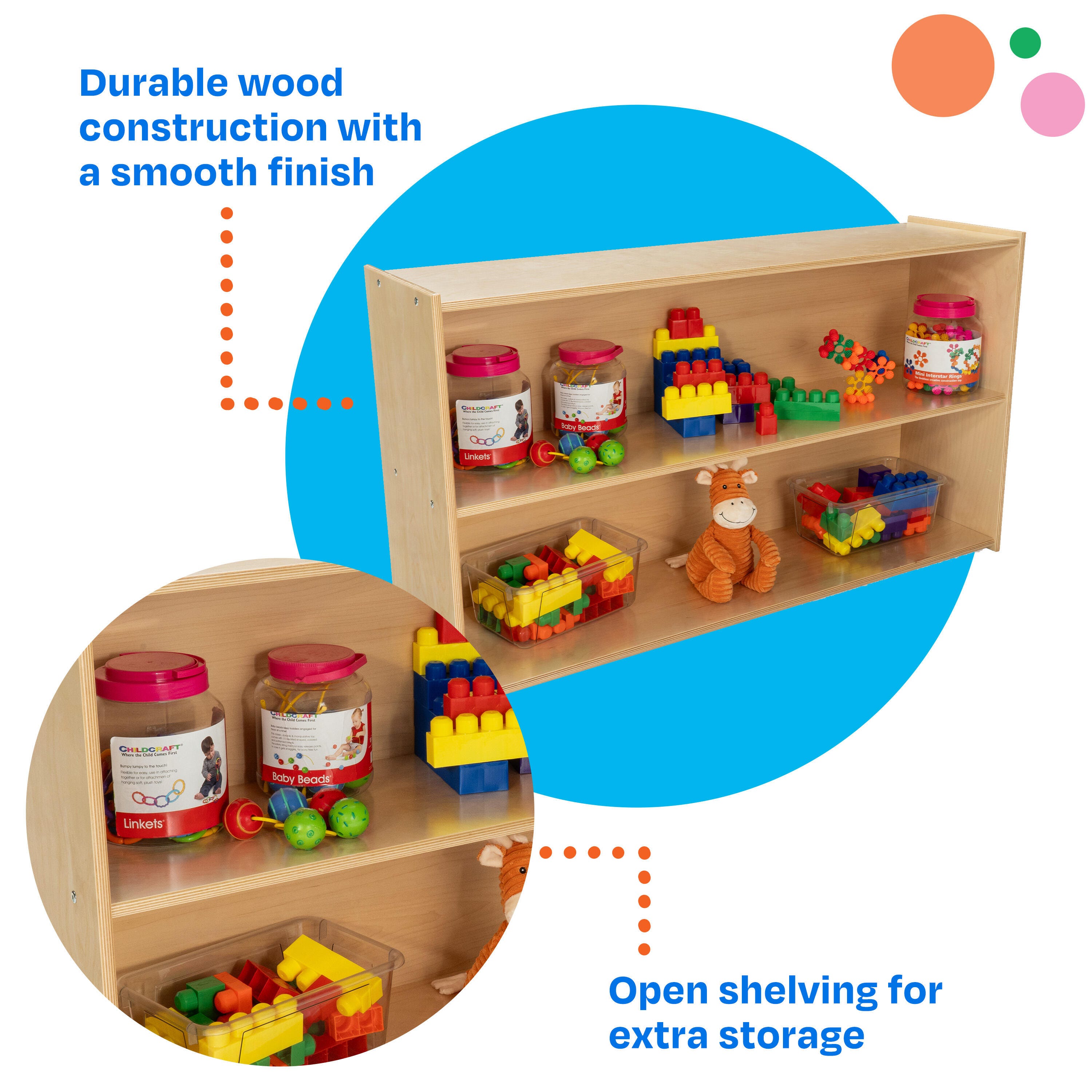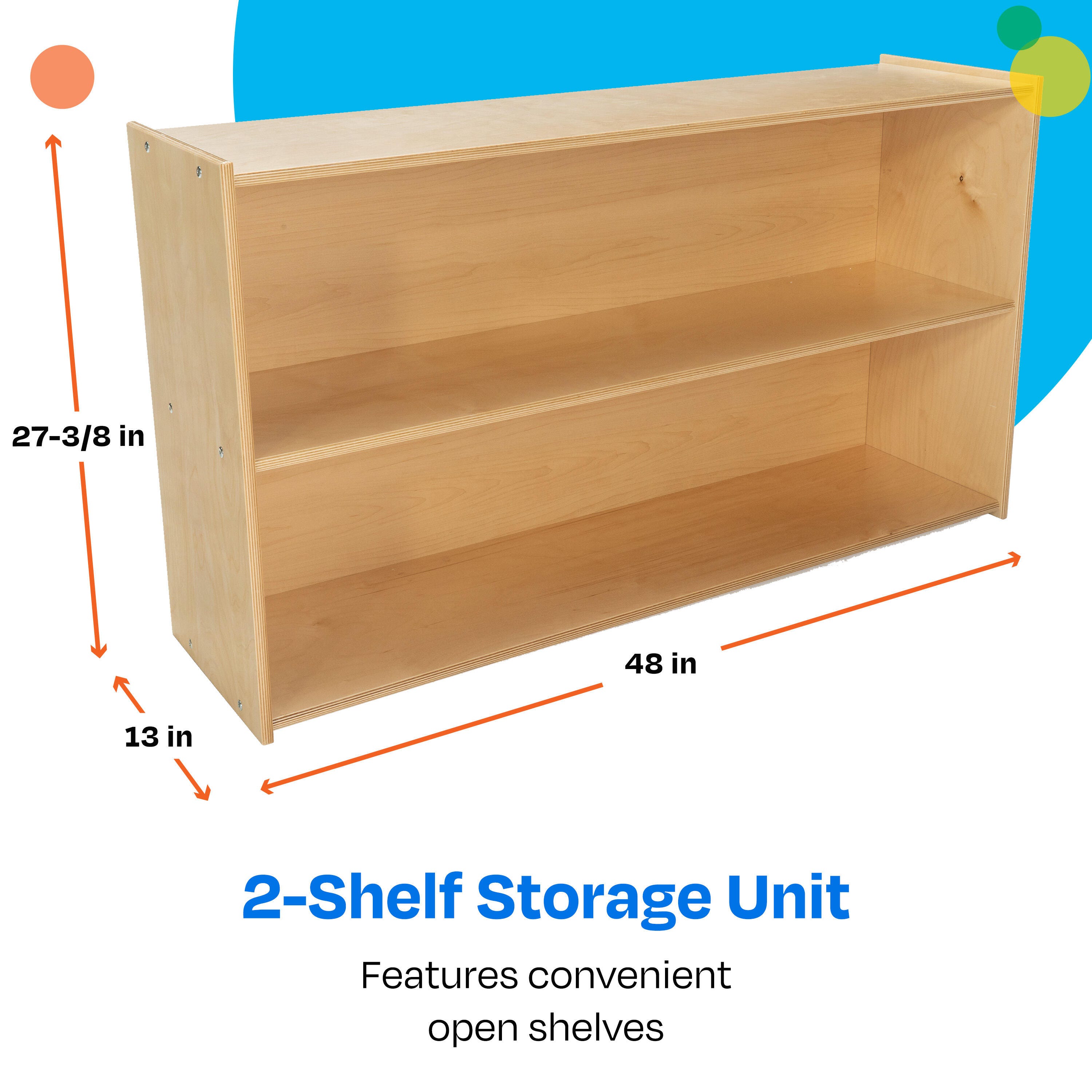 Childcraft® 2-Shelf Storage Unit for Classrooms is easy to assemble and made with a durable design. Use the toddler-height wooden shelves for preschool, kindergarten, daycare centers, homes, and beyond. A shorter design is the ideal height for young children. The storage shelves are great for storing and organizing games, books, and manipulatives. Crafted for long-lasting use, this classroom furniture piece is made of durable birch plywood that’s easy to wipe clean. Assembly is required. This short bookcase measures 48 W x 13 D x 27-3/8 H inches.