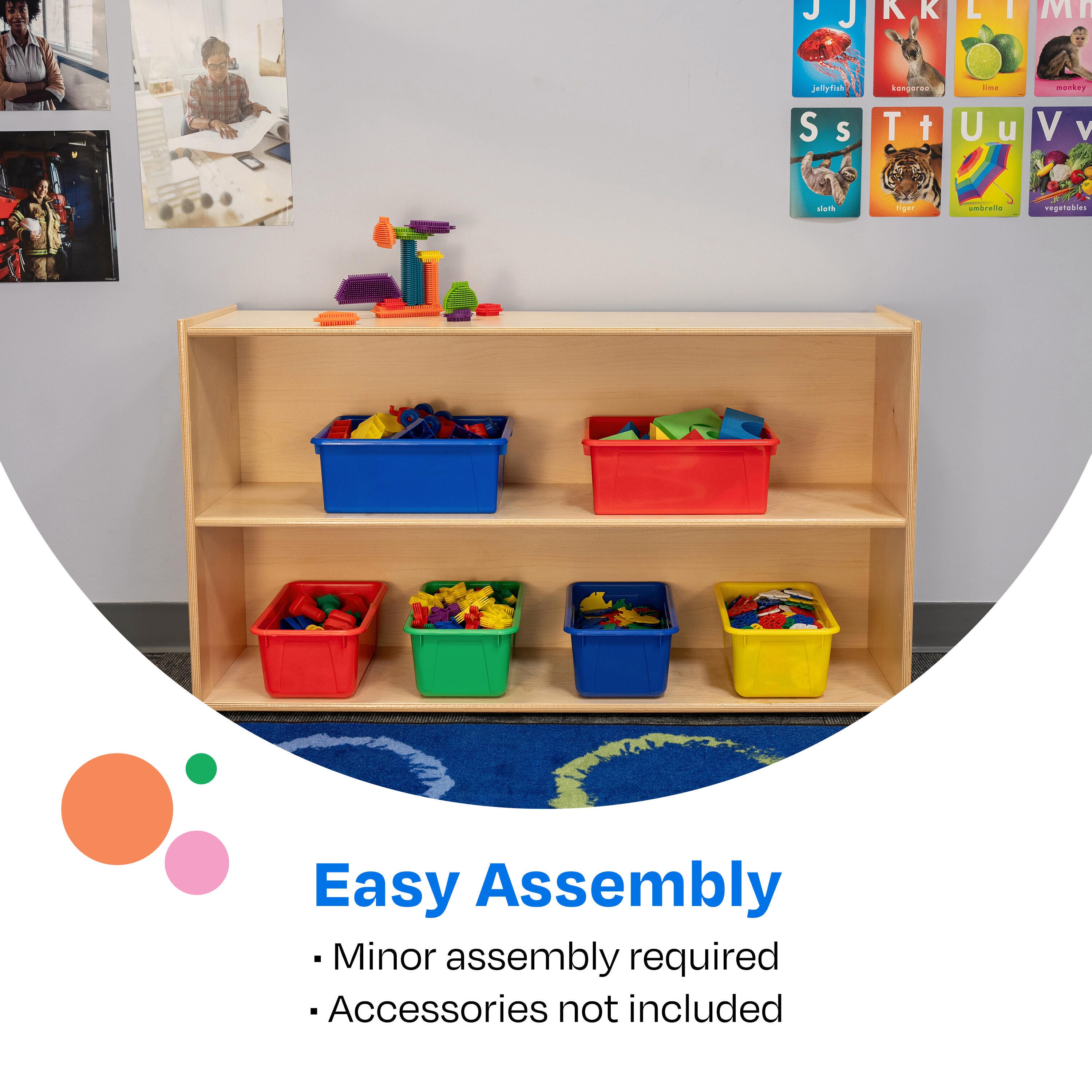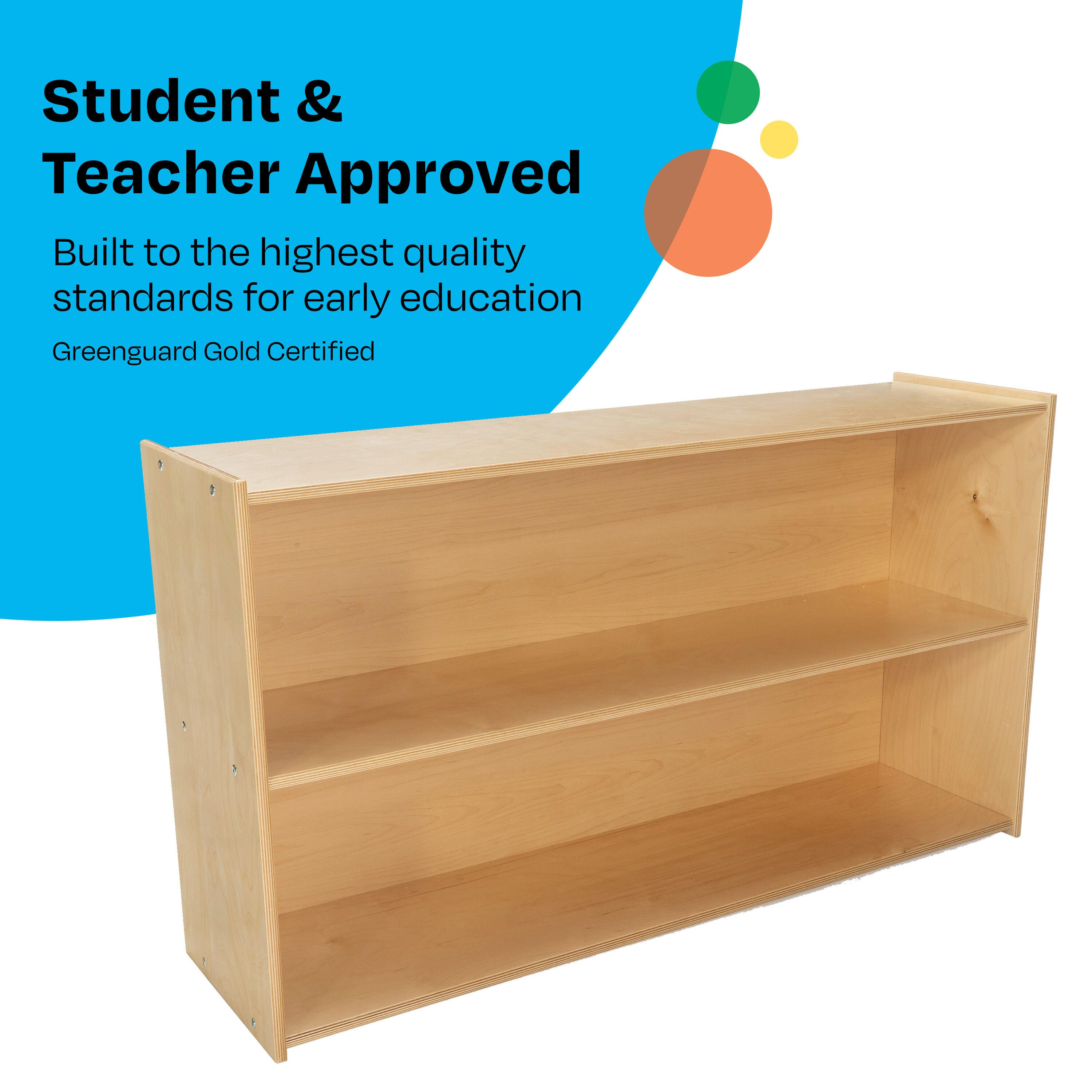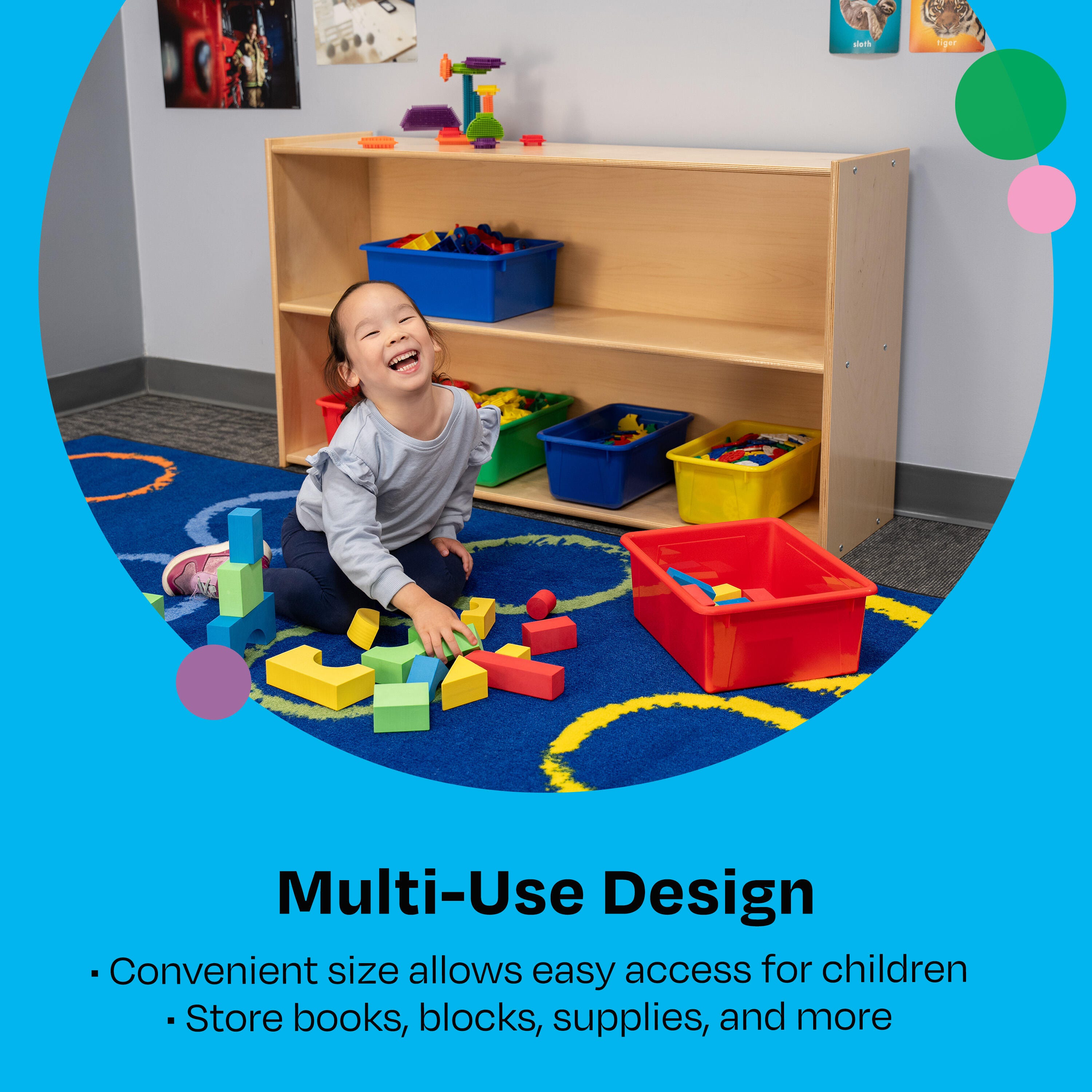 Childcraft® 2-Shelf Storage Unit for Classrooms is easy to assemble and made with a durable design. Use the toddler-height wooden shelves for preschool, kindergarten, daycare centers, homes, and beyond. A shorter design is the ideal height for young children. The storage shelves are great for storing and organizing games, books, and manipulatives. Crafted for long-lasting use, this classroom furniture piece is made of durable birch plywood that’s easy to wipe clean. Assembly is required. This short bookcase measures 48 W x 13 D x 27-3/8 H inches.