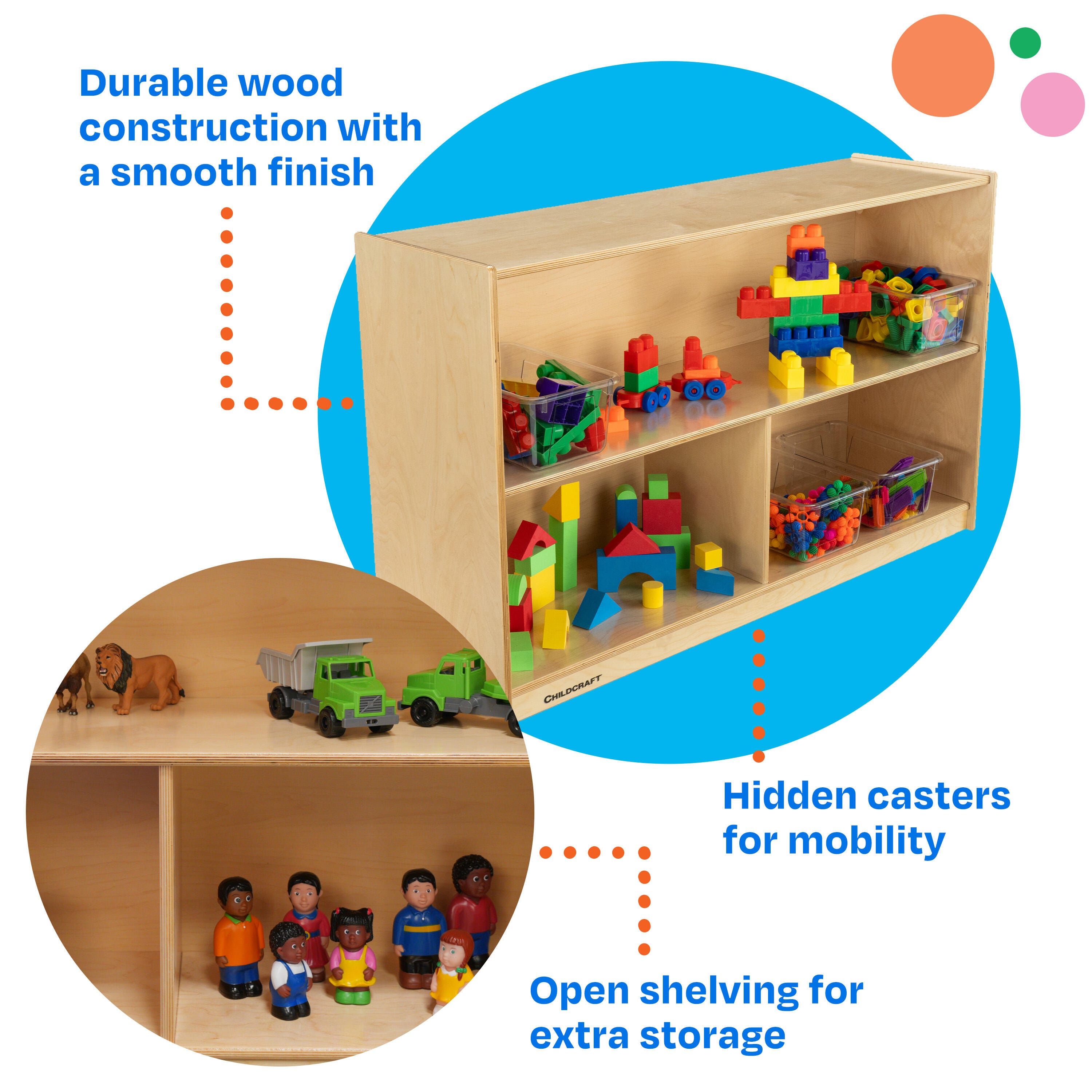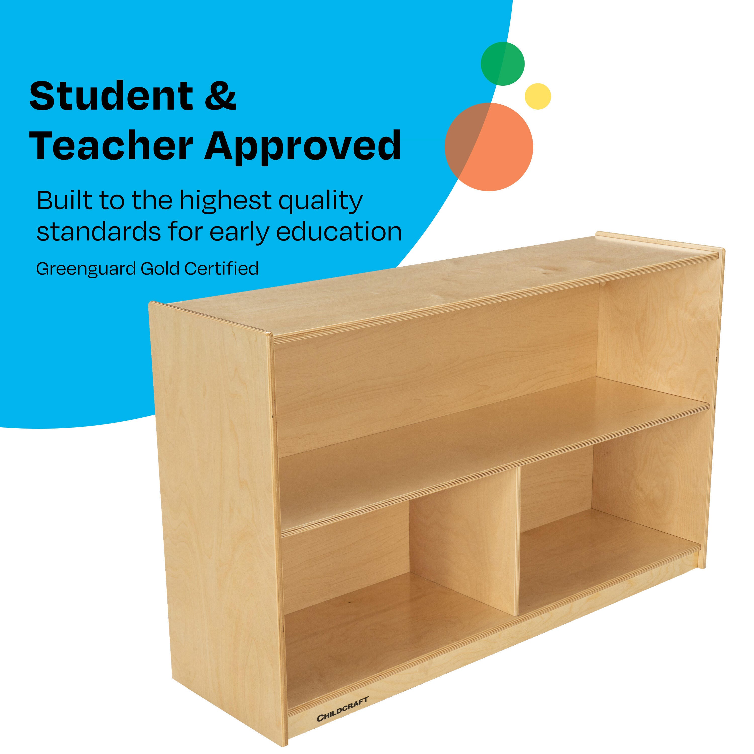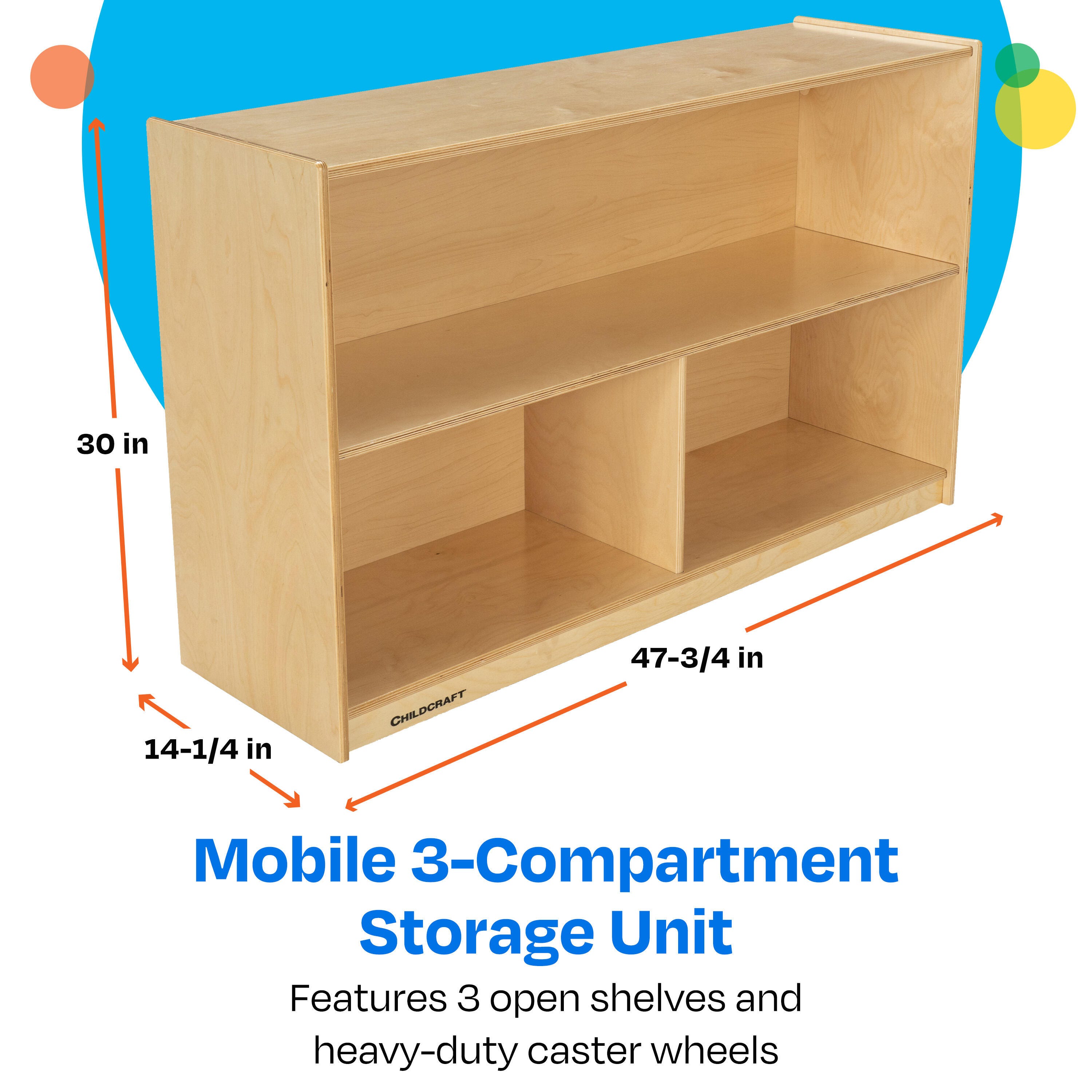 Childcraft® Mobile 3-Compartment Storage Unit for Classrooms simplifies organization. Use the wooden shelf on wheels for preschool, kindergarten, daycare centers, homes, and beyond. The convenient storage shelves are great for storing and organizing books, blocks, games, and manipulatives, keeping them neat and accessible for students. Crafted for long-lasting use, this classroom furniture piece is made of durable birch plywood that’s easy to wipe clean. Comes fully assembled. This classroom bookcase measures 47-3/4 W x 14-1/4 D x 30 H inches.