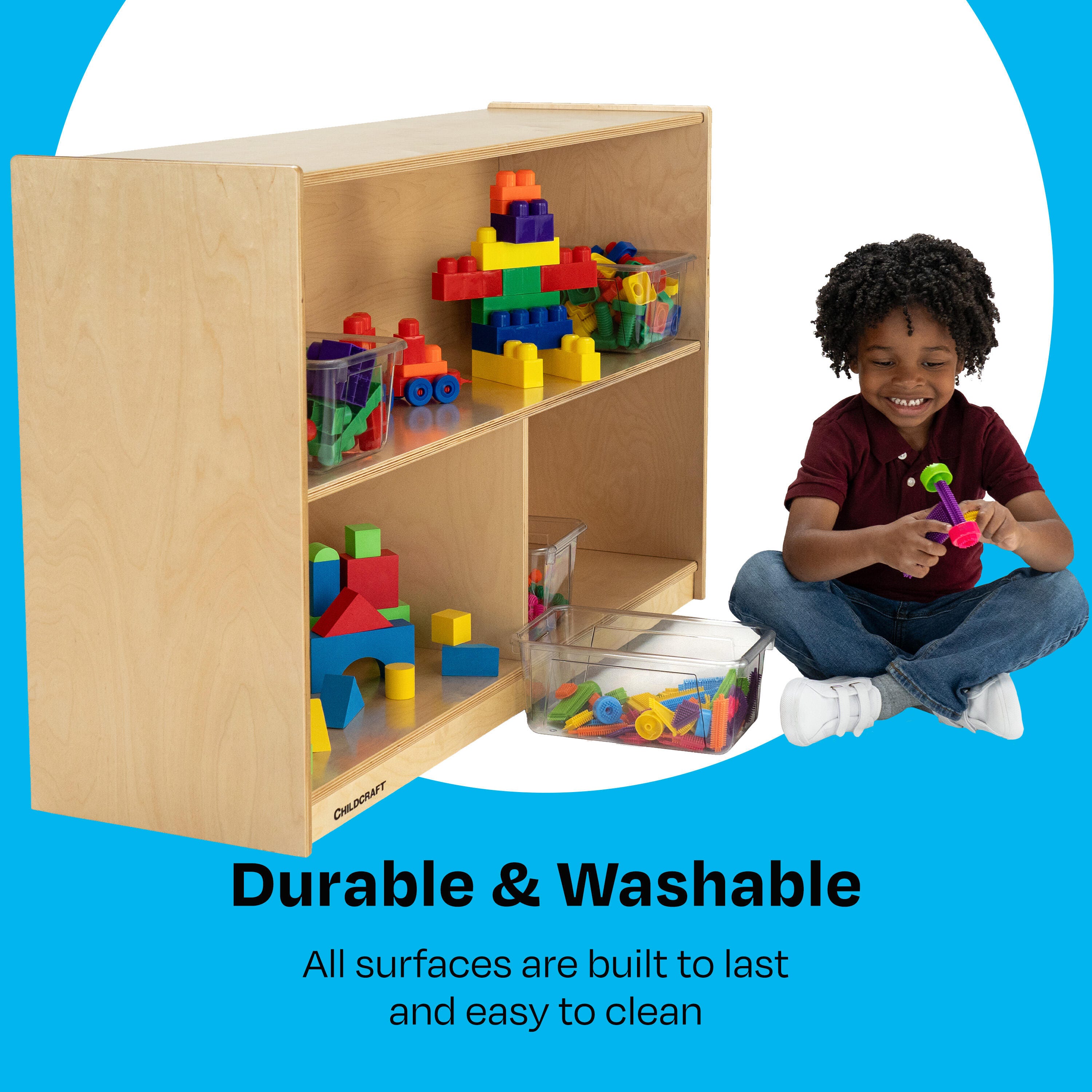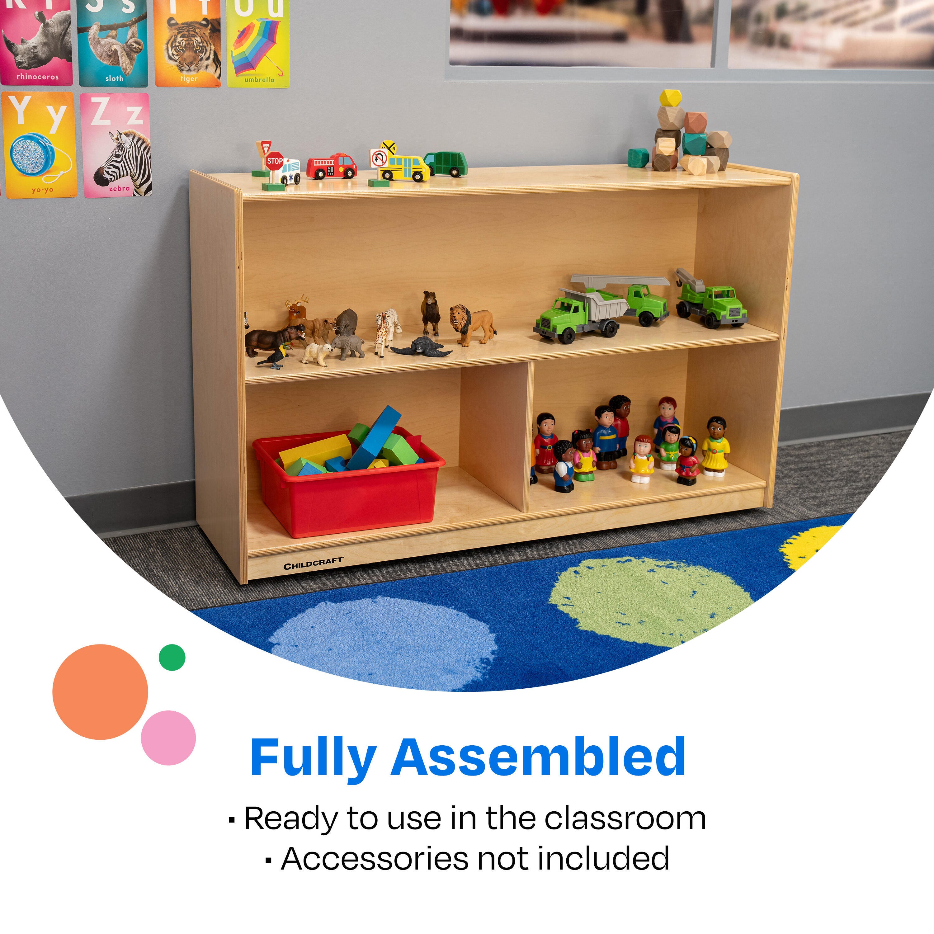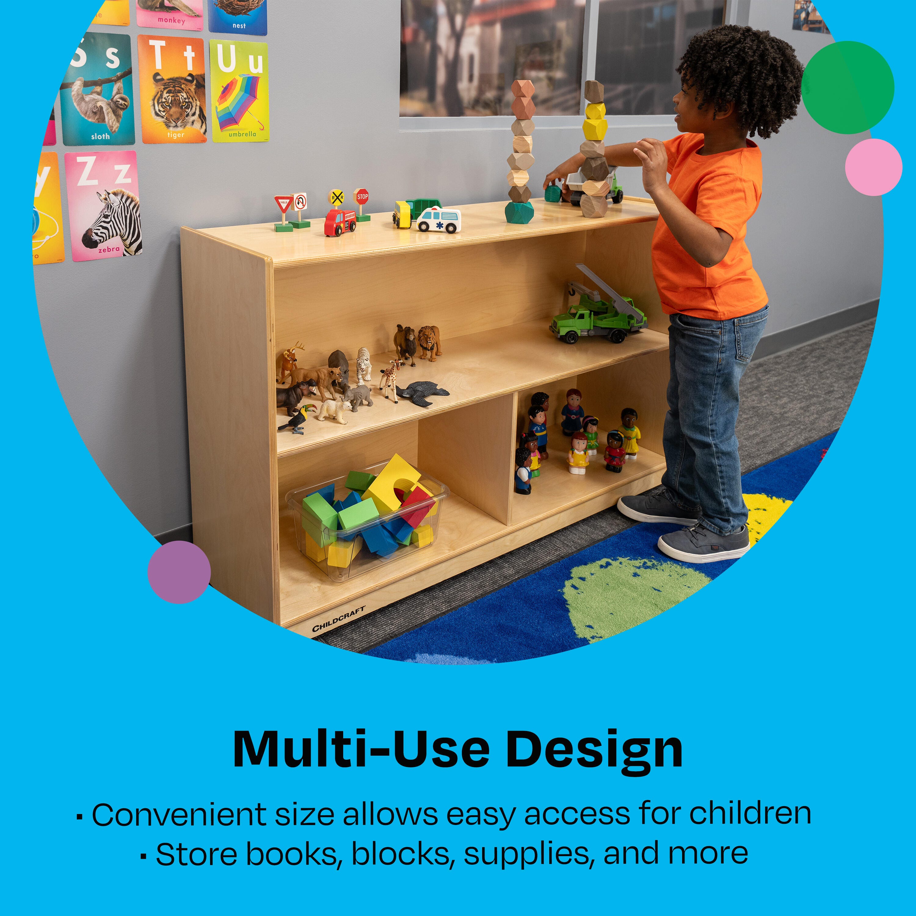 Childcraft® Mobile 3-Compartment Storage Unit for Classrooms simplifies organization. Use the wooden shelf on wheels for preschool, kindergarten, daycare centers, homes, and beyond. The convenient storage shelves are great for storing and organizing books, blocks, games, and manipulatives, keeping them neat and accessible for students. Crafted for long-lasting use, this classroom furniture piece is made of durable birch plywood that’s easy to wipe clean. Comes fully assembled. This classroom bookcase measures 47-3/4 W x 14-1/4 D x 30 H inches.