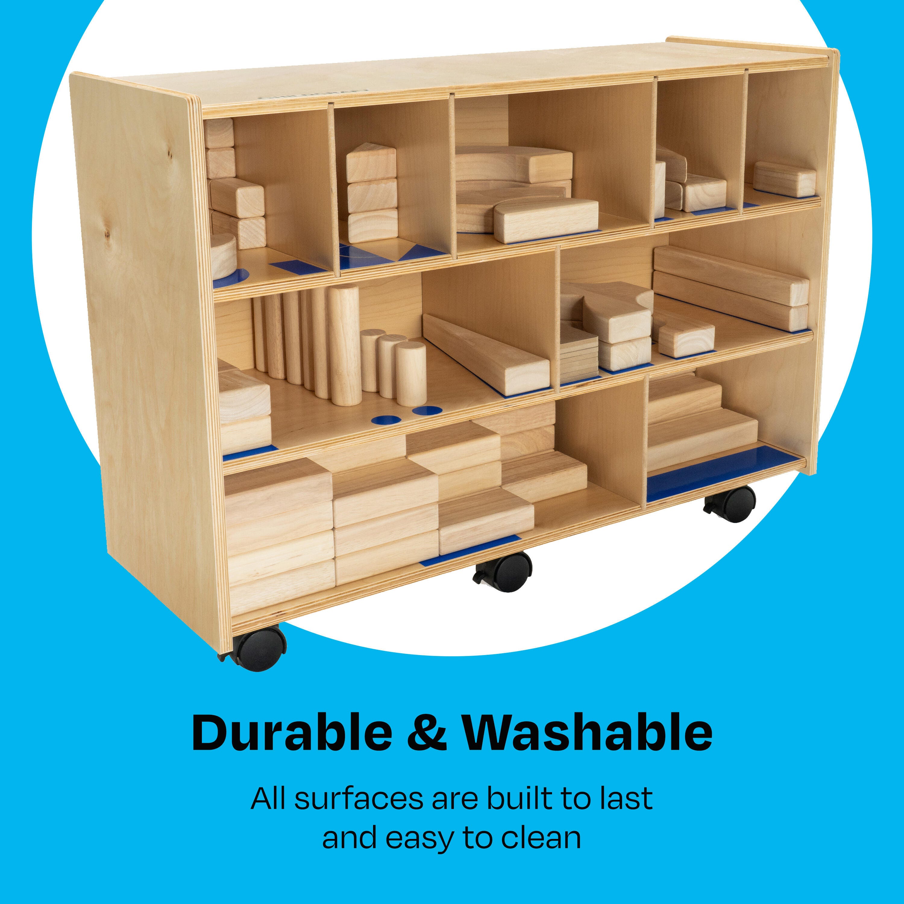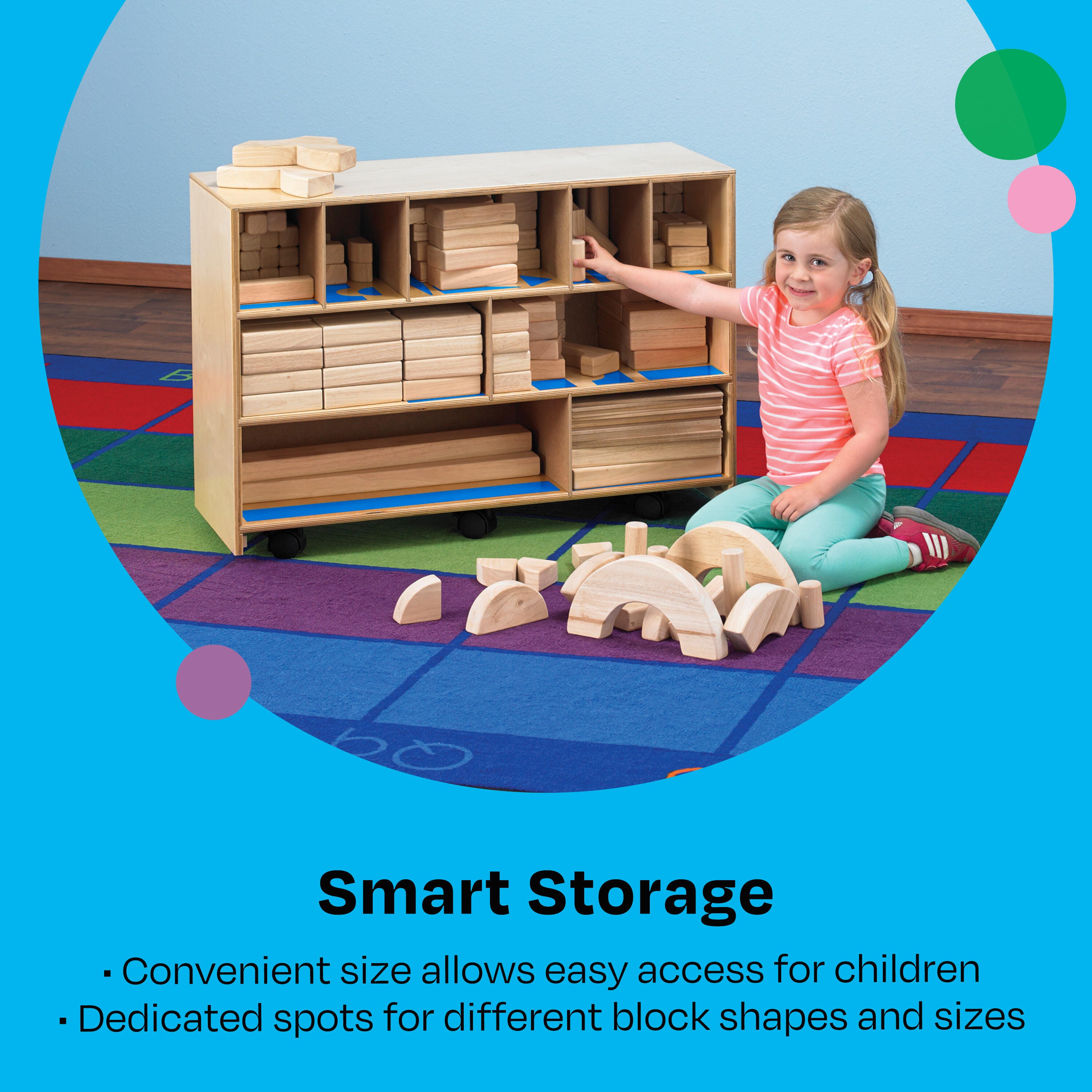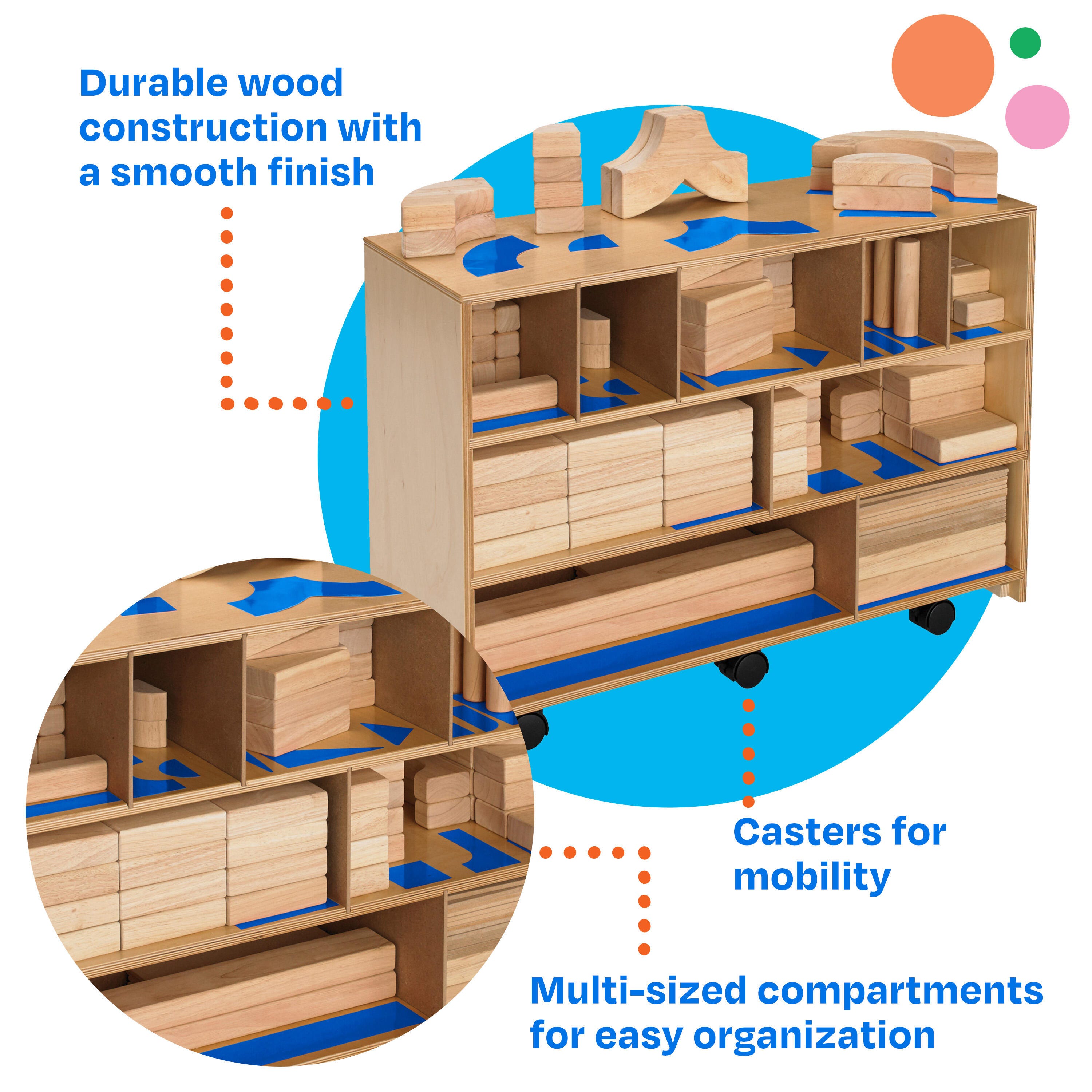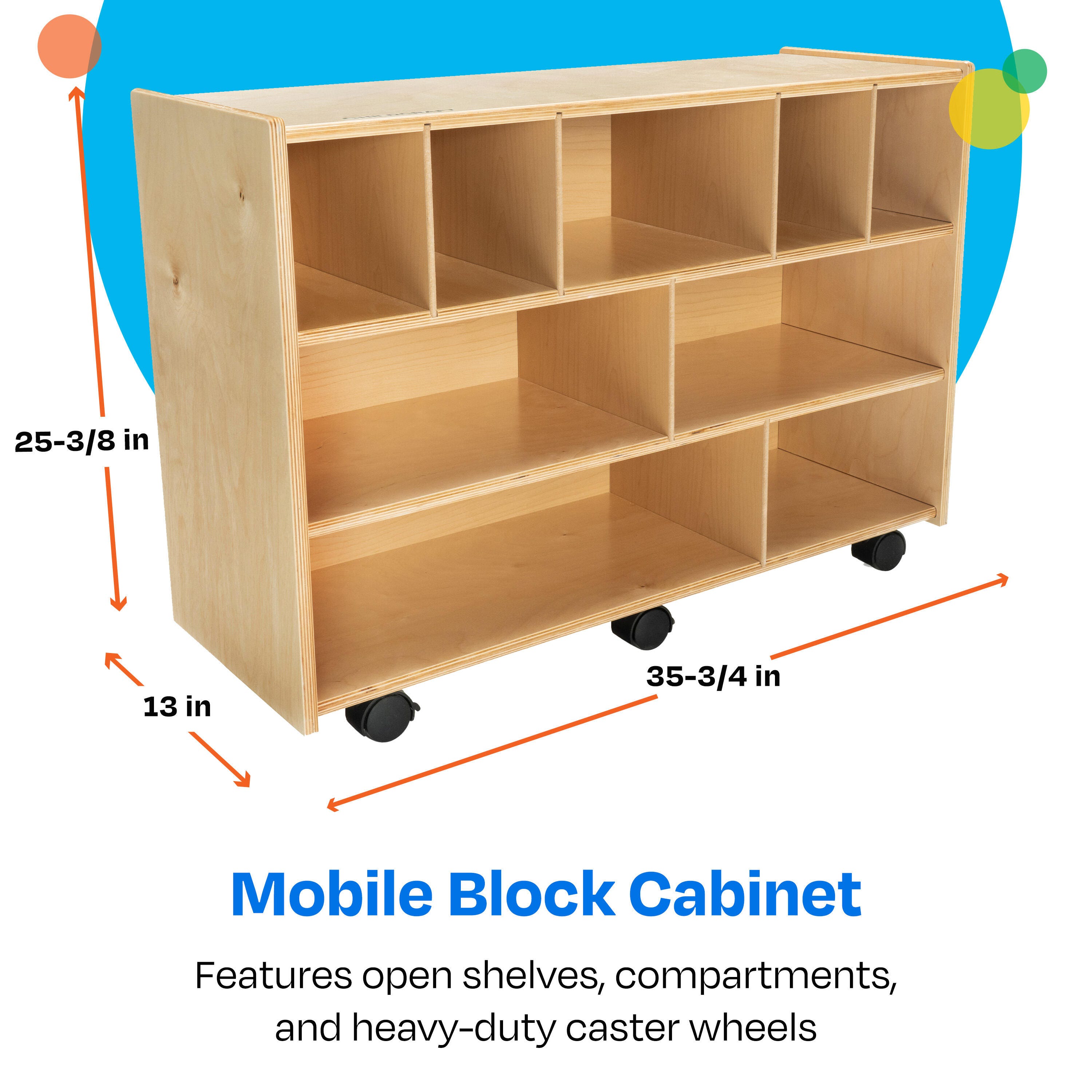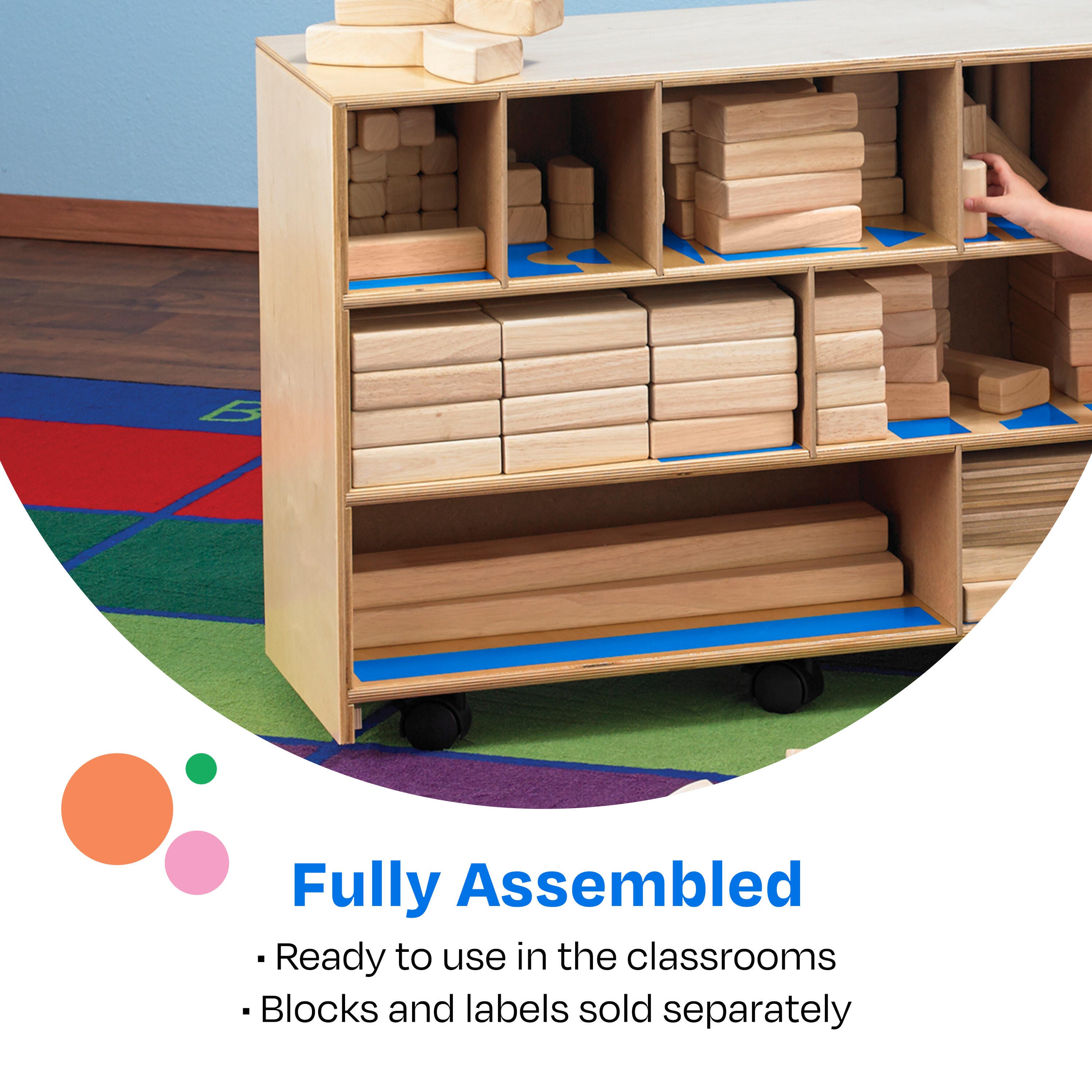 Childcraft® Mobile Block Cabinet helps keep blocks organized and easy to find for all ages. Designed for classrooms, daycare centers, and homes, this wooden cabinet features open shelves and multiple compartments. Storage for building blocks simplifies organization for different building block shapes and sizes, while fostering cognitive and spatial skills development. Lightweight blocks fit in the top compartments, while heavier ones can be stored at the bottom, ensuring stability and safety during movement. Comes fully assembled. This block storage cabinet measures 35-3/4 W x 13 D x 25-3/8 H inches.