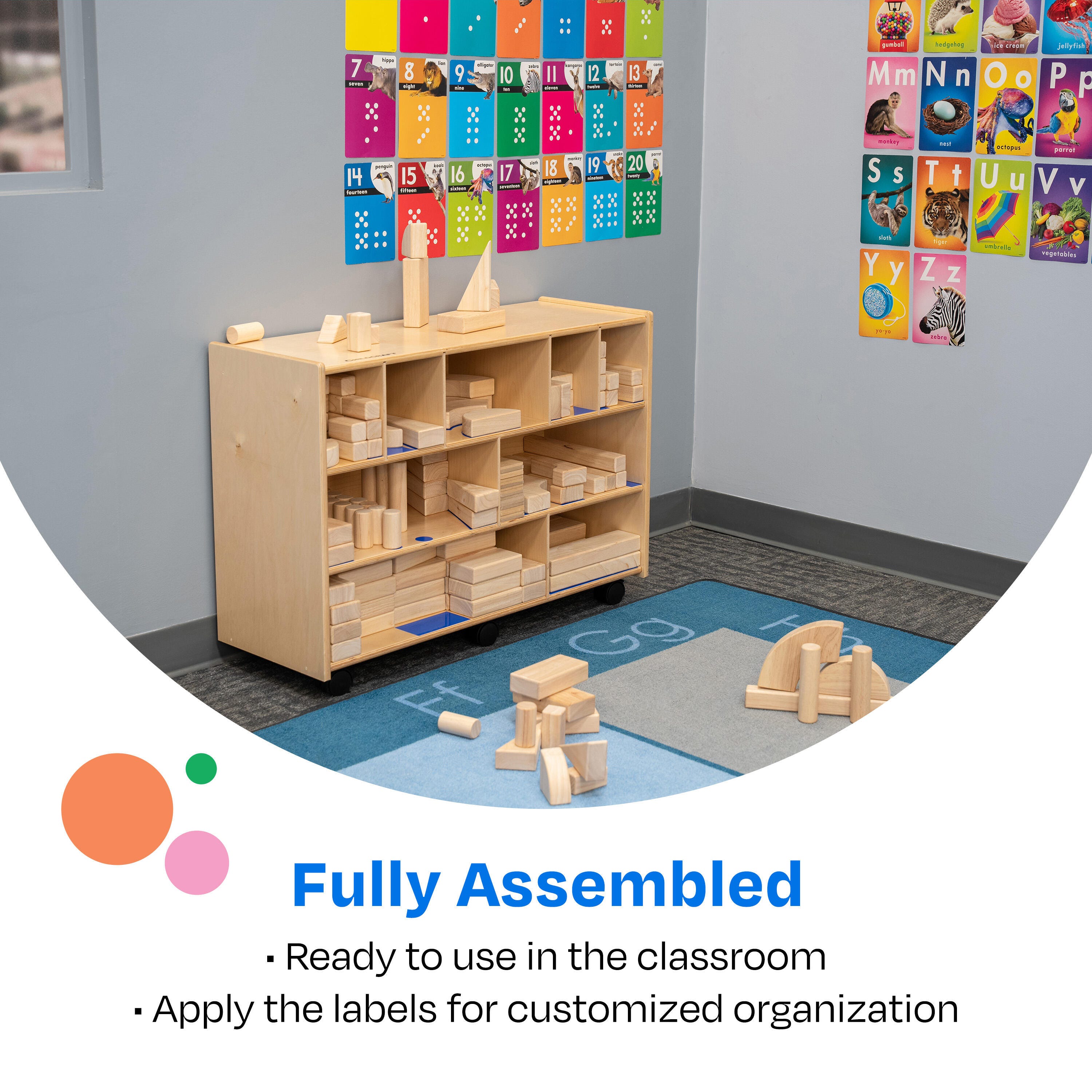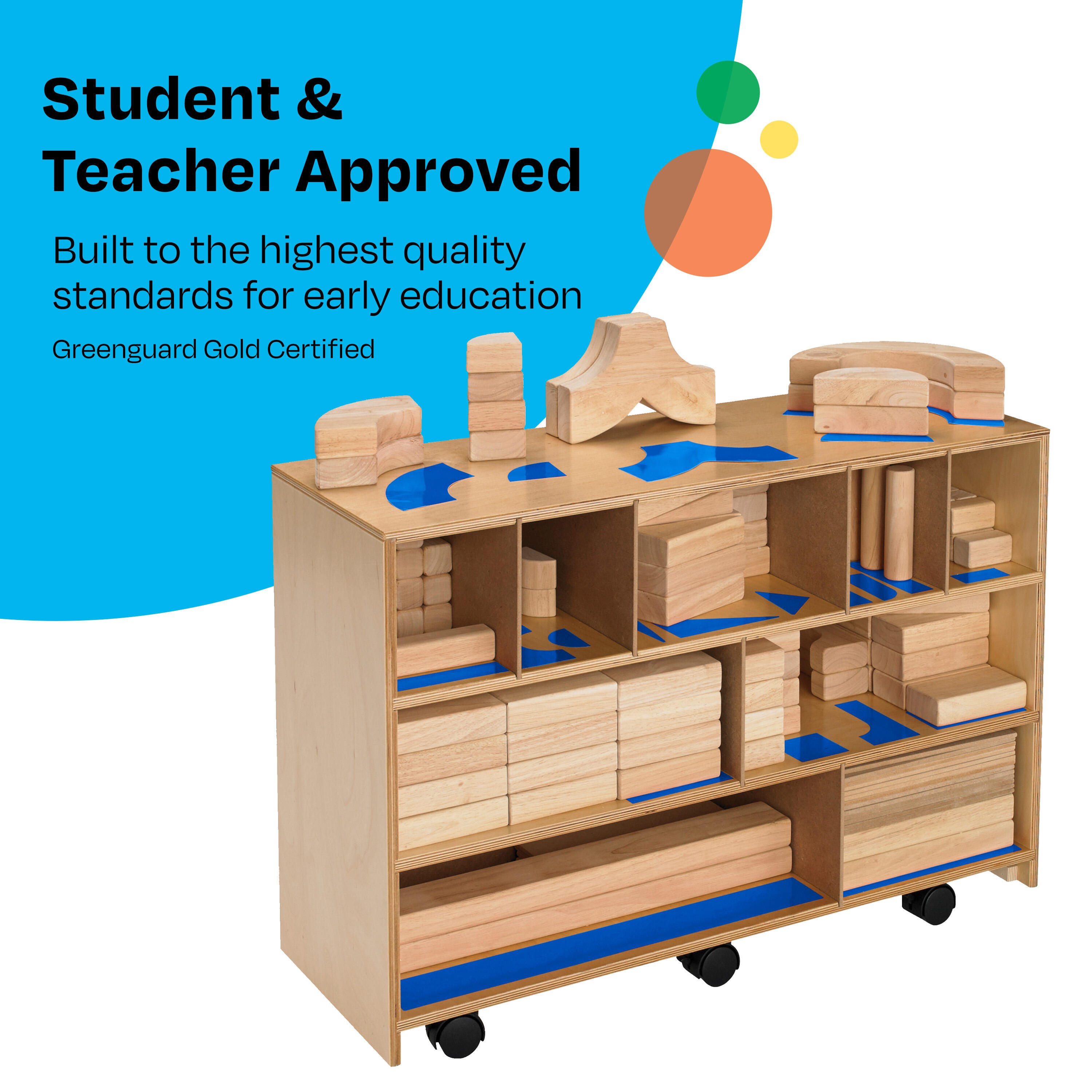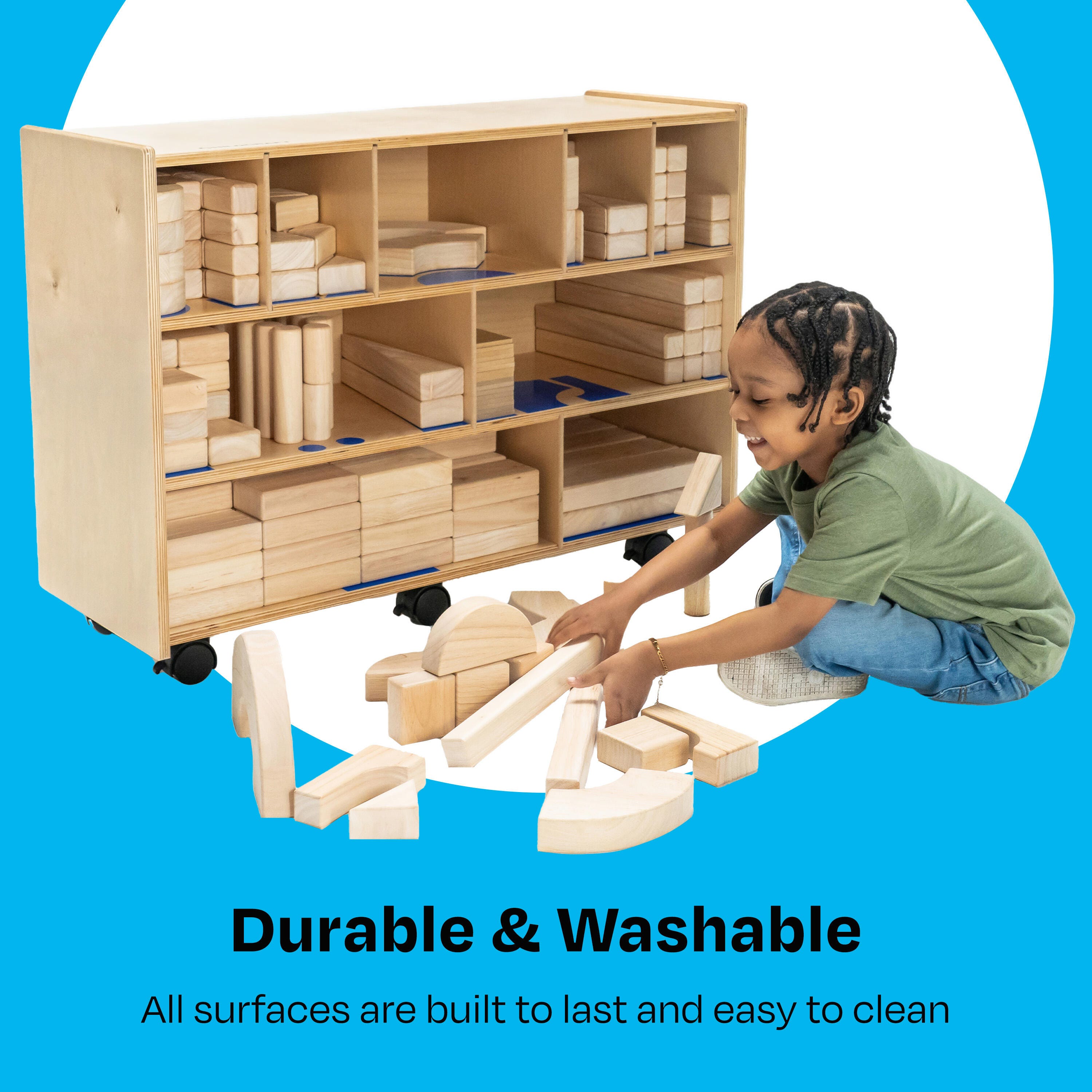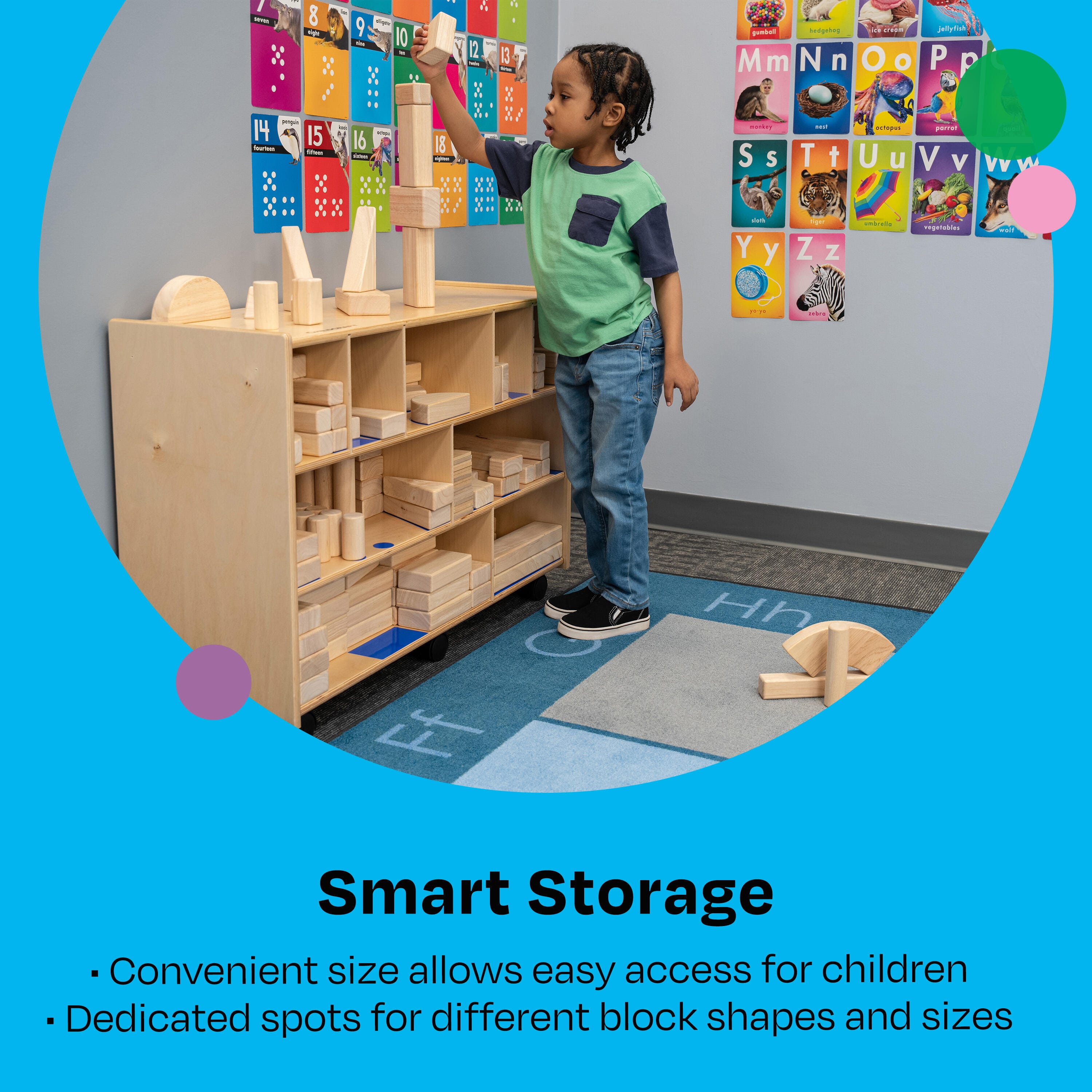 Childcraft® Mobile Cabinet and Block Set is the ultimate wooden block set for classrooms. It includes the blocks and a cabinet featuring open shelves, multiple compartments, and adhesive labels shaped like blocks for easy storage. Lightweight blocks fit in the top compartments, while heavier ones can be stored at the bottom, ensuring stability and safety during movement. The included wooden blocks are perfectly sized and shaped to fit together to foster play and learning for young children. The storage unit comes fully assembled. This block storage cabinet measures 35-3/4 W x 13 D x 25-3/8 H inches.
