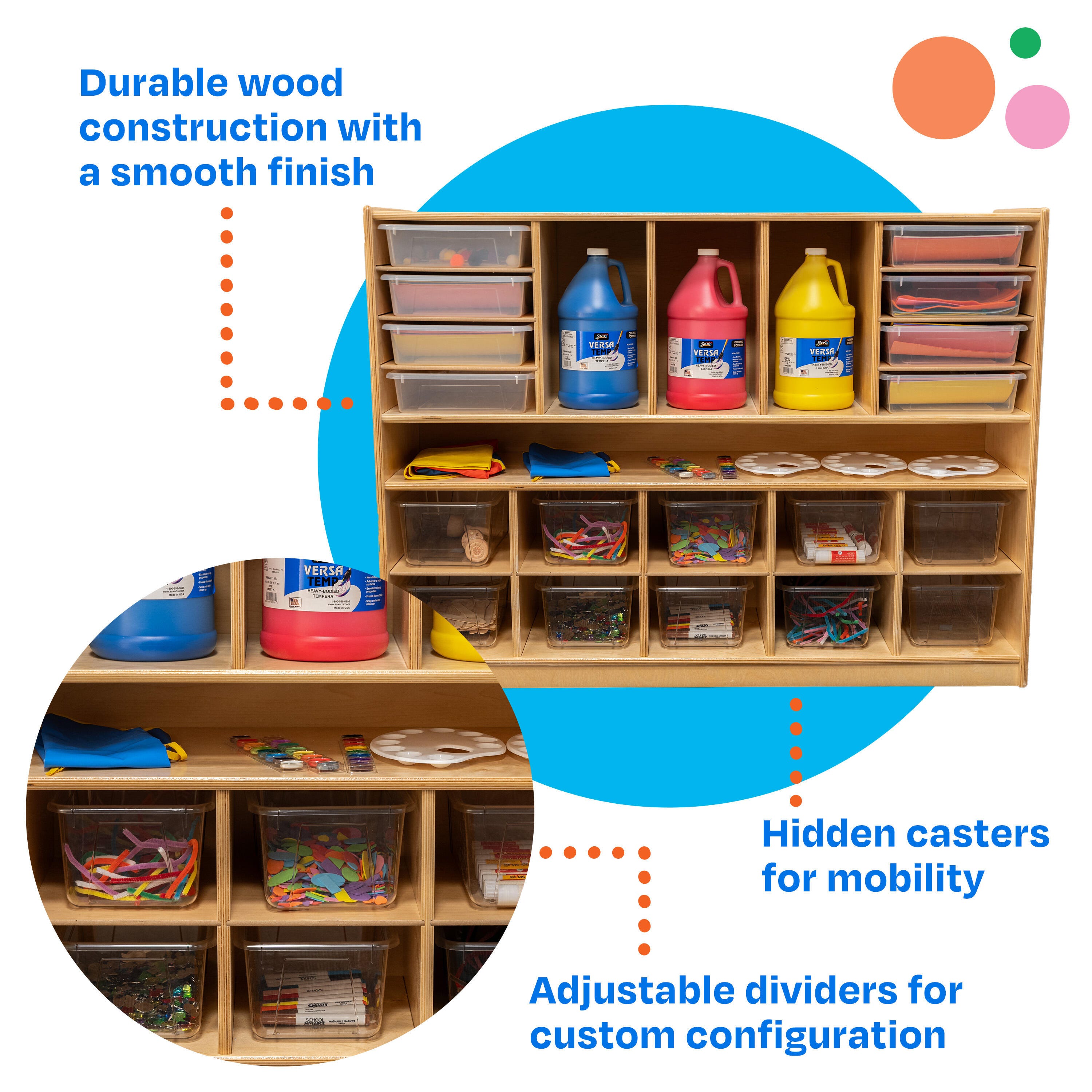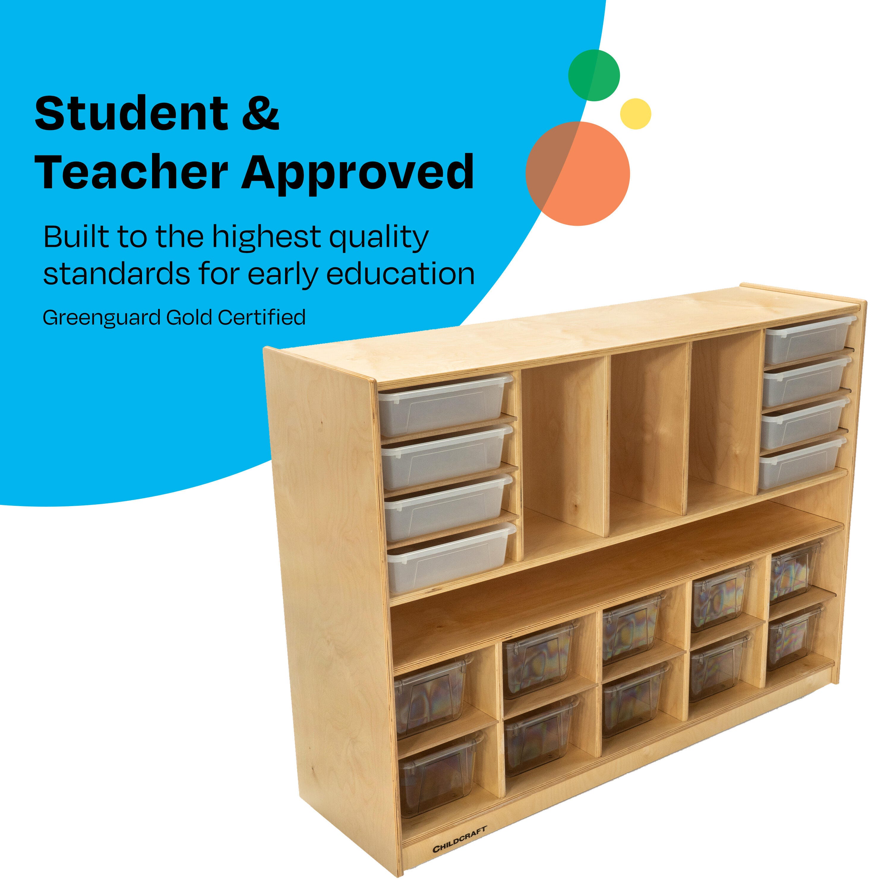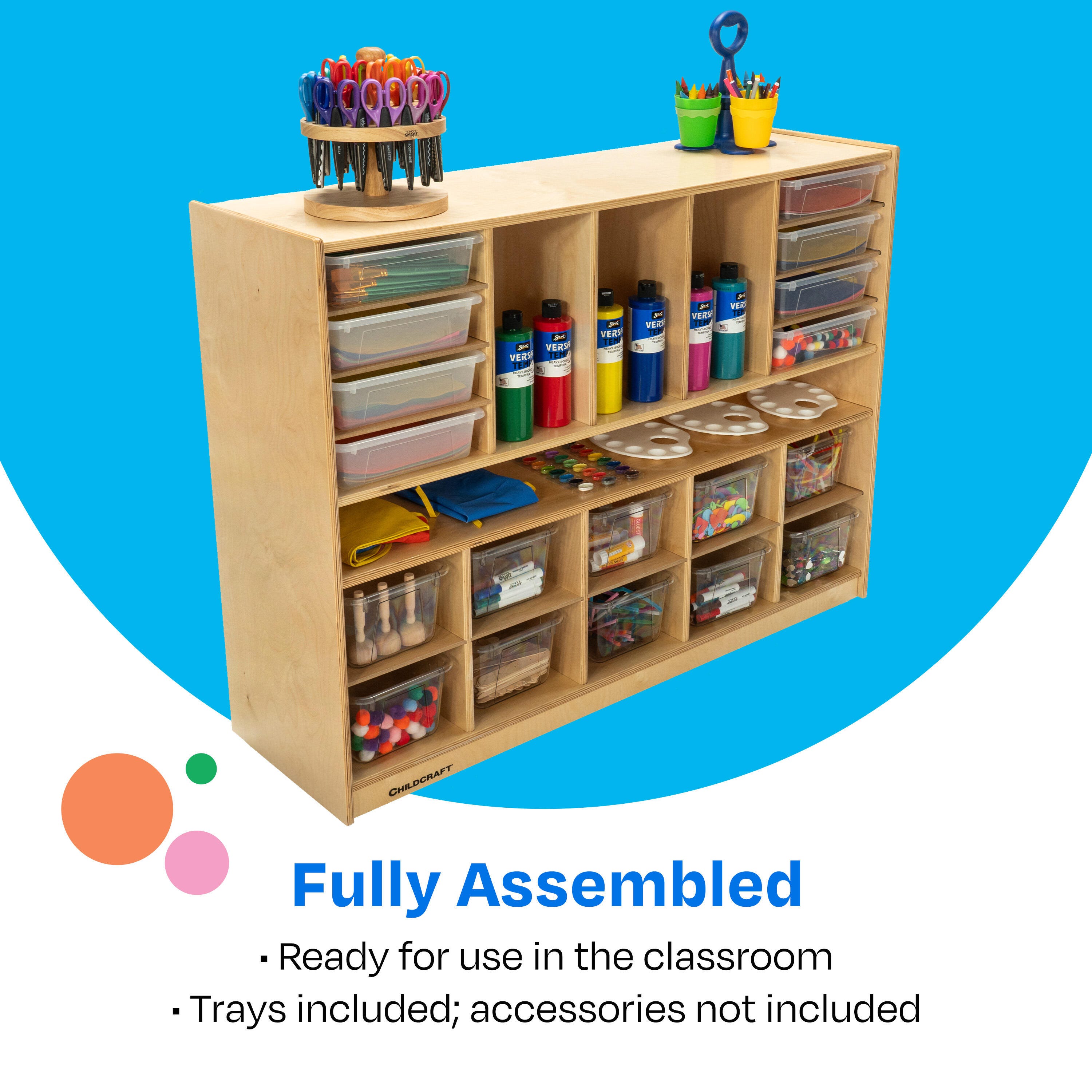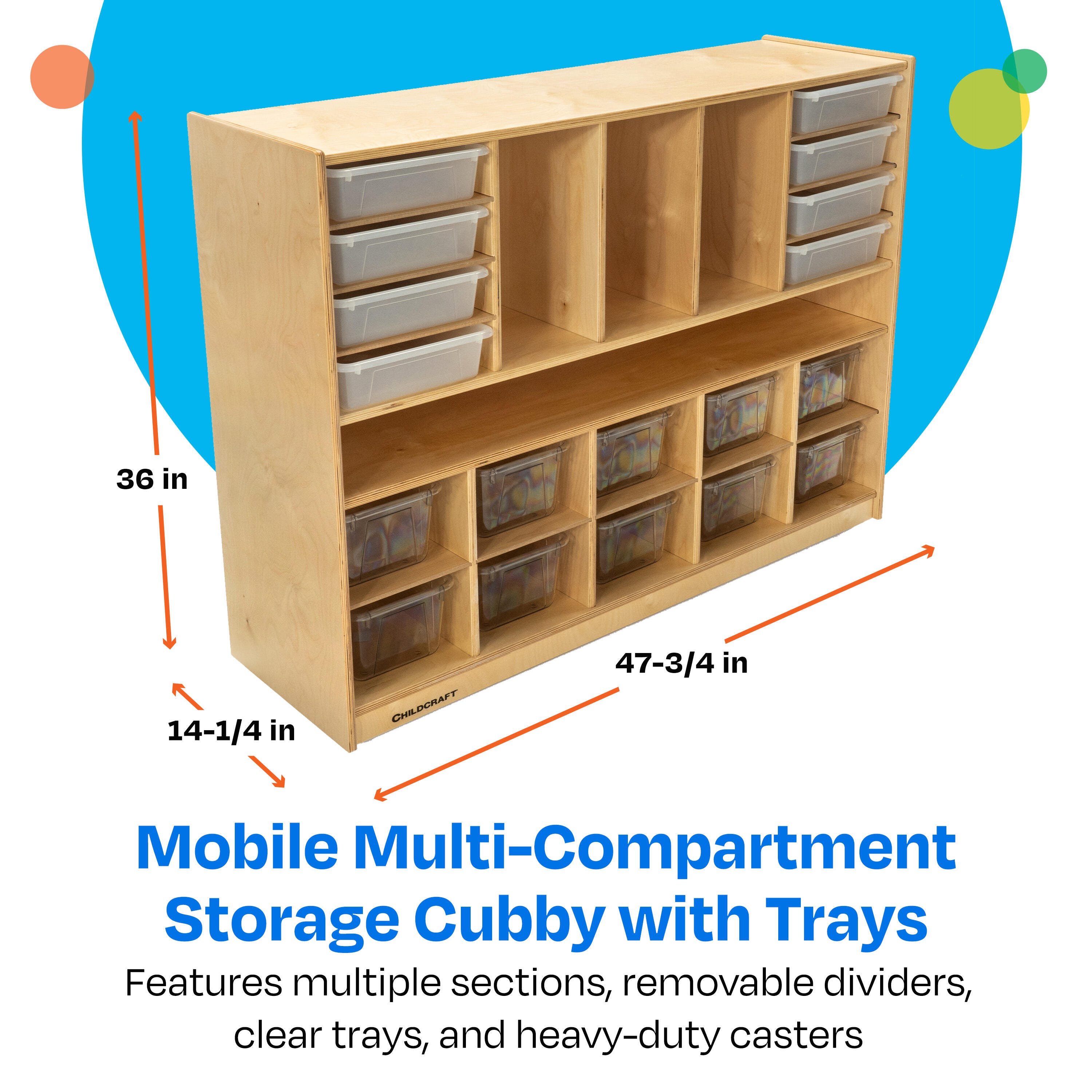 Childcraft® Mobile Multi-Compartment Storage Unit simplifies organization for classrooms. The wooden shelf on wheels is perfect for preschool, kindergarten, daycare centers, homes, and beyond. Use the convenient storage shelves for storing and organizing paper, mail, books, blocks, games, puzzles, and art supplies, keeping them neat and accessible for students. This mobile classroom shelf has hidden casters set behind toe-kicks and includes removable dividers for flexible configurations as well as 10 standard cubby trays. Crafted for long-lasting use, this classroom furniture piece is made of durable birch plywood that’s easy to wipe clean. Comes fully assembled. This classroom bookcase measures 47-3/4 W x 14-1/4 D x 36 H inches.