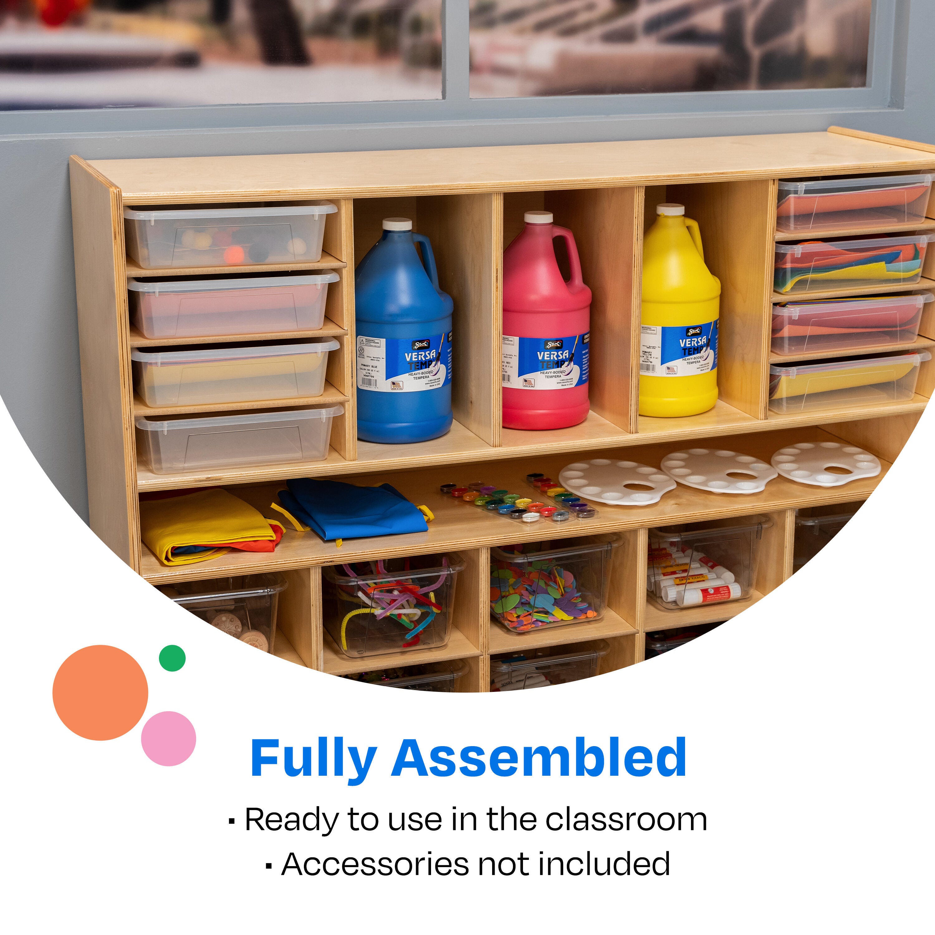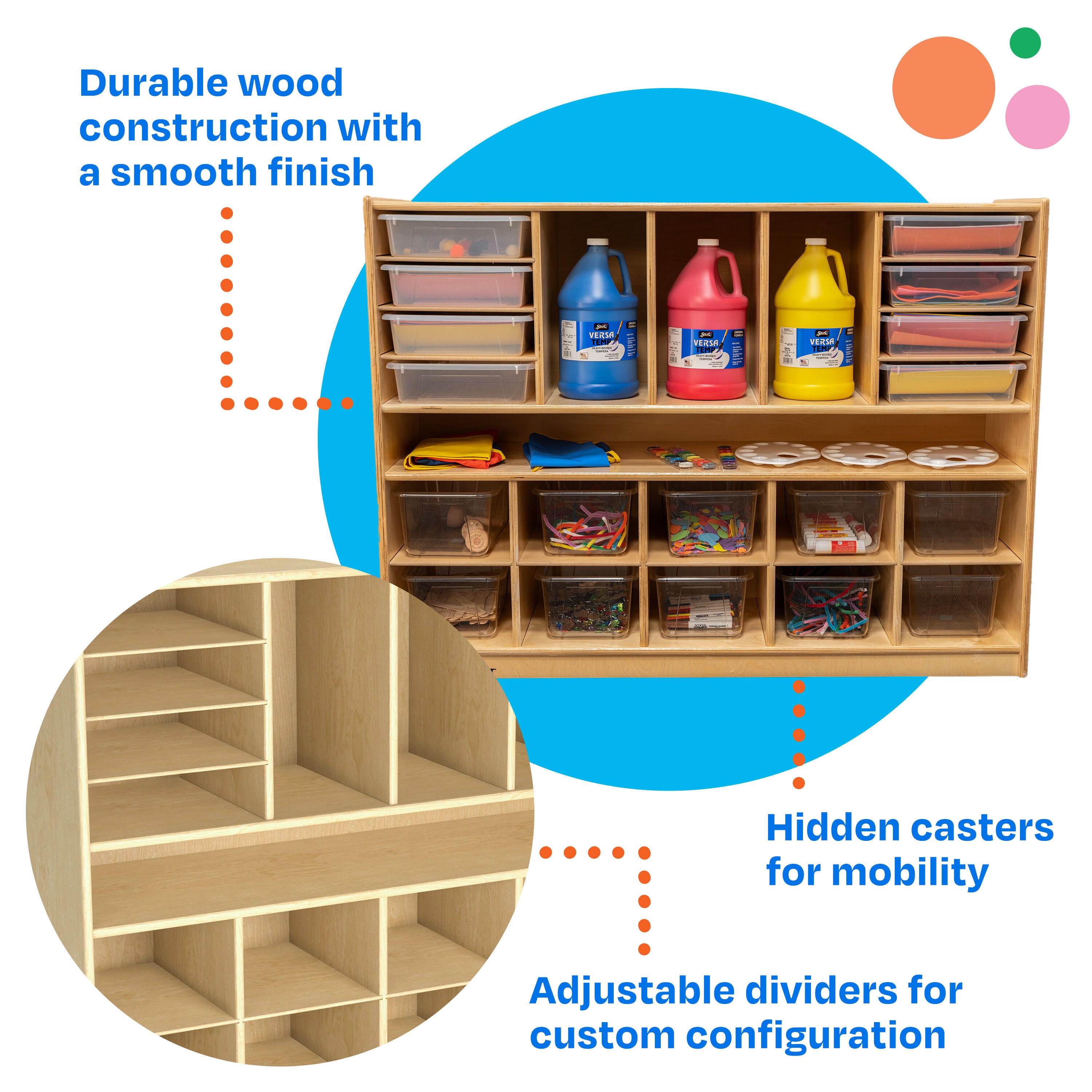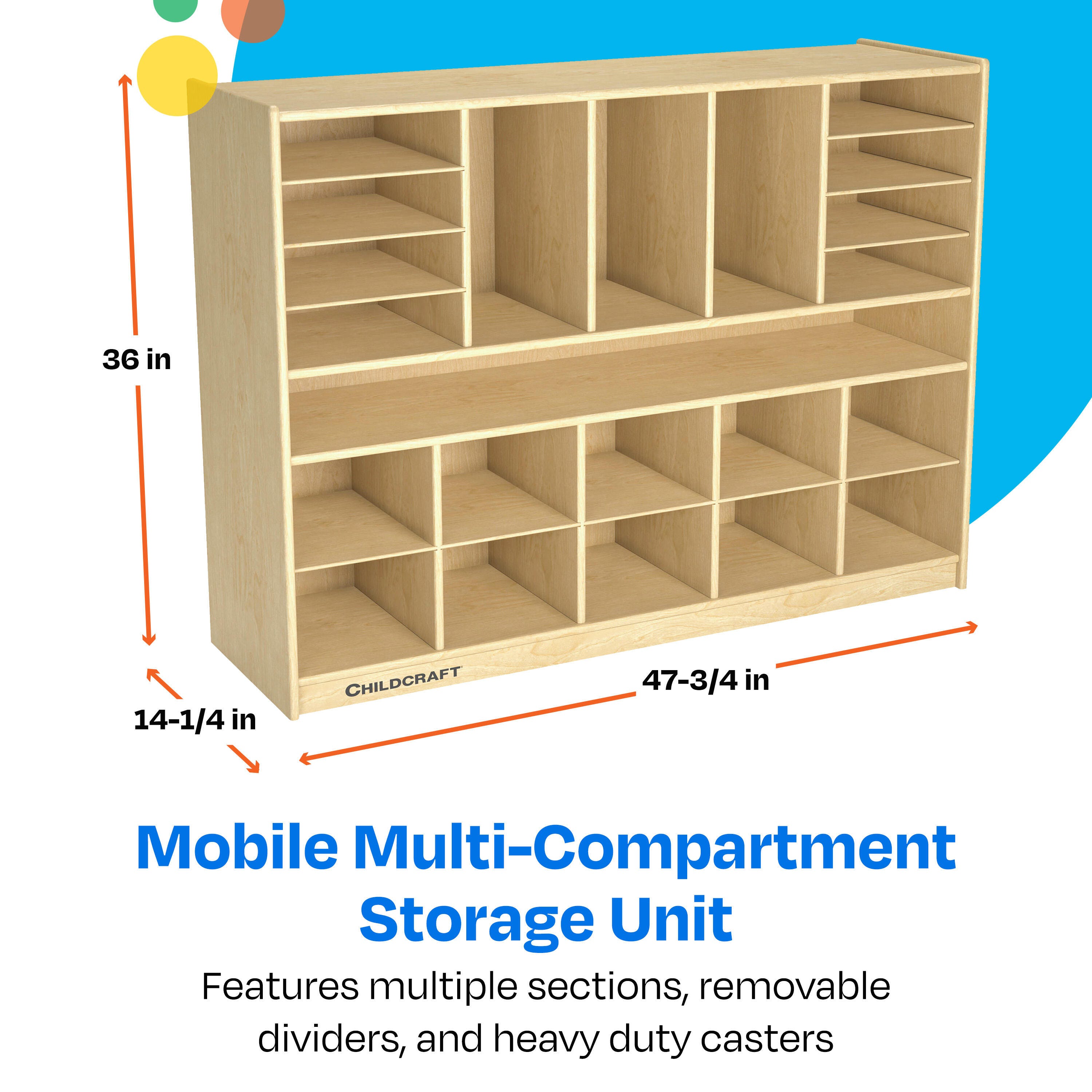Childcraft® Mobile Multi-Compartment Storage Unit simplifies organization for classrooms. The wooden shelf on wheels is perfect for preschool, kindergarten, daycare centers, homes, and beyond. Use the convenient storage shelves for storing and organizing paper, mail, books, blocks, games, puzzles, and art supplies, keeping them neat and accessible for students. This classroom shelf includes removable dividers for flexible configurations. Crafted for long-lasting use, this classroom furniture piece is made of durable birch plywood that’s easy to wipe clean. Comes fully assembled. This classroom bookcase measures 47-3/4 W x 14-1/4 D x 36 H inches.