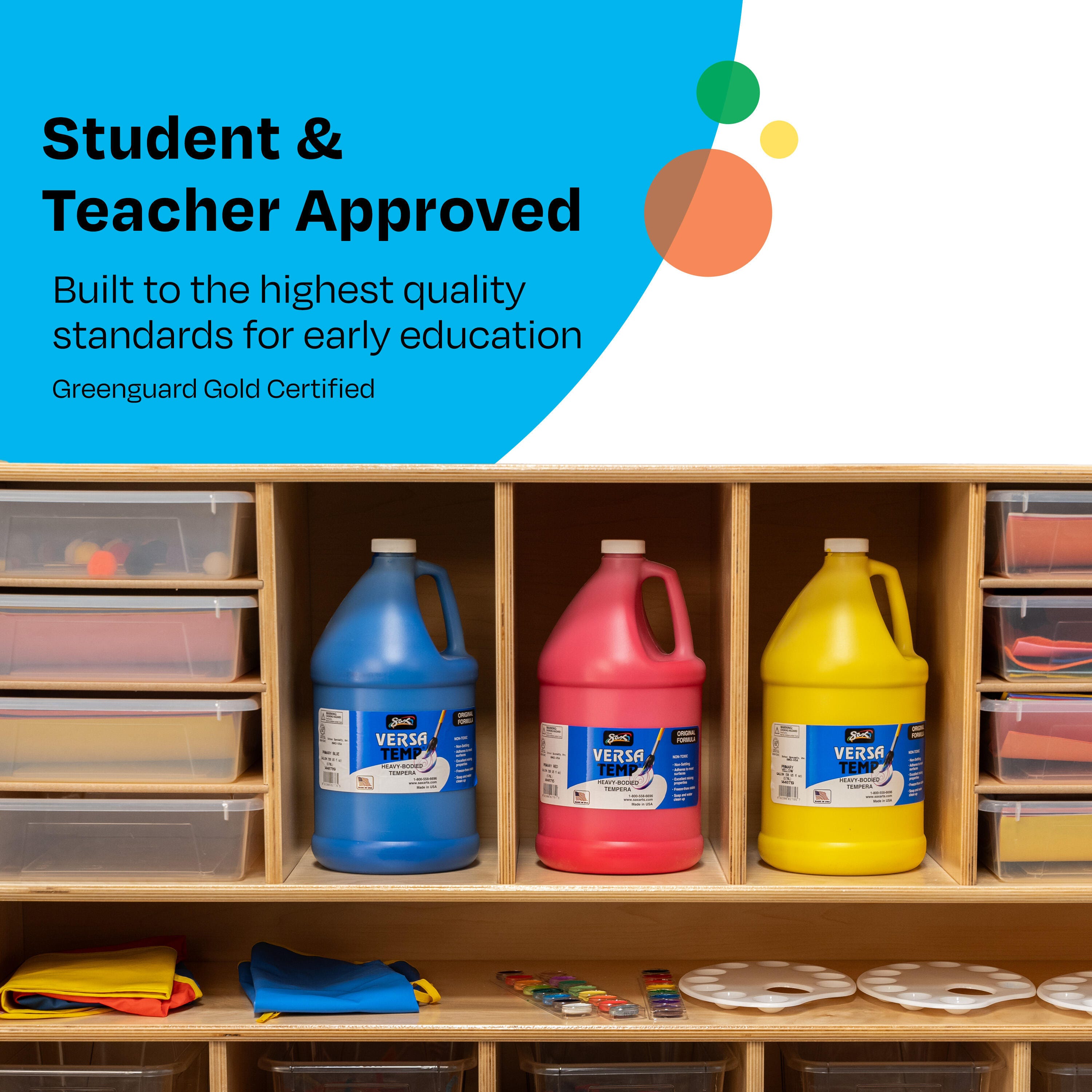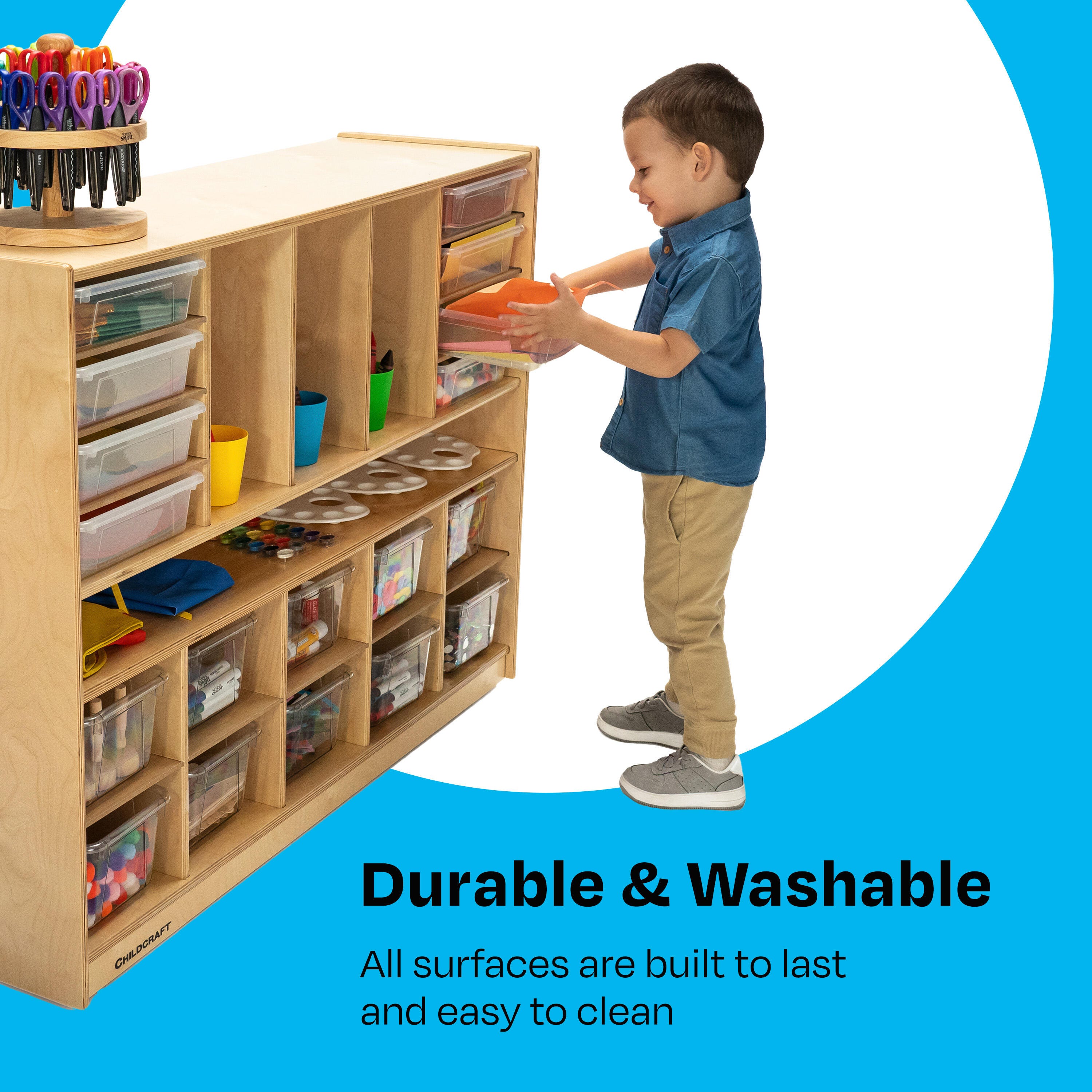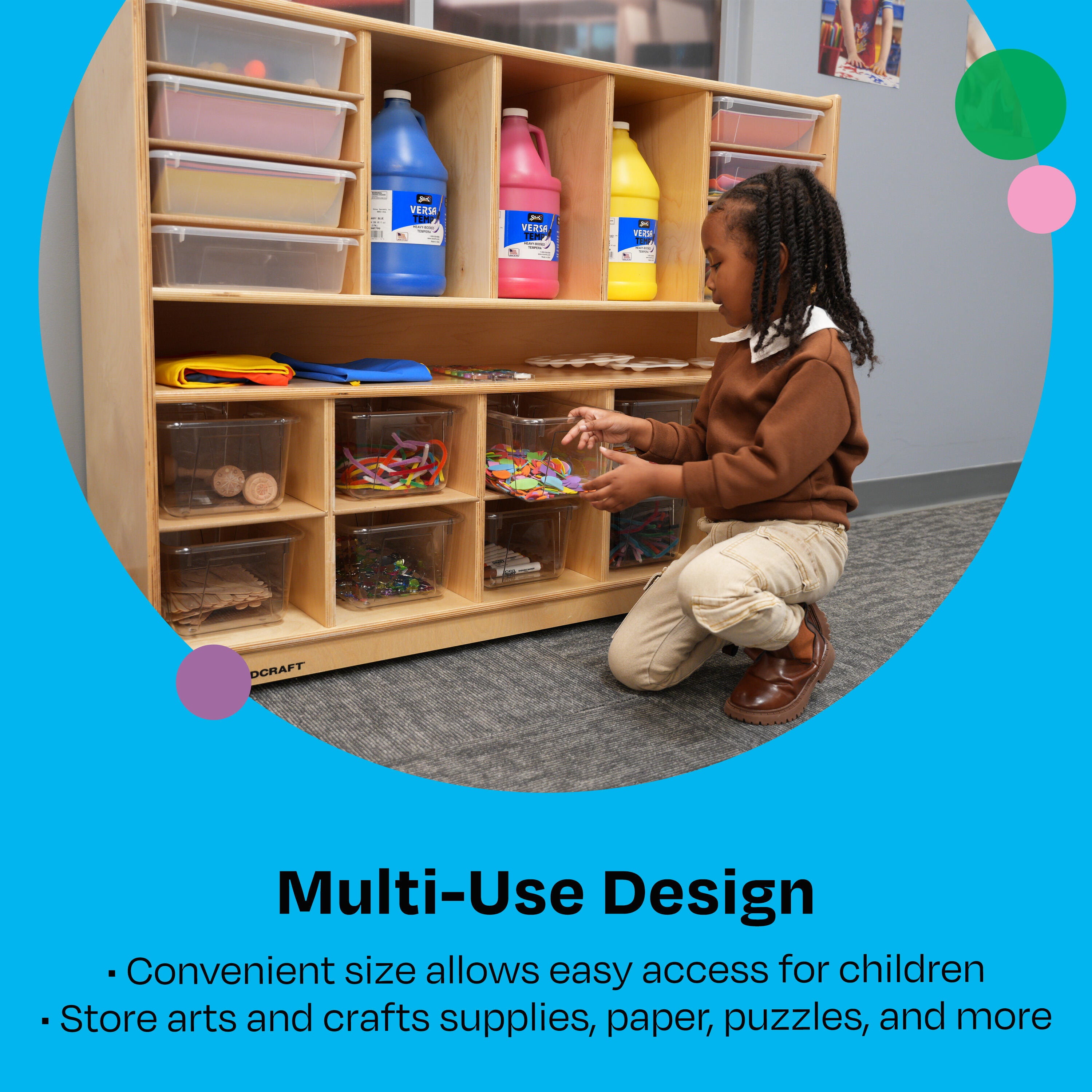 Childcraft® Mobile Multi-Compartment Storage Unit simplifies organization for classrooms. The wooden shelf on wheels is perfect for preschool, kindergarten, daycare centers, homes, and beyond. Use the convenient storage shelves for storing and organizing paper, mail, books, blocks, games, puzzles, and art supplies, keeping them neat and accessible for students. This classroom shelf includes removable dividers for flexible configurations. Crafted for long-lasting use, this classroom furniture piece is made of durable birch plywood that’s easy to wipe clean. Comes fully assembled. This classroom bookcase measures 47-3/4 W x 14-1/4 D x 36 H inches.