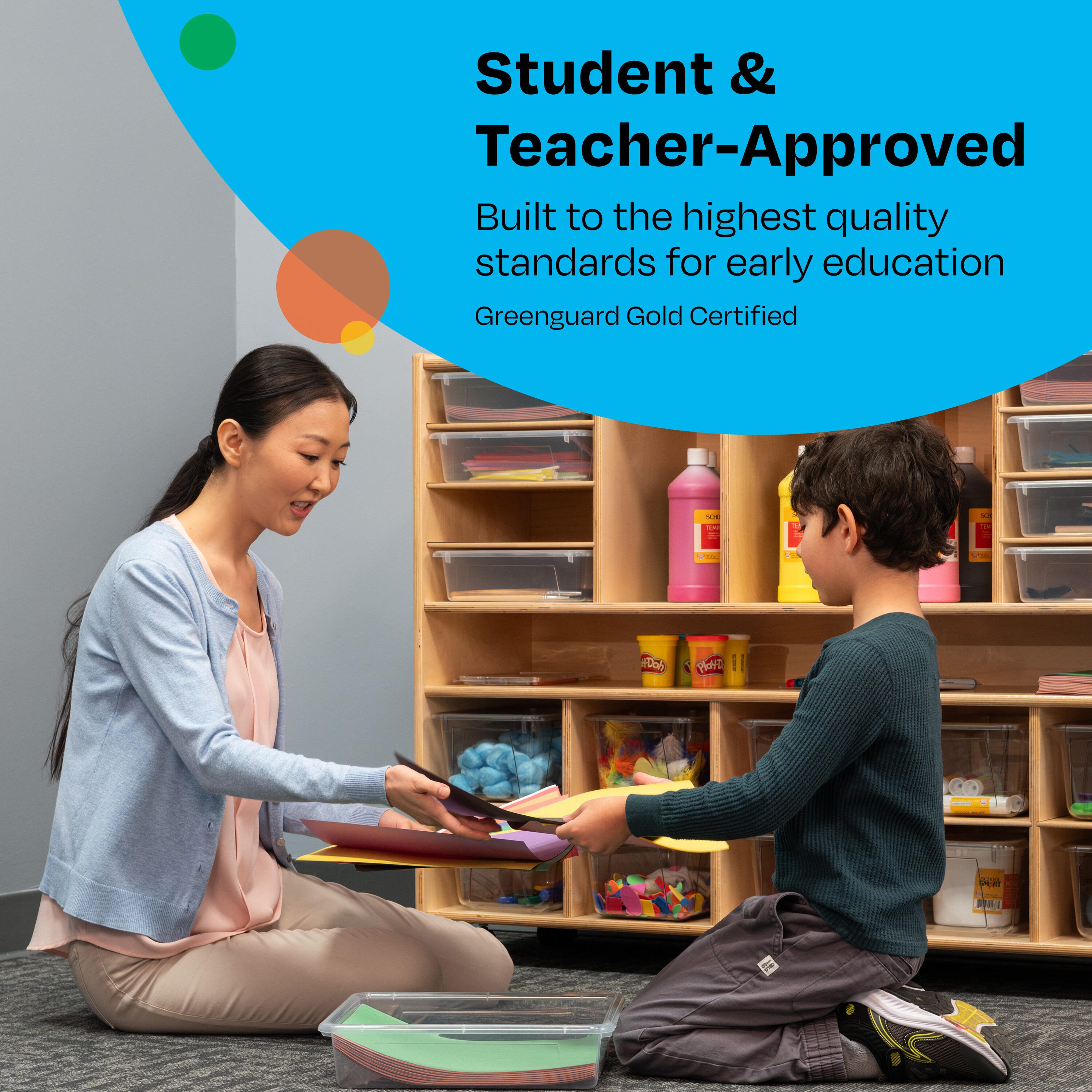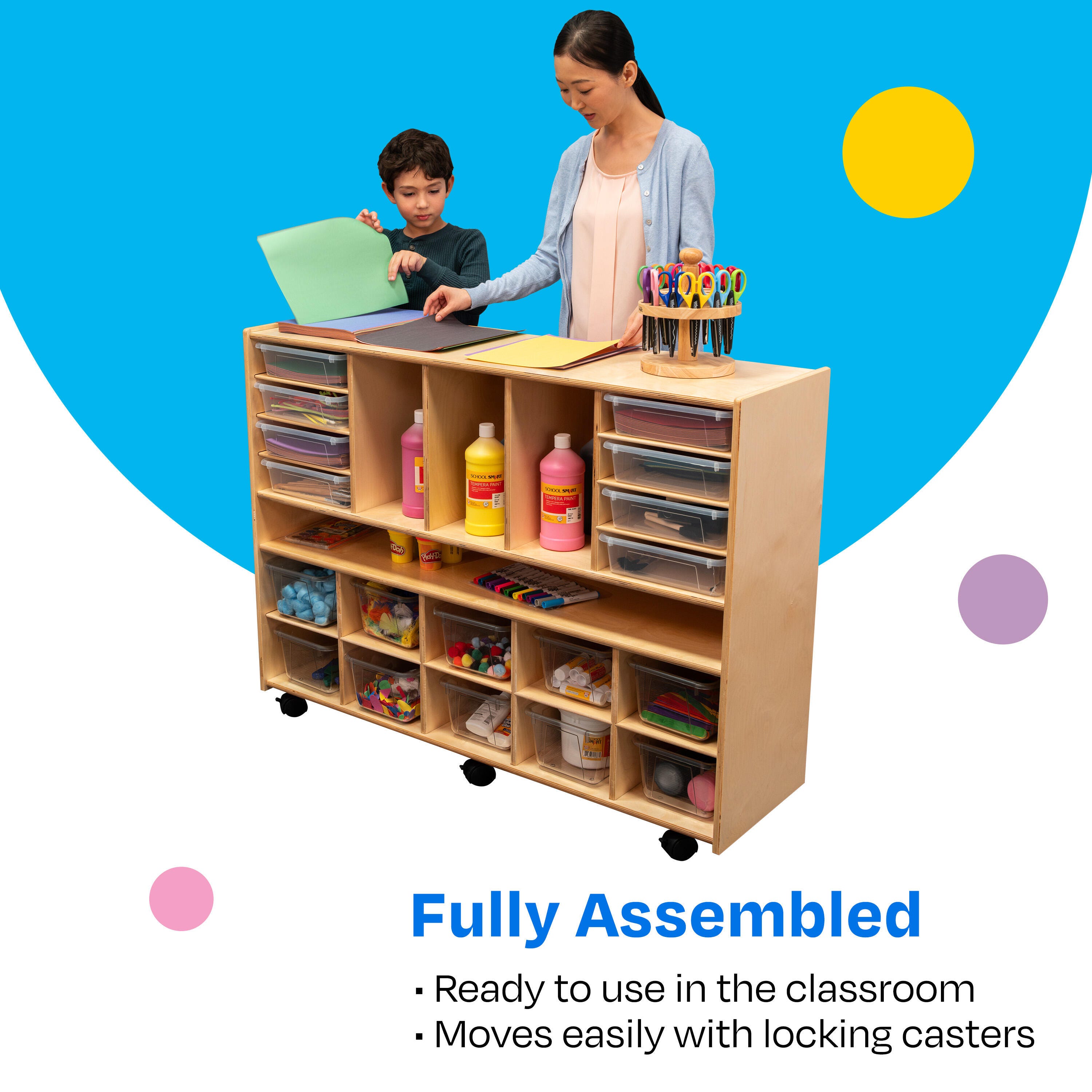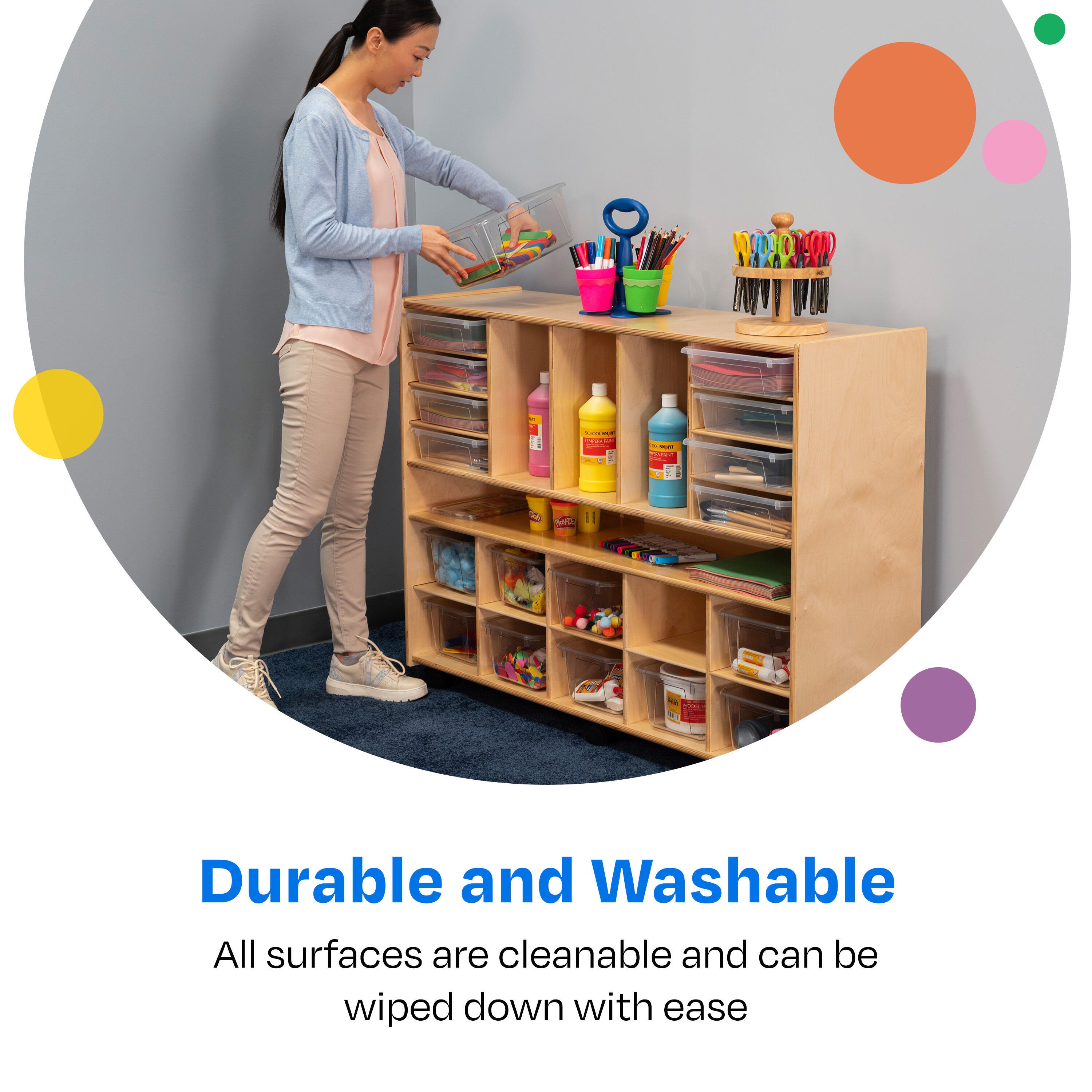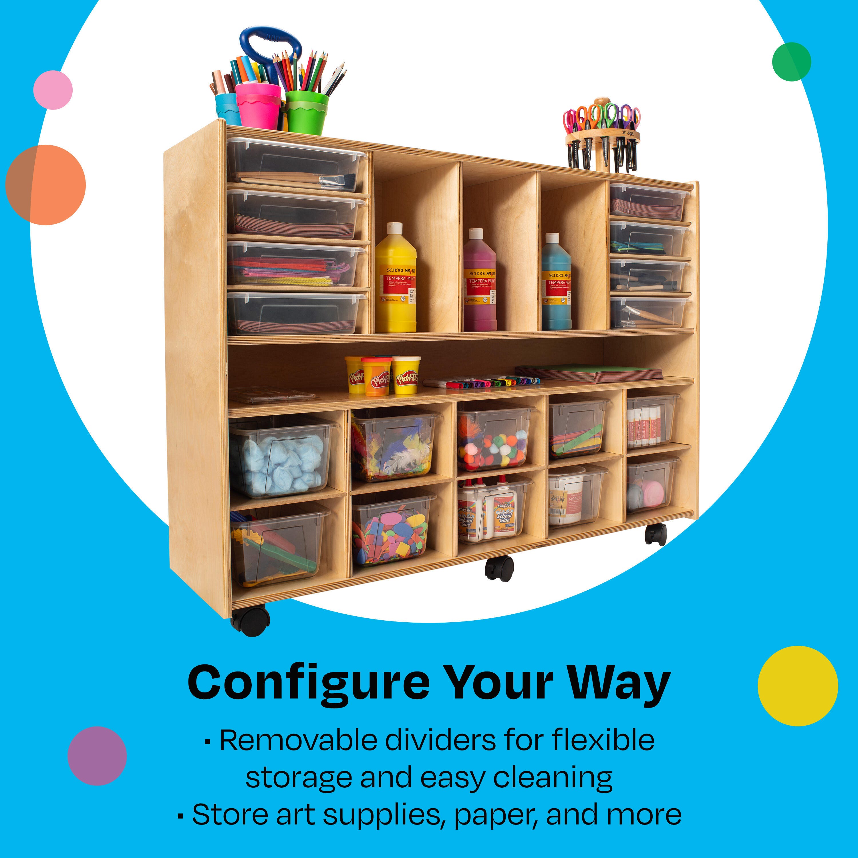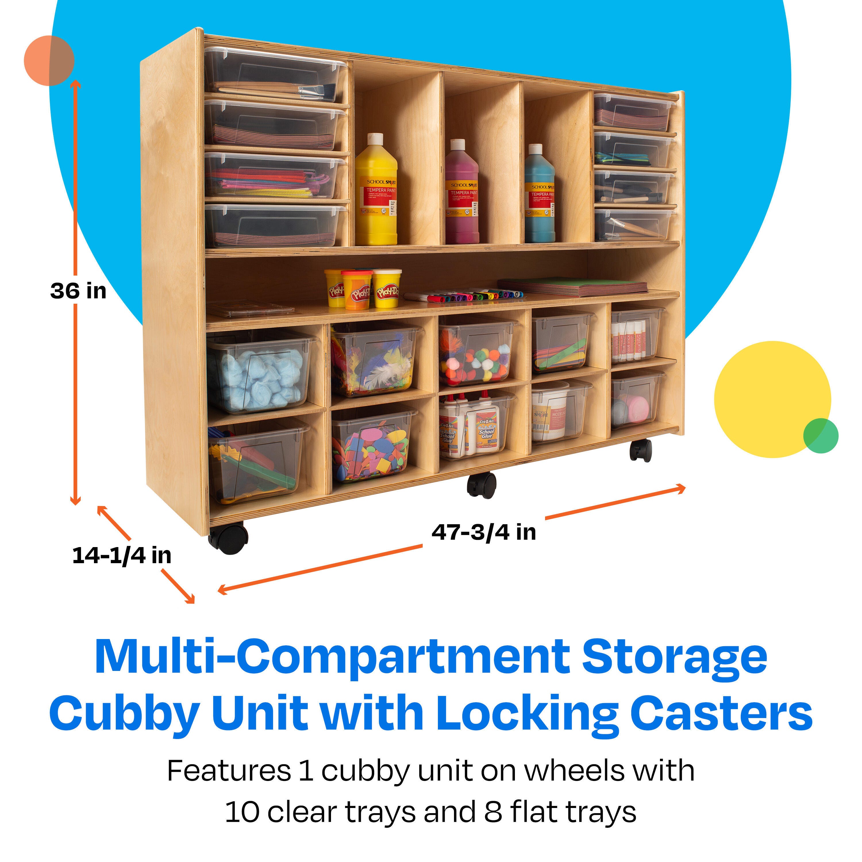 Childcraft® Mobile Multi-Compartment Storage Unit simplifies organization for classrooms. The wooden shelf on wheels is perfect for preschool, kindergarten, daycare centers, homes, and beyond. Use the convenient storage shelves for storing and organizing paper, mail, books, blocks, games, puzzles, and art supplies, keeping them neat and accessible for students. This classroom shelf includes removable dividers for flexible configurations, 10 standard cubby trays, and 8 flat trays. Crafted for long-lasting use, this classroom furniture piece is made of durable birch plywood that’s easy to wipe clean. Comes fully assembled. This item comes with a Limited Lifetime Warranty. This storage unit measures 47-3/4 W x 14-1/4 D x 36 H inches.