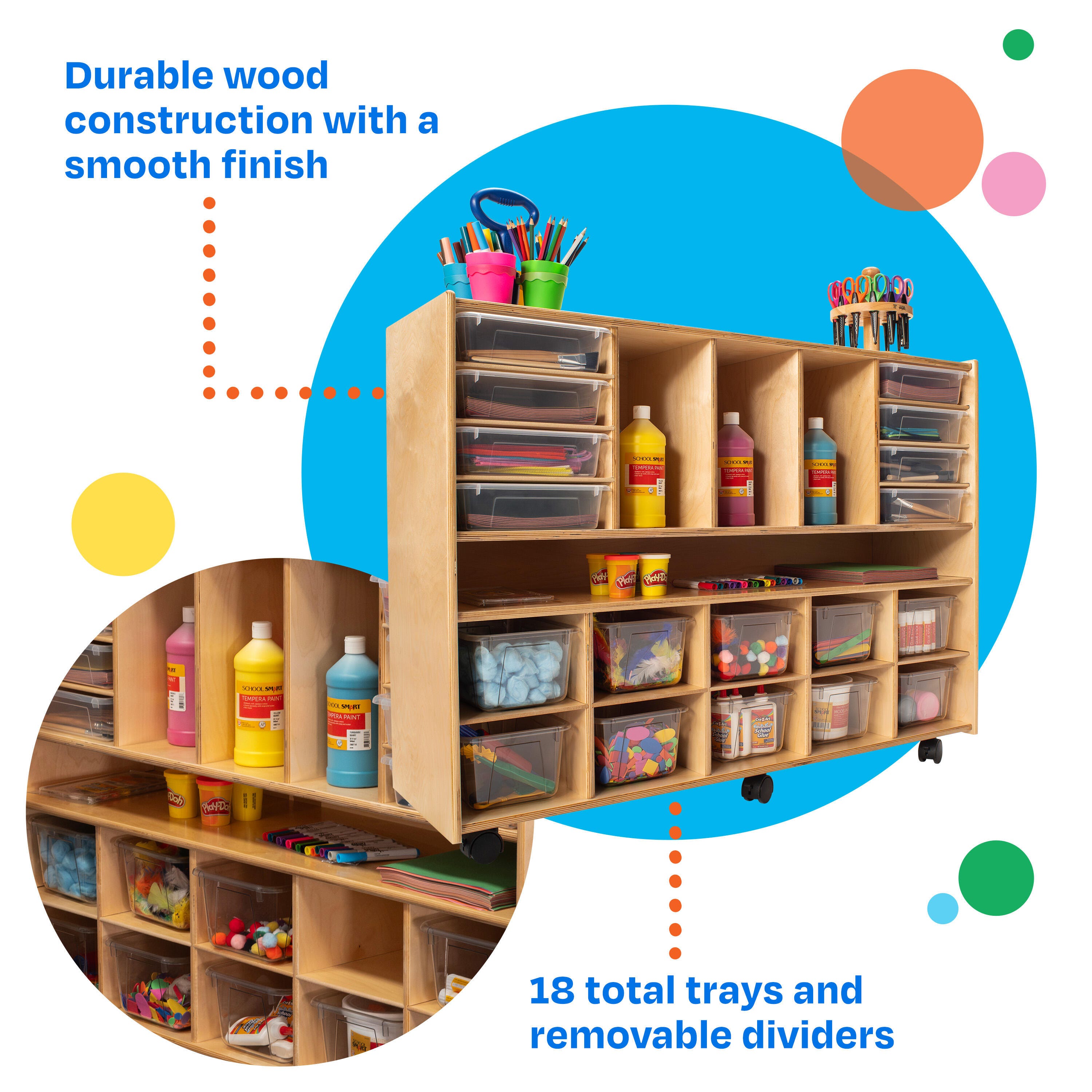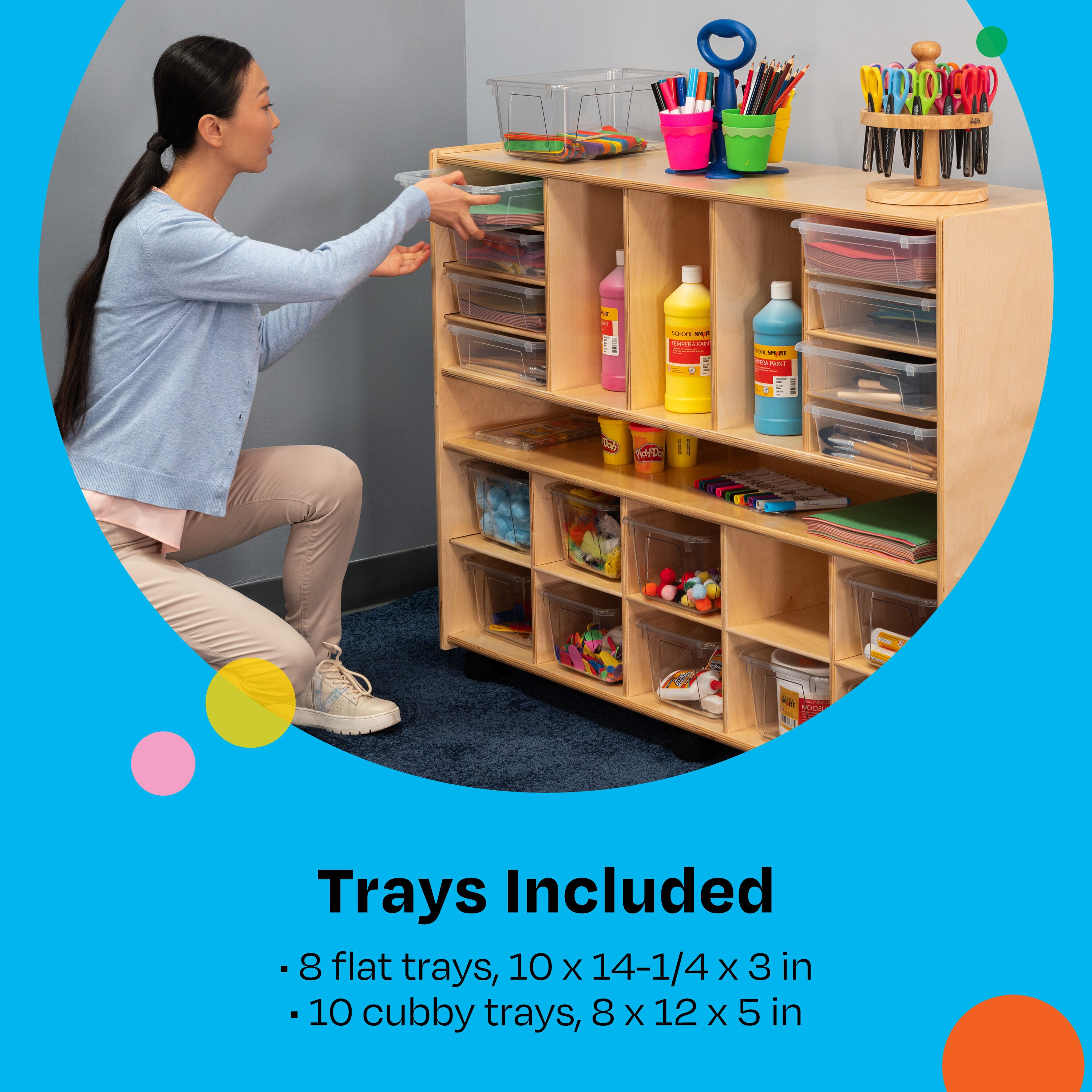Childcraft Mobile Multicompartment Storage Unit with Locking Casters, 10 Clear Trays, 8 Flat Trays, 47-3/4 x 14-1/4 x 36 Inches