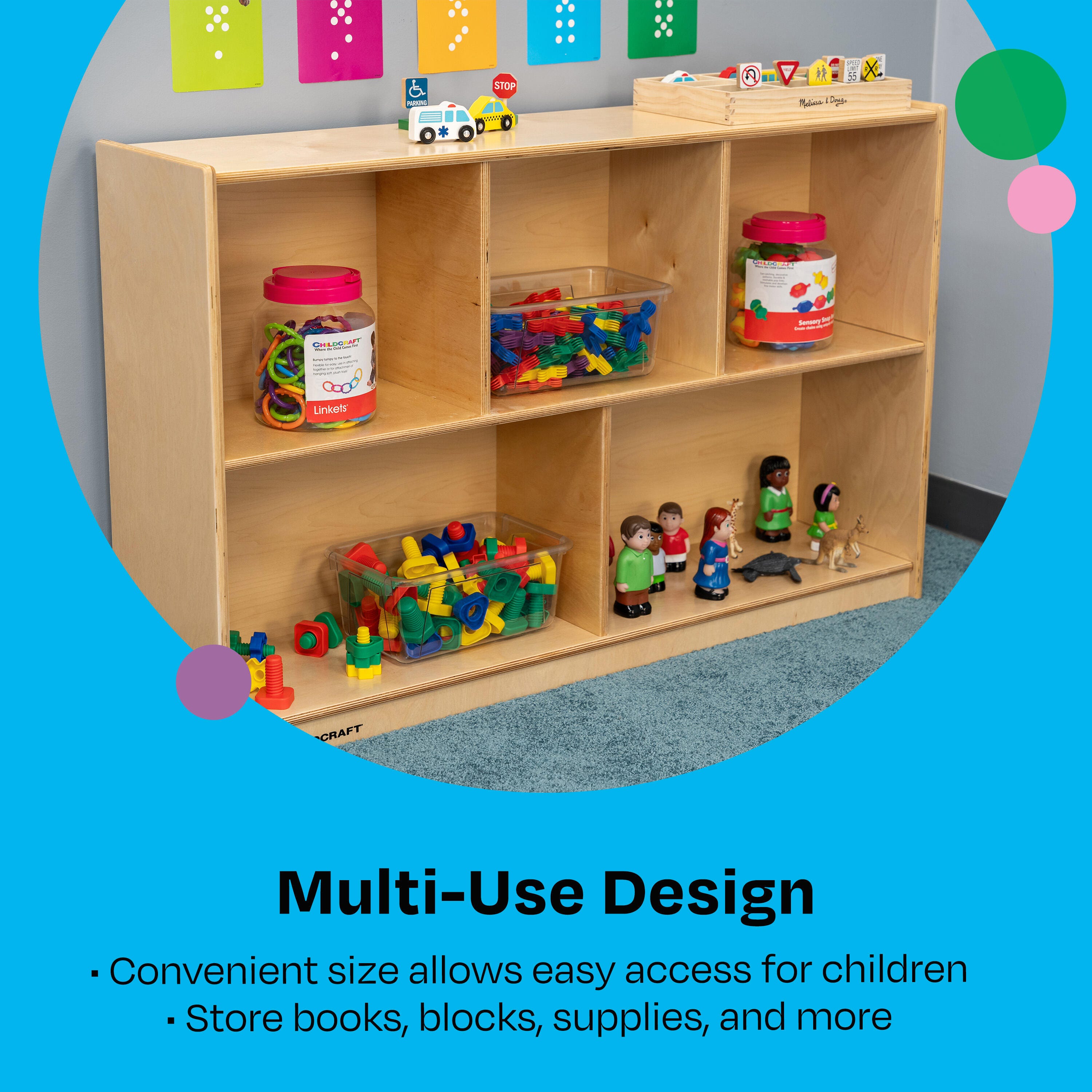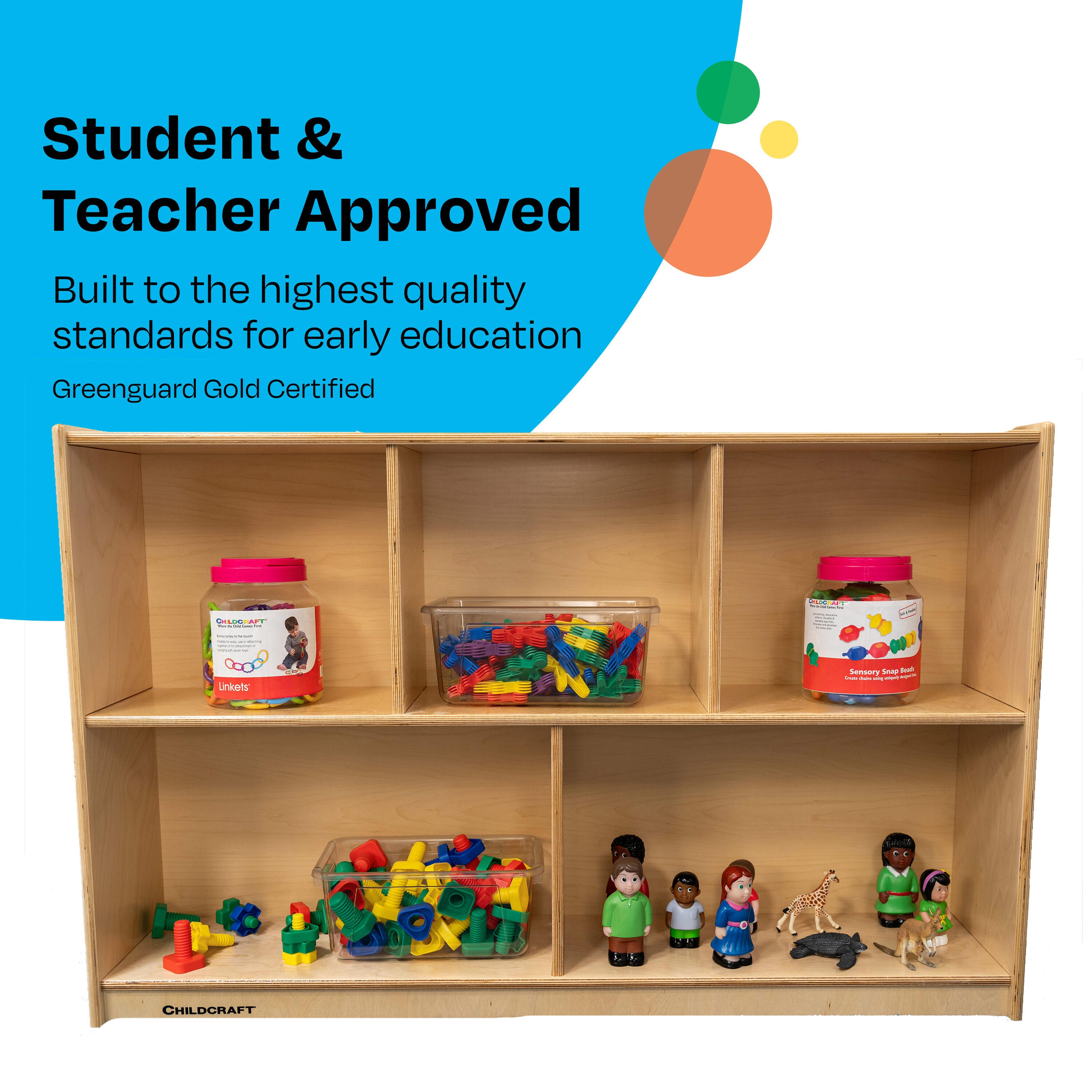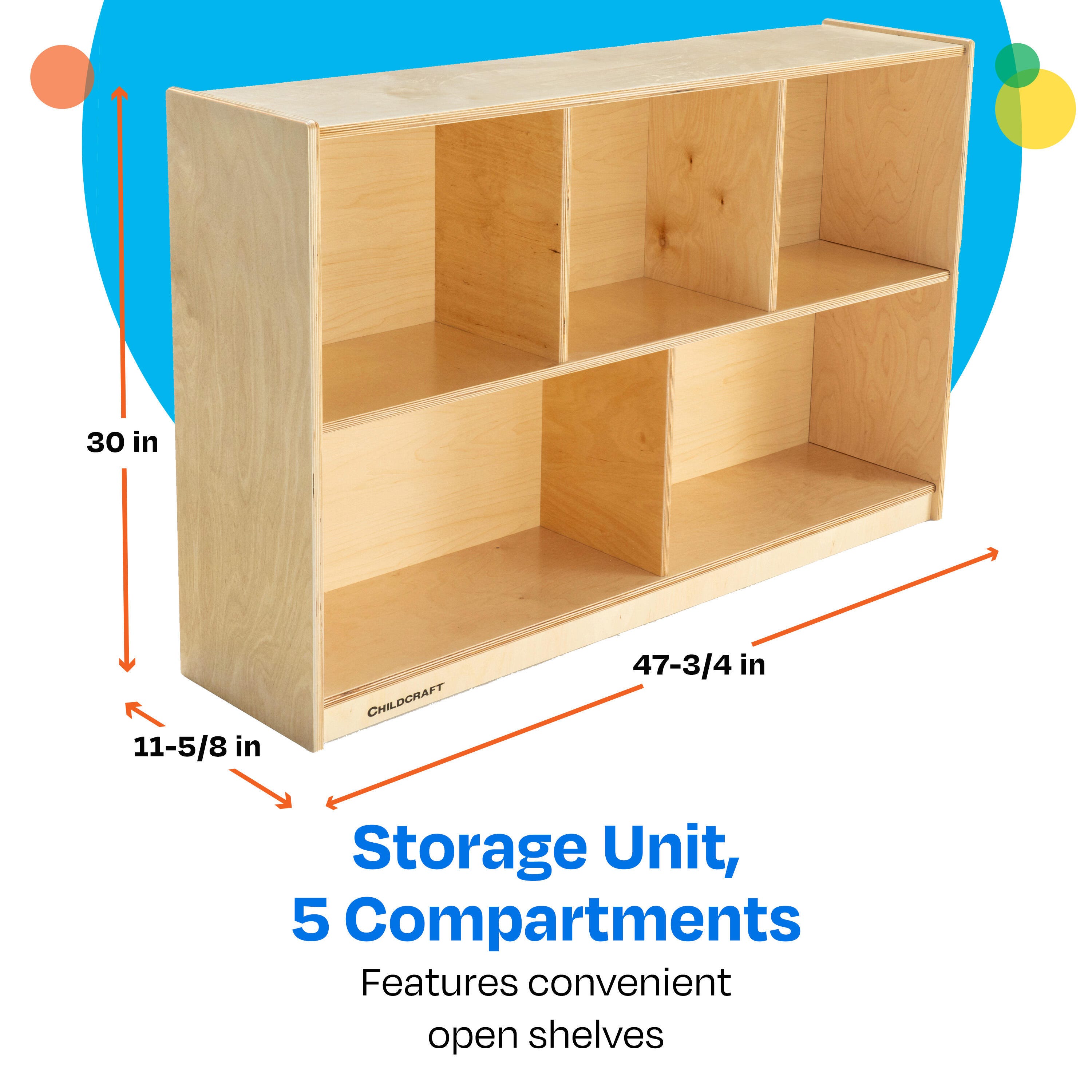 Childcraft® 5-Compartment Storage Unit for Classrooms simplifies organization. Use the wooden shelf on wheels for preschool, kindergarten, daycare centers, homes, and beyond. The convenient storage shelves are great for storing and organizing books, blocks, games, and manipulatives, keeping them neat and accessible for students. Crafted for long-lasting use, this classroom furniture piece is made of durable birch plywood that’s easy to wipe clean. Comes fully assembled. This classroom bookcase measures 47-3/4 W x 11-5/8 D x 30 H inches.
