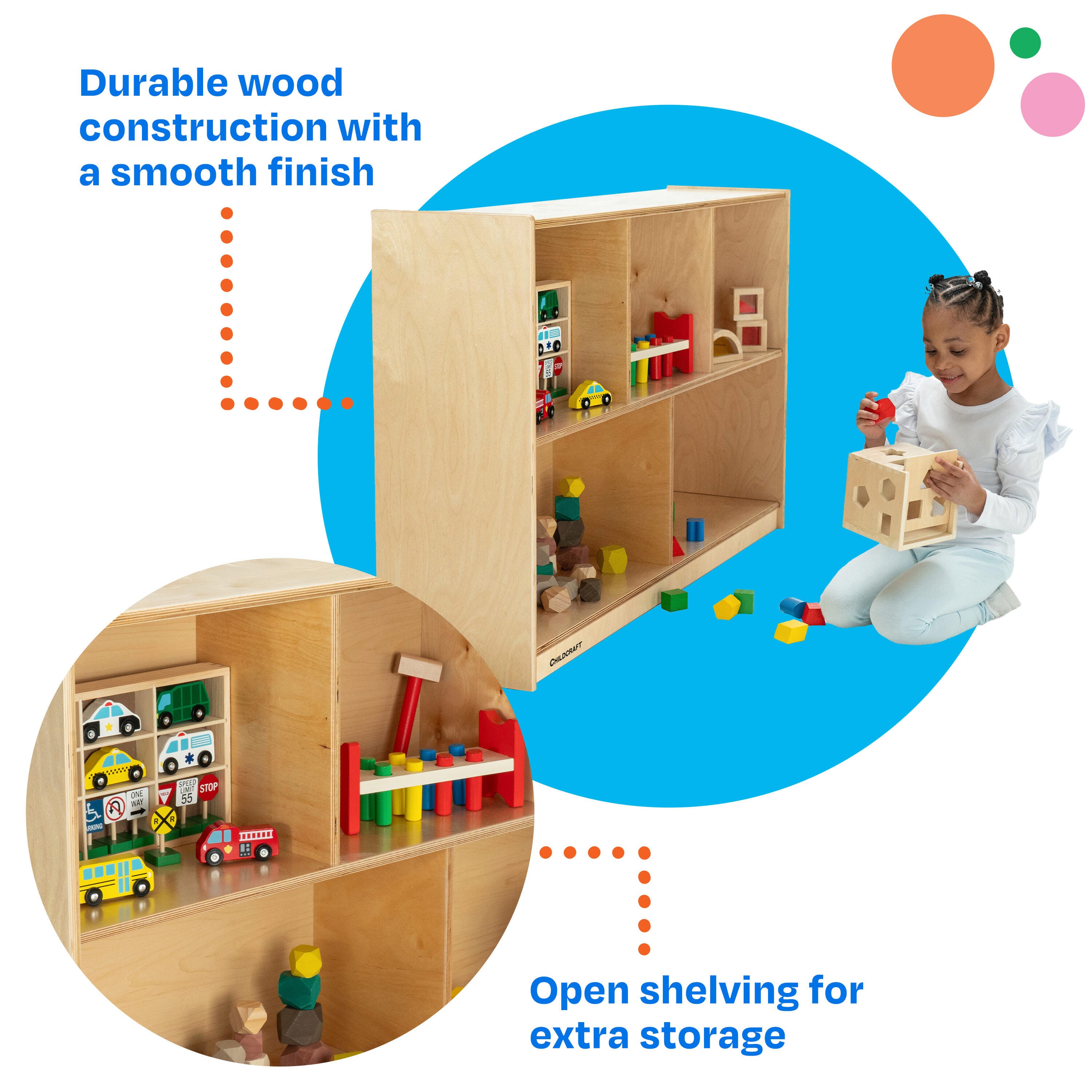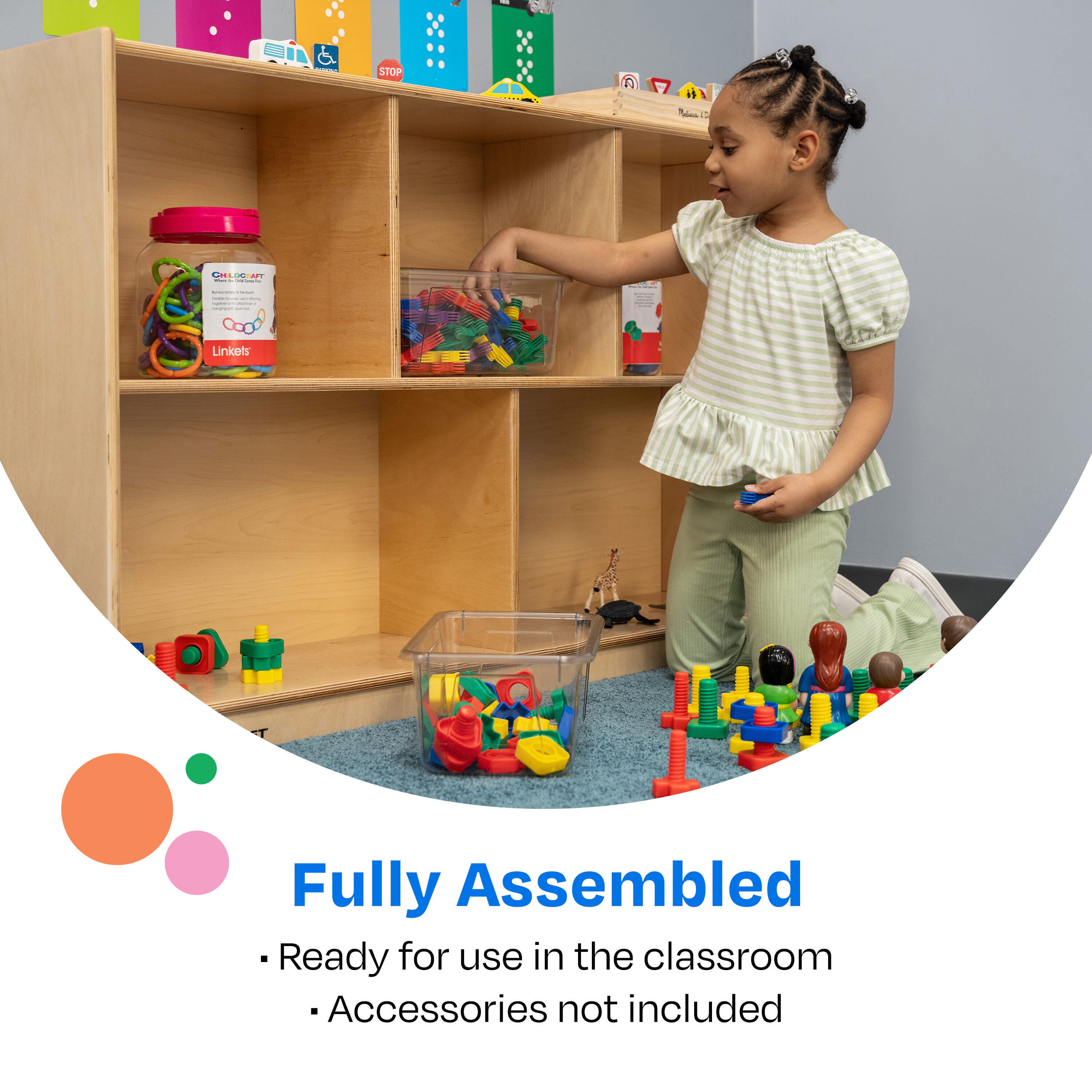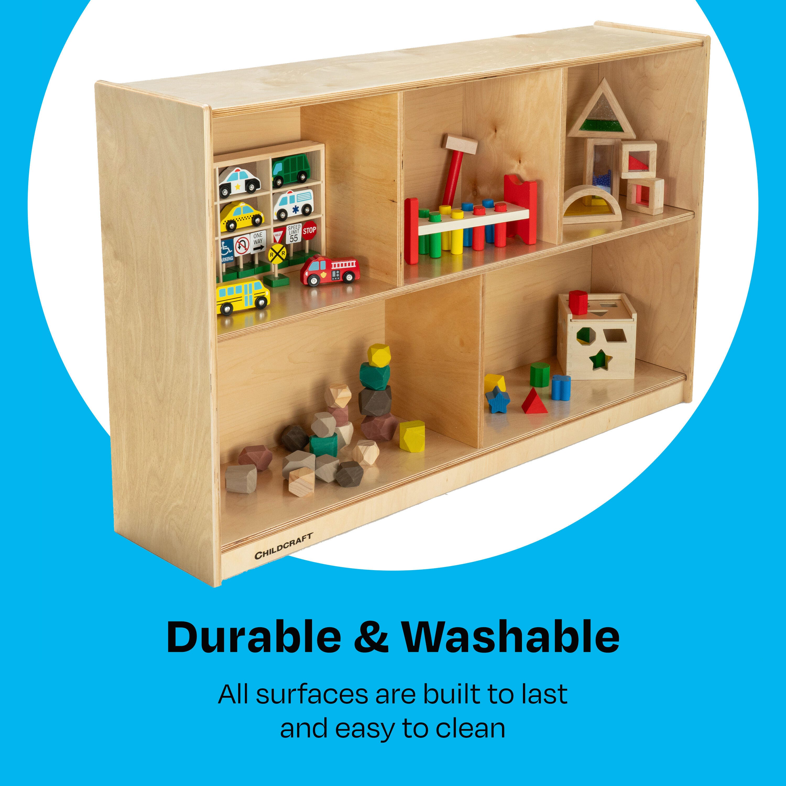 Childcraft® 5-Compartment Storage Unit for Classrooms simplifies organization. Use the wooden shelf on wheels for preschool, kindergarten, daycare centers, homes, and beyond. The convenient storage shelves are great for storing and organizing books, blocks, games, and manipulatives, keeping them neat and accessible for students. Crafted for long-lasting use, this classroom furniture piece is made of durable birch plywood that’s easy to wipe clean. Comes fully assembled. This classroom bookcase measures 47-3/4 W x 11-5/8 D x 30 H inches.