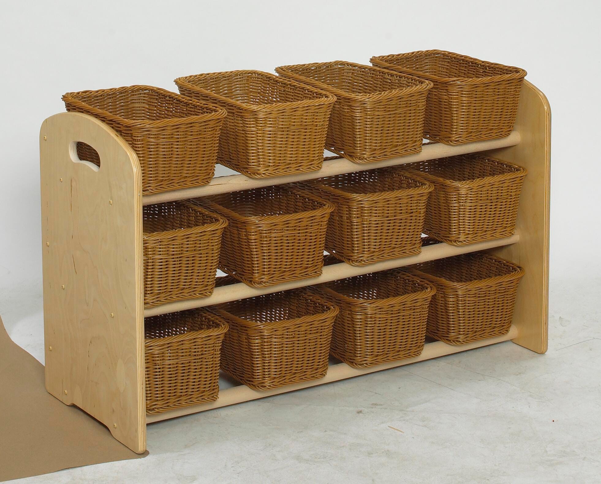 - Twelve removable wicker baskets provide flexible storage for various classroom materials