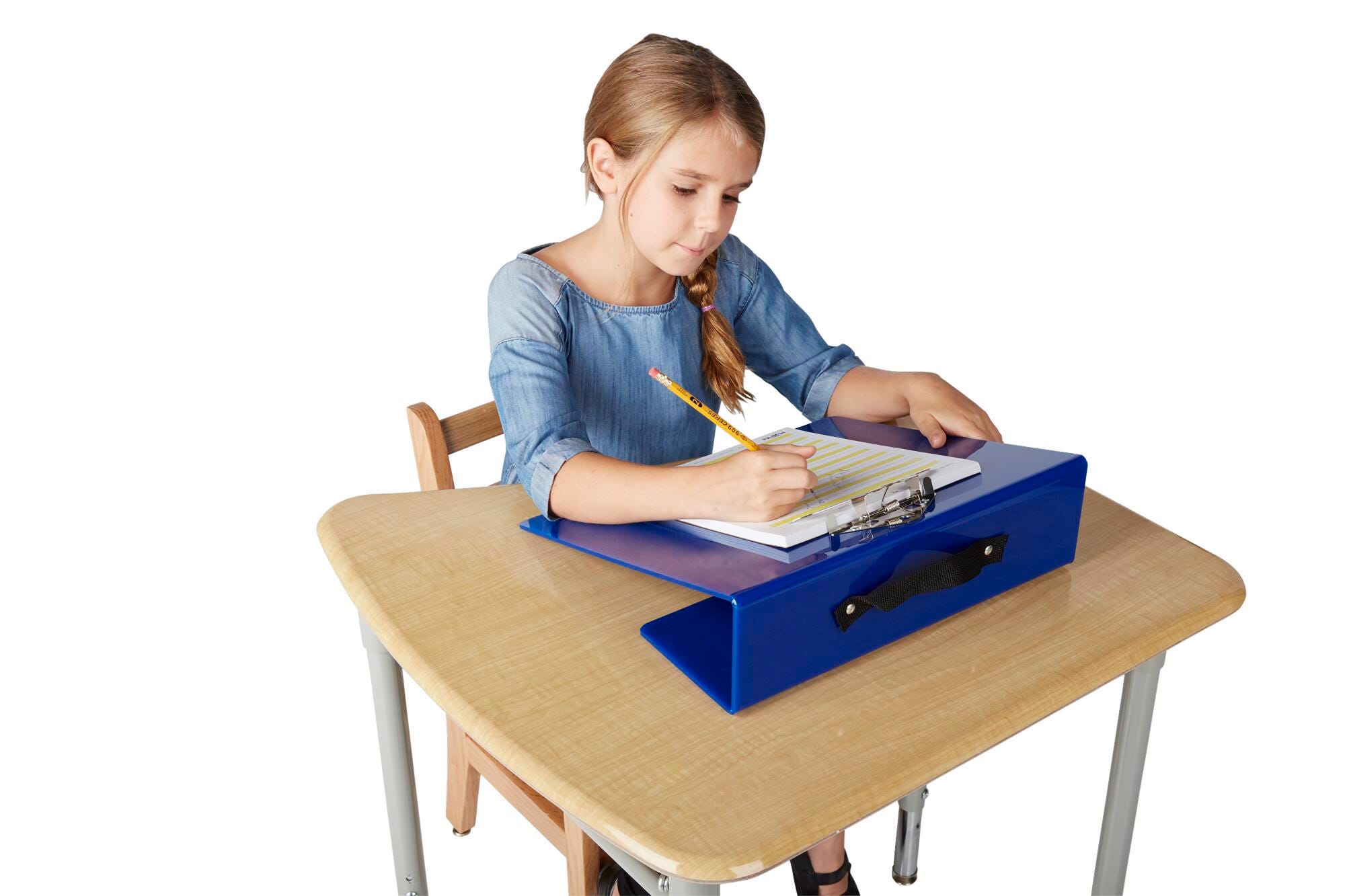 Working at an angle with a book or writing paper promotes the development of proper hand and wrist position for handwriting and fine motor skills, as well as good visual tracking. Features a low angle and is made of light weight Plexiglas. Encourages better posture and positioning for writing or reading. Slantboards measures 9 H x 14 W inches, with large metal clip to hold paper, and no slip discs to prevent sliding. Comes in Blue.