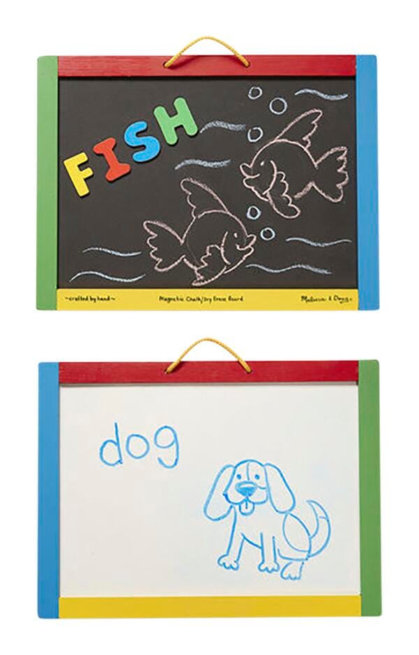 Your child can have twice as much fun with this double-sided activity board! The Melissa & Doug Magnetic Chalk & Dry-Erase Board features a magnetic chalkboard on one side and a dry-erase board on the other.