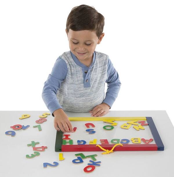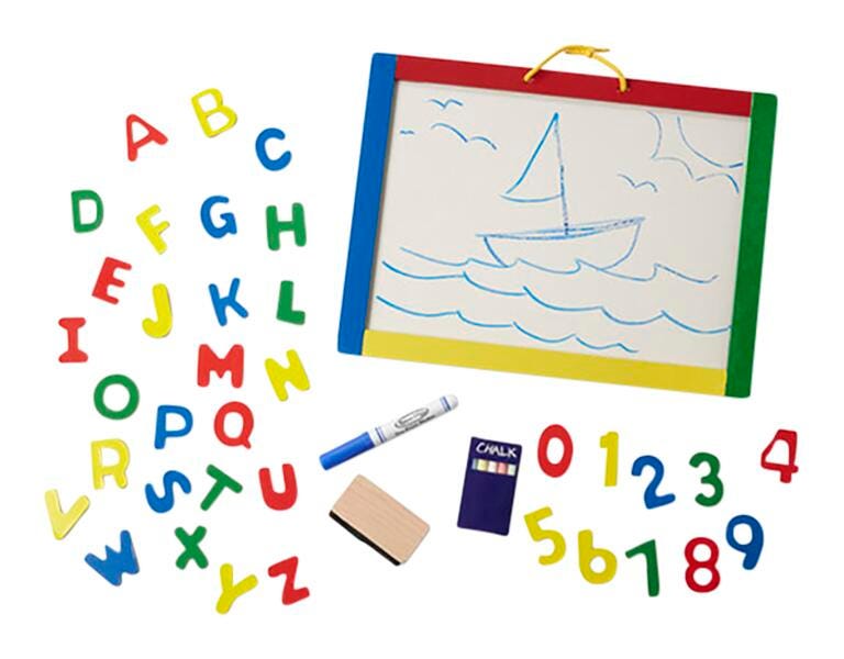Description One side is a dry-erase board, the other is a magnetic chalkboard. Whatever your artist's mood, this portable drawing board has the tools to express it! Comes with three sticks of colored chalk, a dry-erase marker, plus 36 magnetic letters and numbers.Features Double-sided art board has wooden frame with carry handle Includes chalk, dry-erase marker and eraser Makes a great gift for 3- to 8-year-olds, for hands-on, screen-free play Includes: Dry-erase/Chalkboard Combo, Three Sticks of Colored Chalk, Dry-Erase Marker, and 36 Magnetic Letters and Numbers