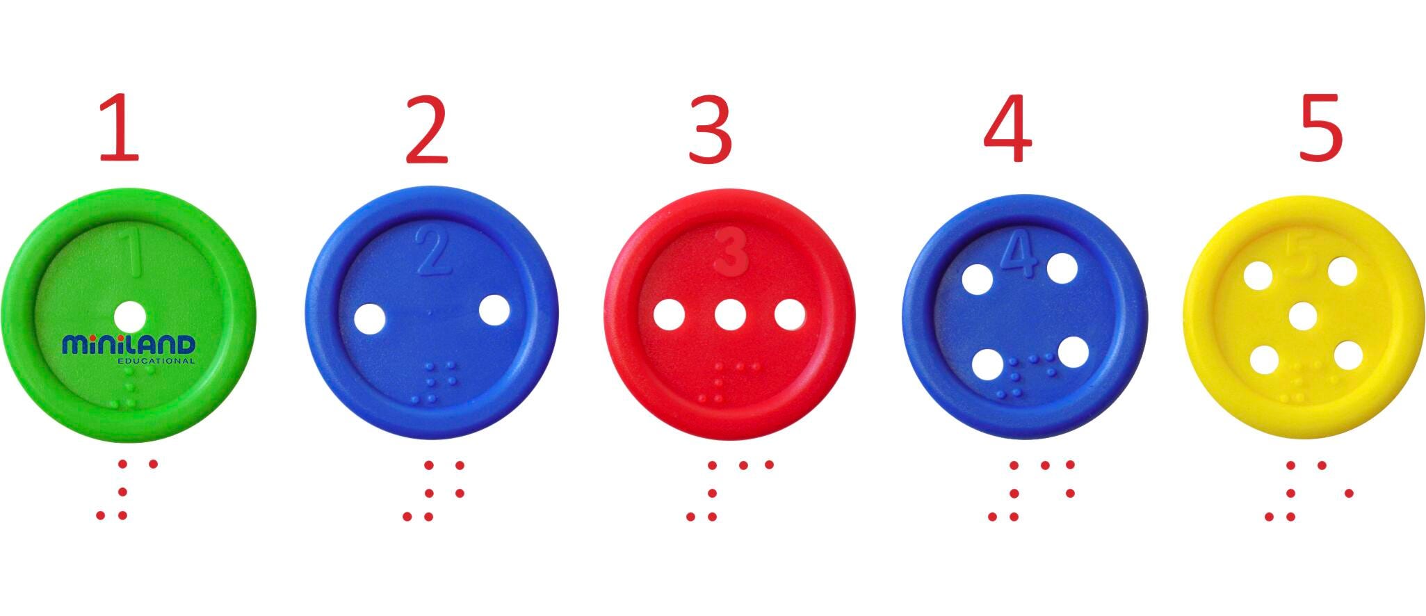 Description Ideal for sequencing and sorting as well as developing motor skills. Each button has a number in relief and its equivalent Braille symbol. The set includes individual activity worksheets and 10 long laces. Aids in the core curriculum for the visually impaired, who use tactile channels for learning. Visually impaired students can learn to count with these raised-line symbols and to read braille numbers.Features Large, brightly colored buttons are great for sequencing, sorting, and color and number recognition Each button has between 1 and 5 holes with the corresponding number written as a numeral and in braille Includes: 140 Buttons Activity Cards 10 Laces Storage Container